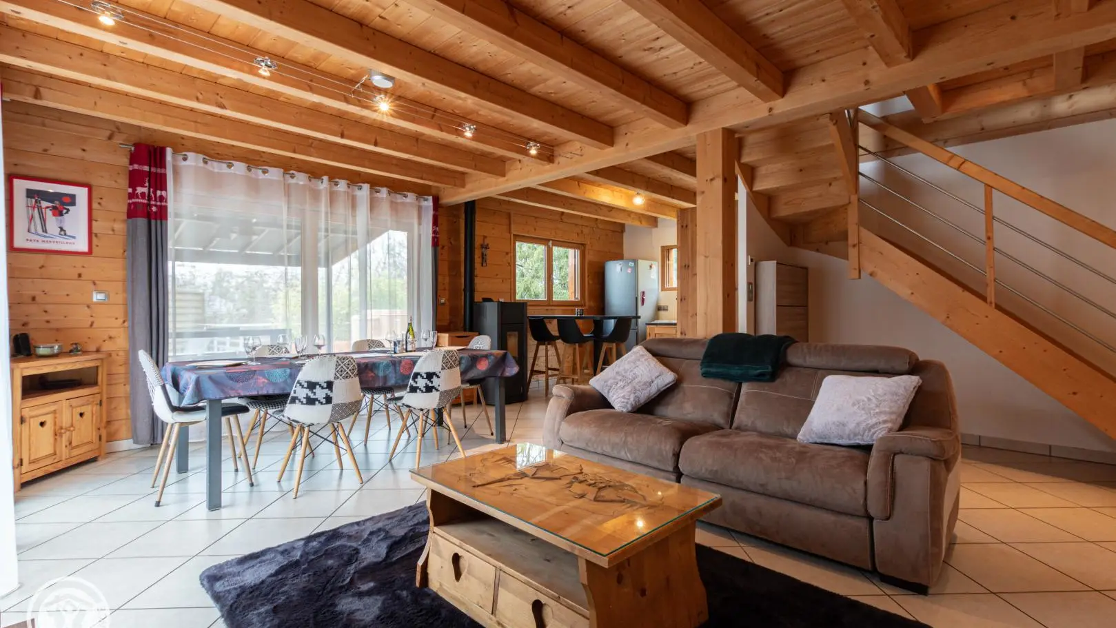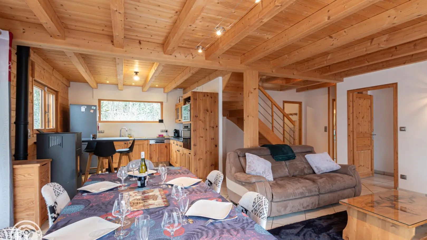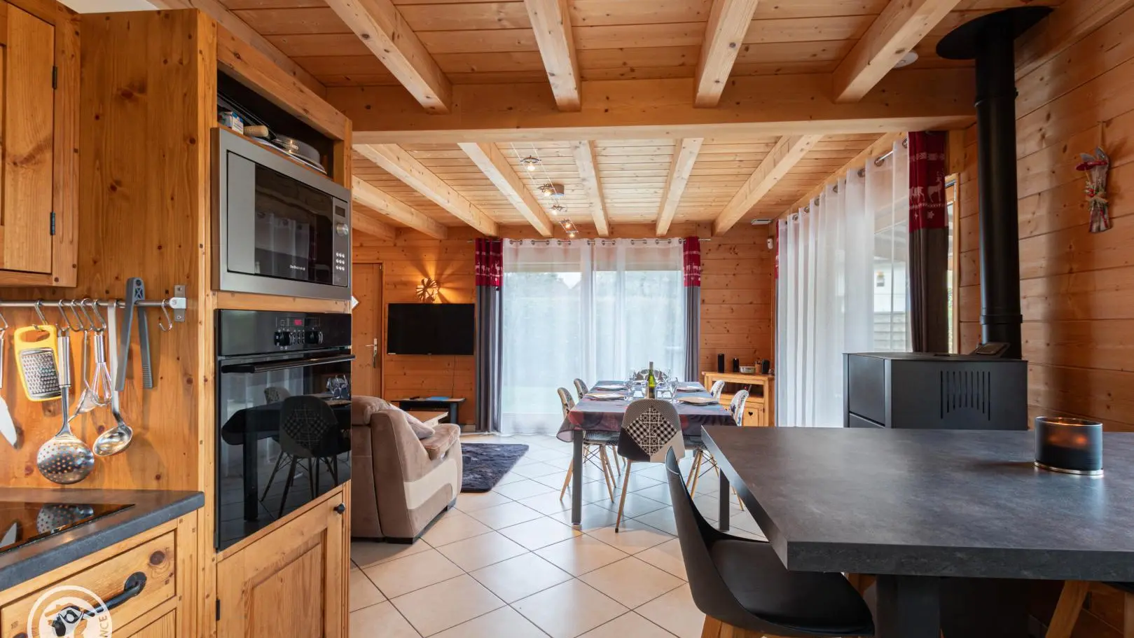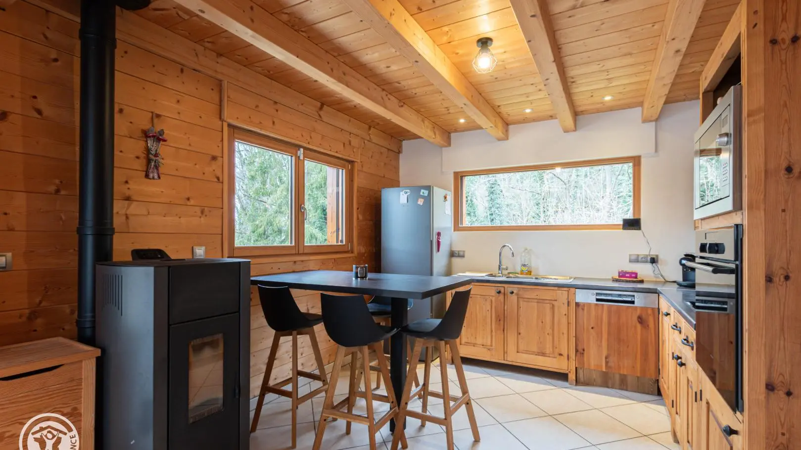Chalet de 93 m² (plus garage) comprenant au rez-de-chaussée la pièce de vie principale avec cuisine intégrée ouverte sur le séjour (TV murale connectée incluant Canal+, poêle à bois, 2 espaces repas).