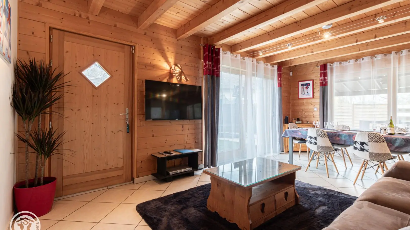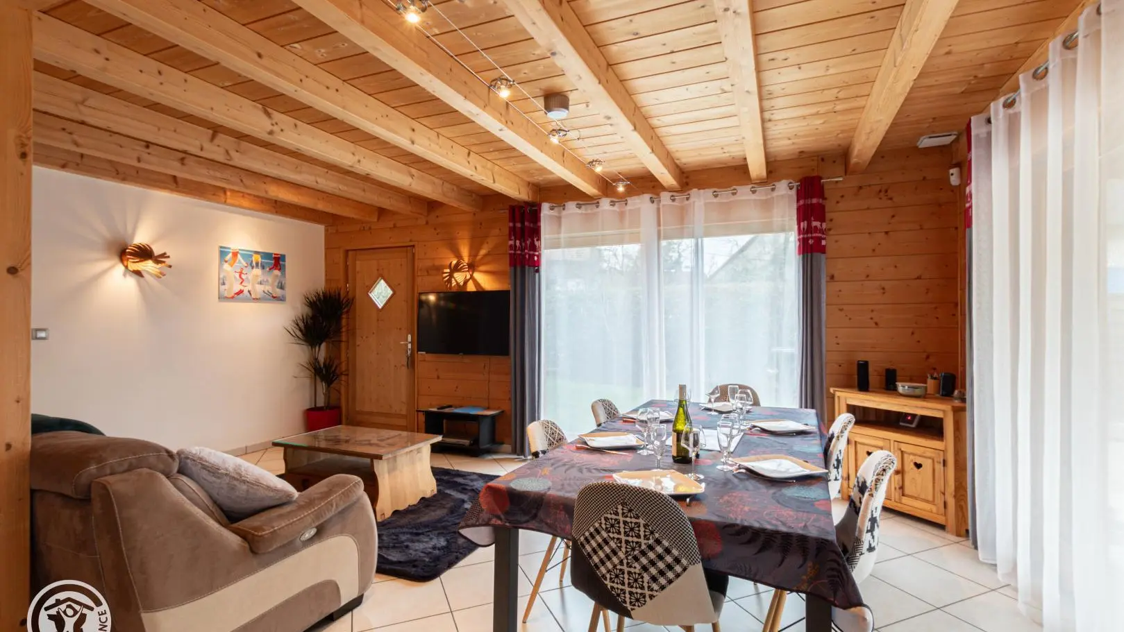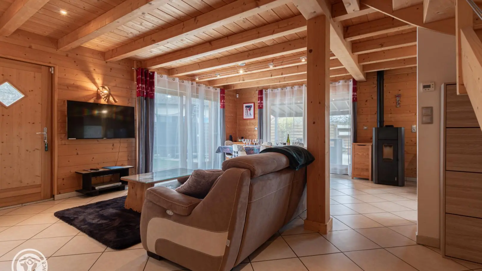 Chalet de 93 m² (plus garage) comprenant au rez-de-chaussée la pièce de vie principale avec cuisine intégrée ouverte sur le séjour (TV murale connectée incluant Canal+, poêle à bois, 2 espaces repas).