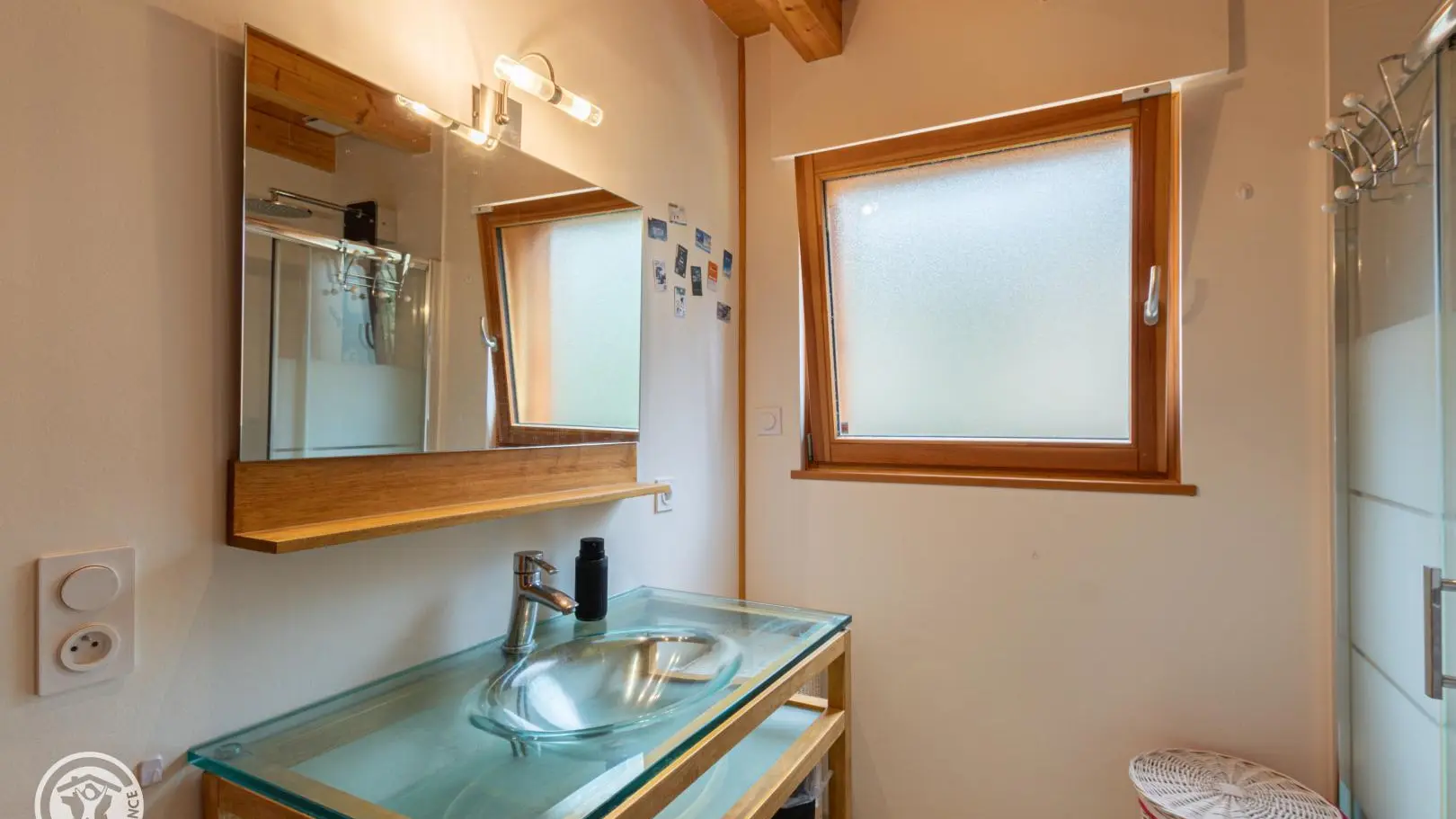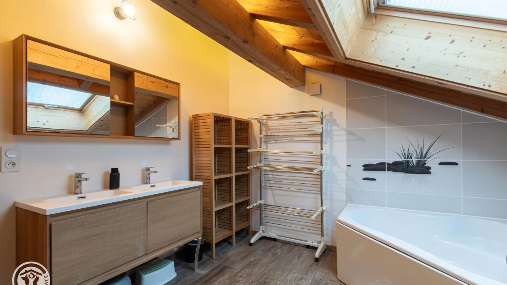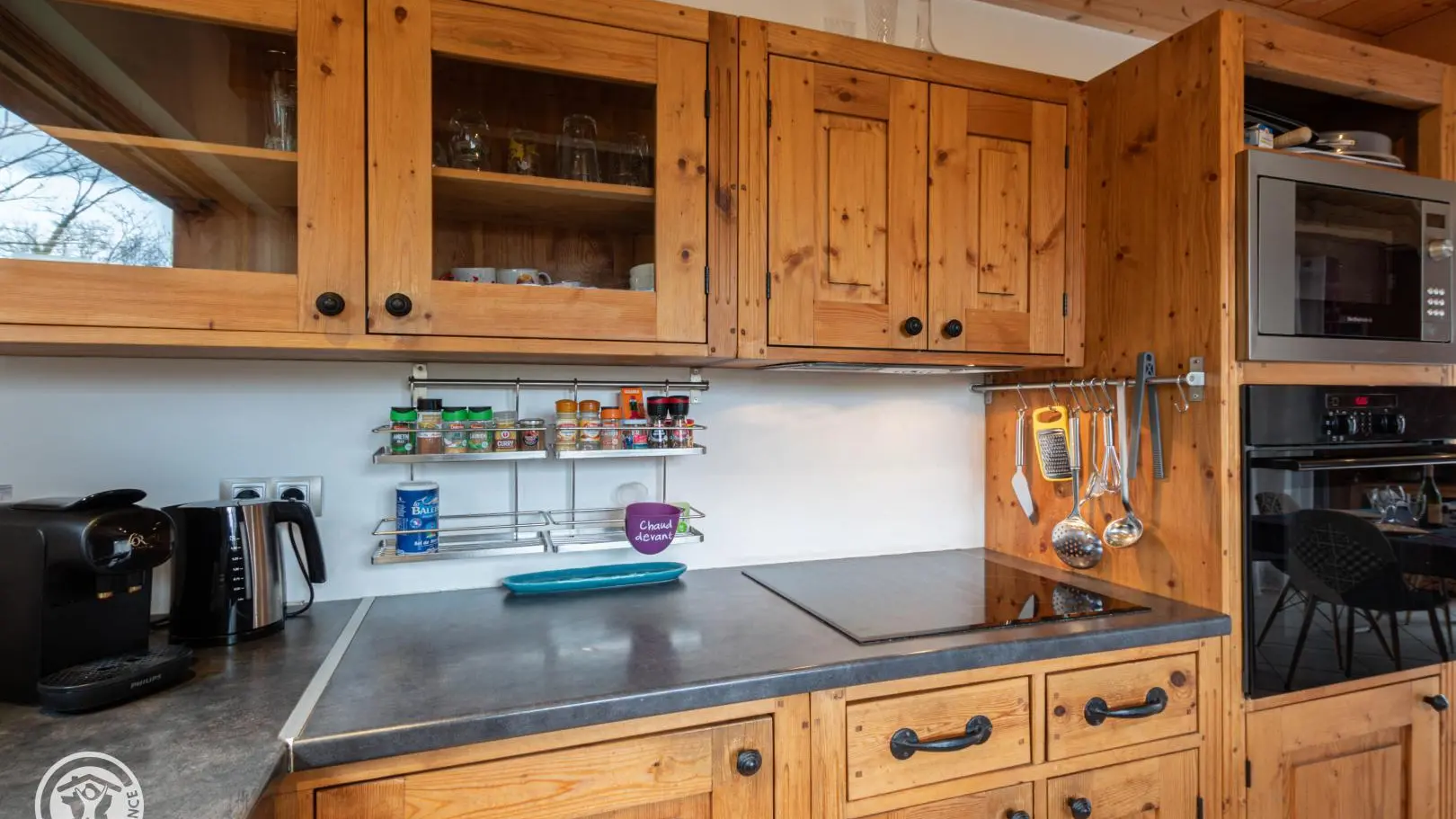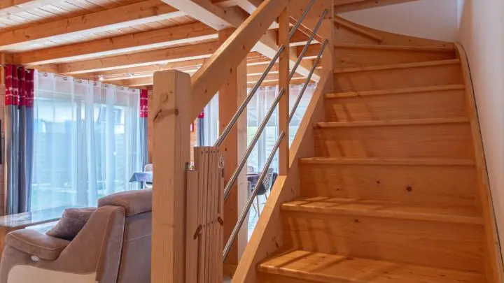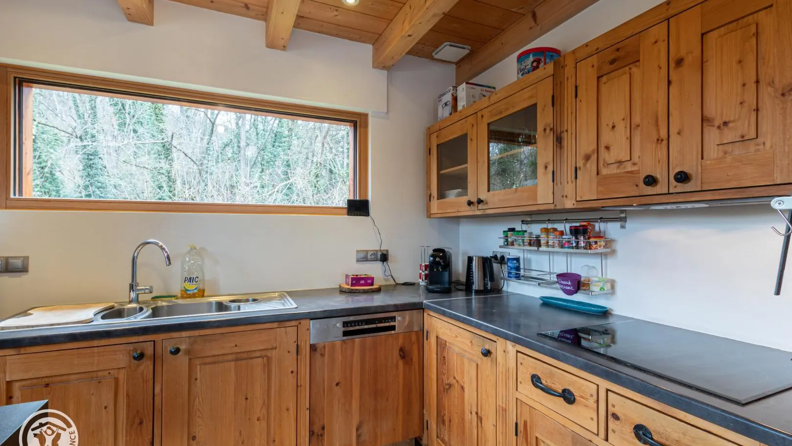 Chalet de 93 m² (plus garage) comprenant au rez-de-chaussée la pièce de vie principale avec cuisine intégrée ouverte sur le séjour (TV murale connectée incluant Canal+, poêle à bois, 2 espaces repas).