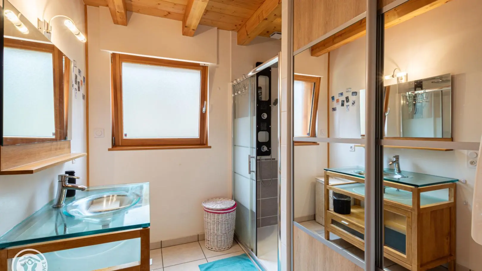 A l'étage, accès chambre 2 (lit 160x200 et bureau) et chambre 3 (2 lits 80x200 jumelables + 1 lit de 90x200). Seconde salle de bain (baignoire, double-vasque, WC).