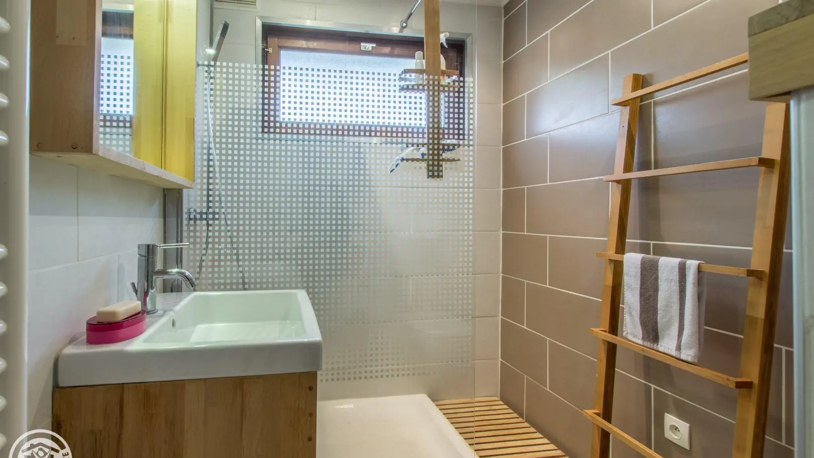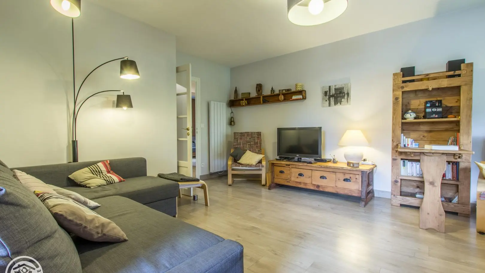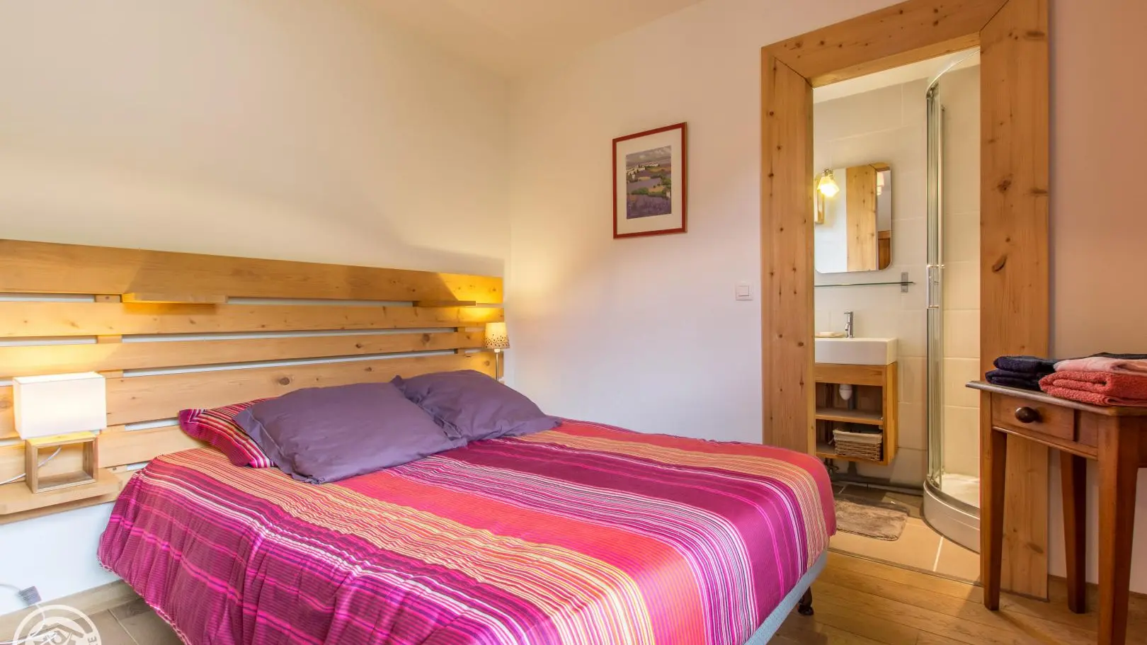 Dans le gîte: couloir de distribution, pièce de vie avec cuisine intégrée ouverte sur séjour (Tv, canapé), chambre 1 (1 lit 160x200cm), chambre 2 (1 lit 140x190cm, salle d'eau privative avec douche), chambre 3 (2 lits 90x190cm superposés, clic-clac), salle d'eau indépendante (douche, wc), wc indépendant.