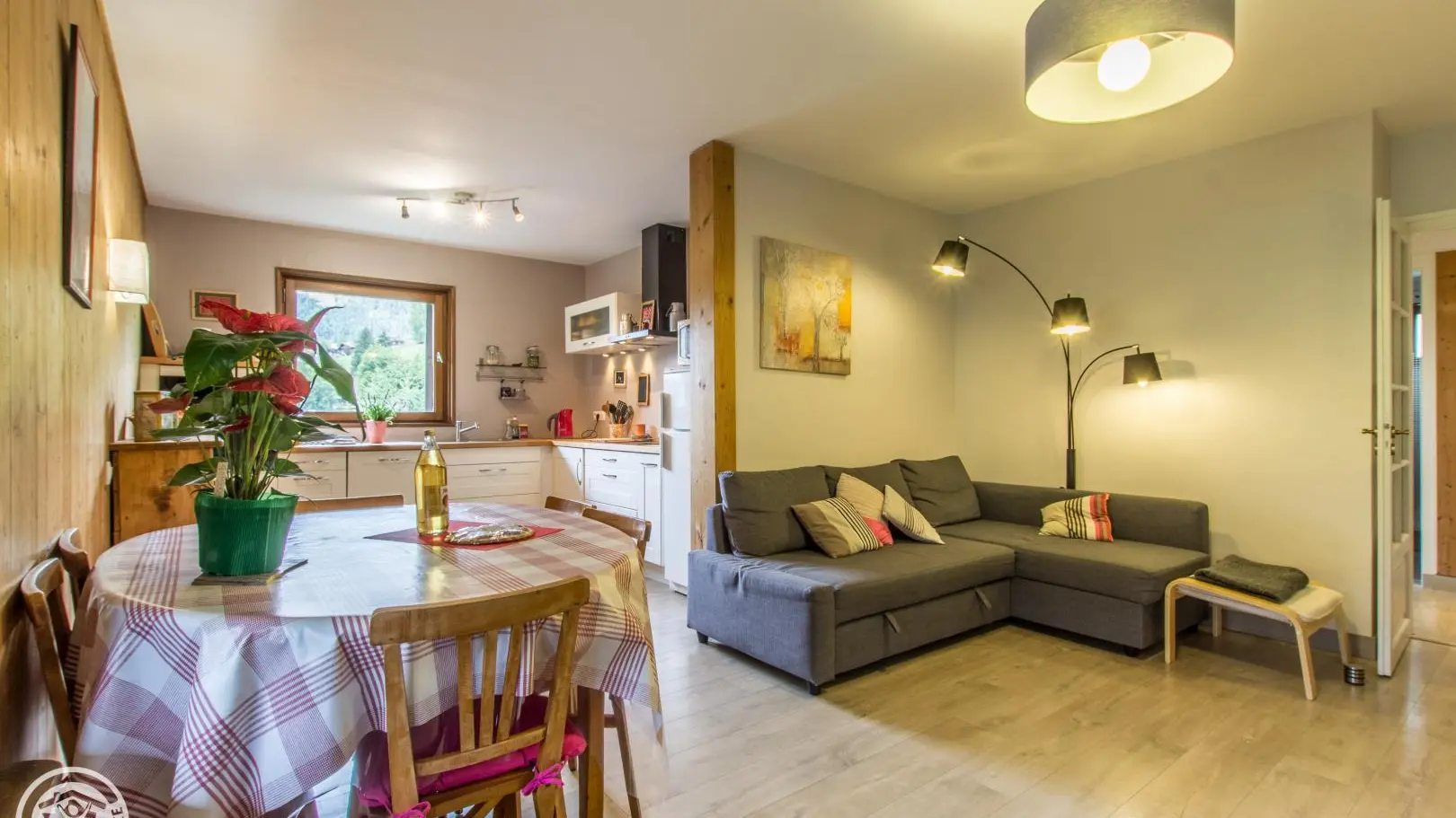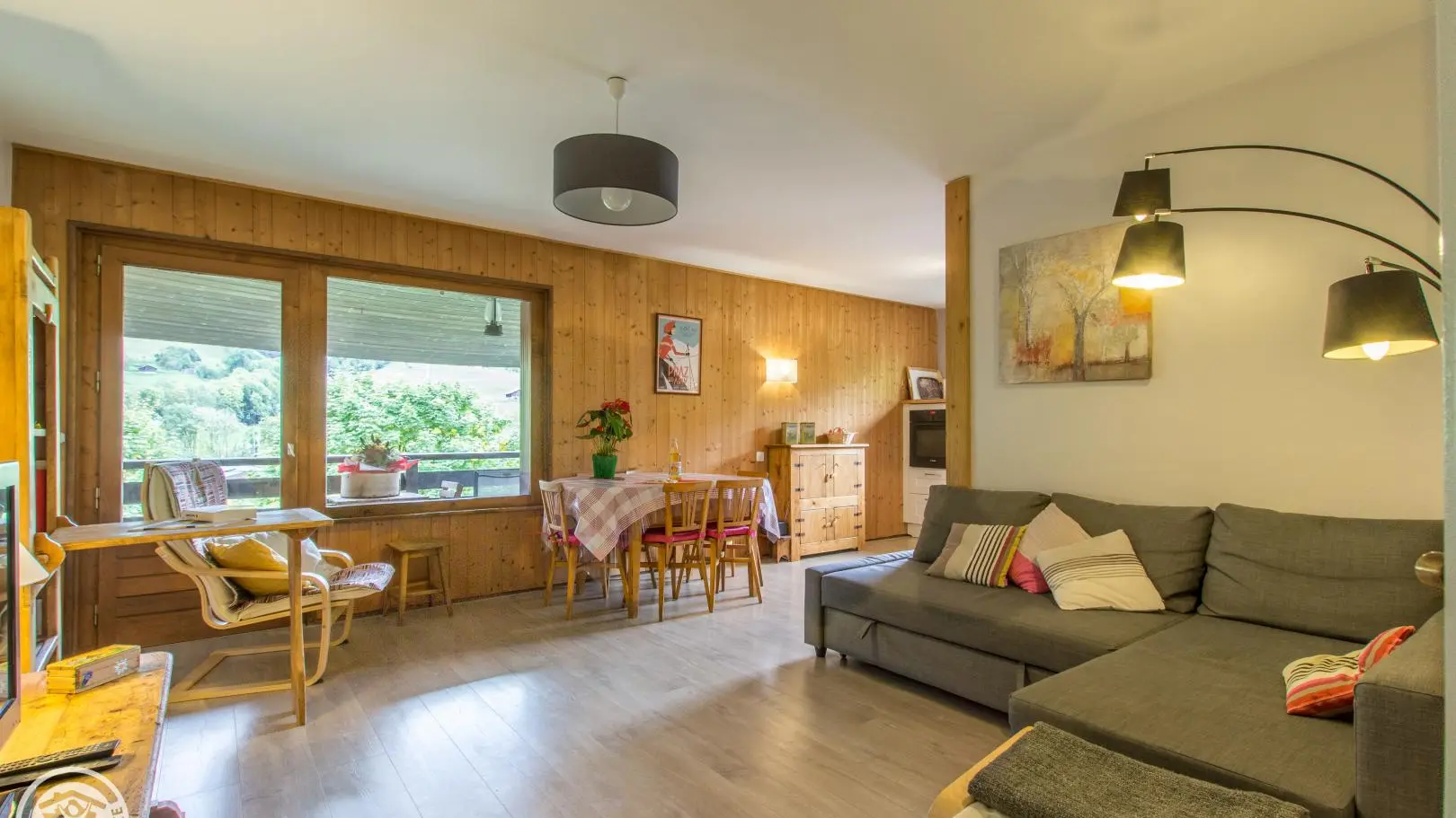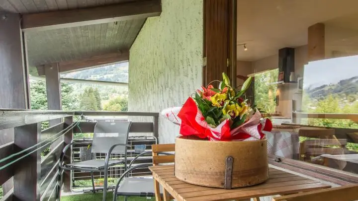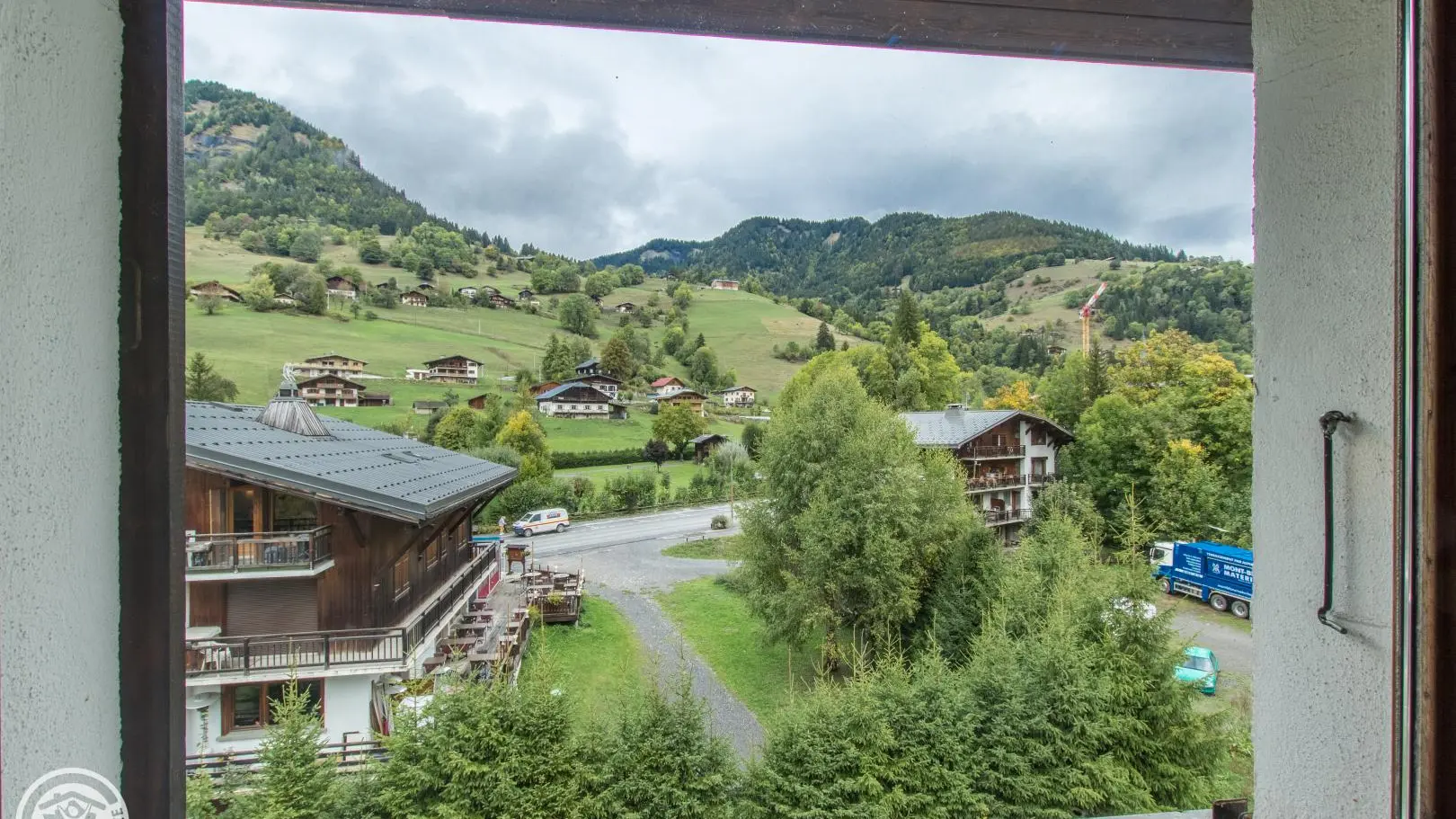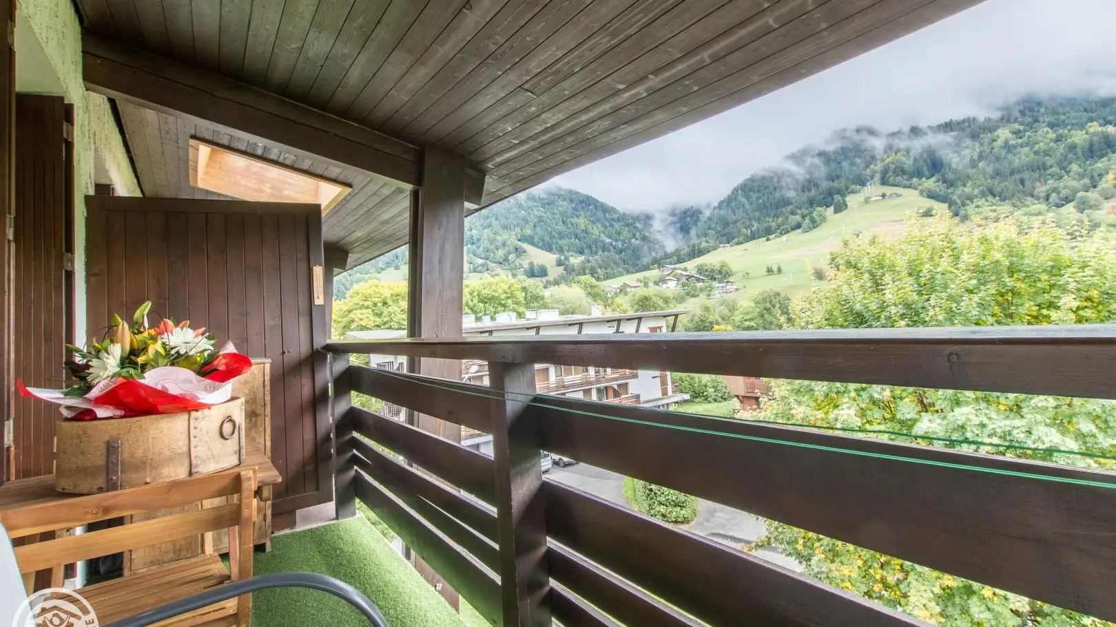 Pour votre confort tout est inclus : draps (lits faits), serviettes de toilette et ménage de fin de séjour. Balcon Sud avec une petite table et chaises, offrant une belle vue dégagée sur le domaine skiable et le Mont Charvin.