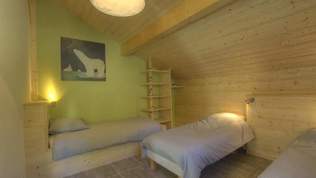 A l'étage: coin salon avec Tv et canapé-futon, chambre 1 (1 lit 160x200cm), Chambre 2 (1 lit 90x200cm + 2 lits 80x200cm jumelables en lit 160x200cm), wc.