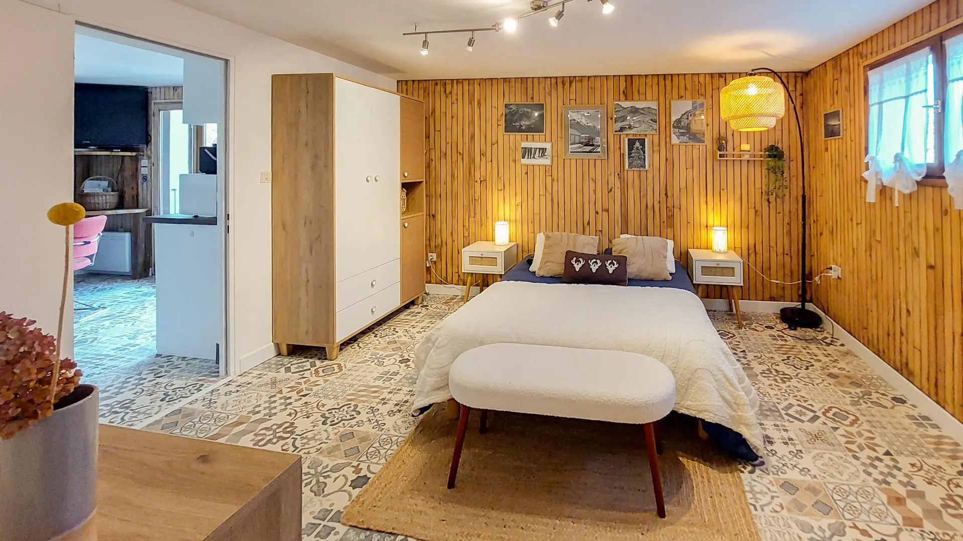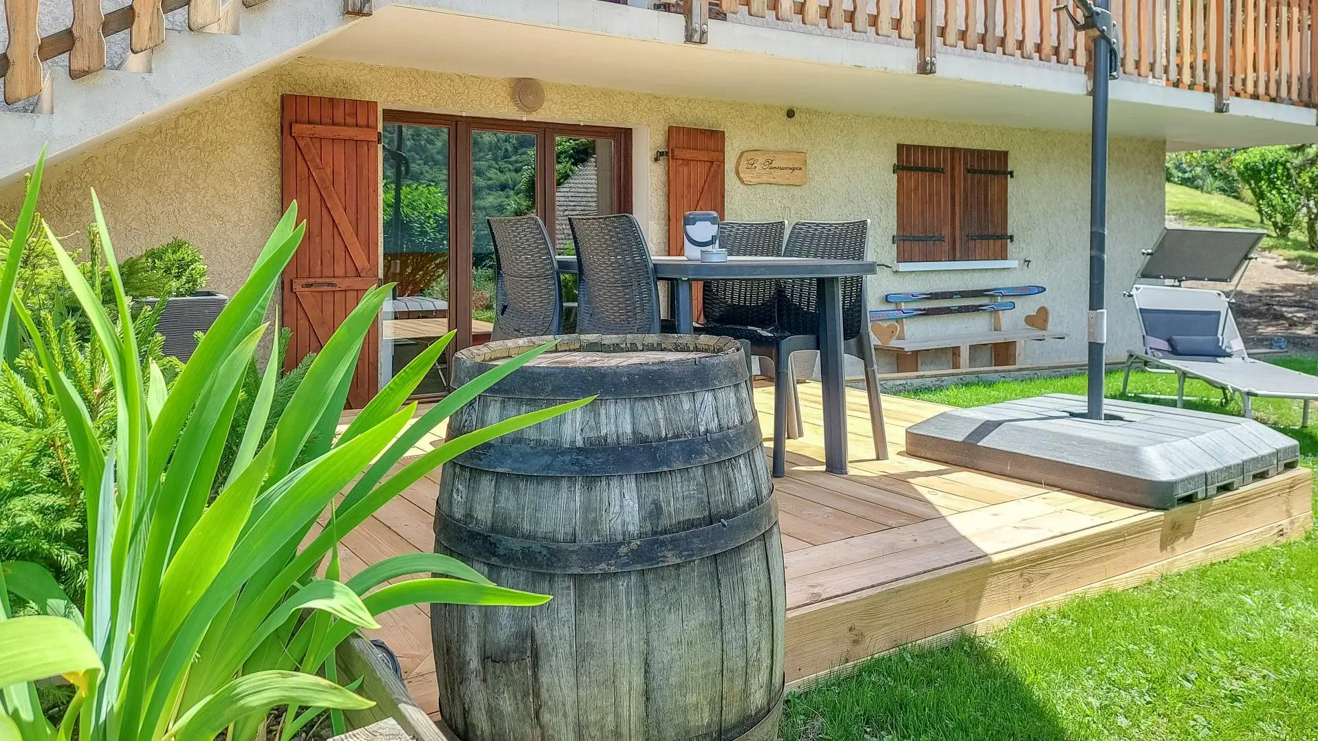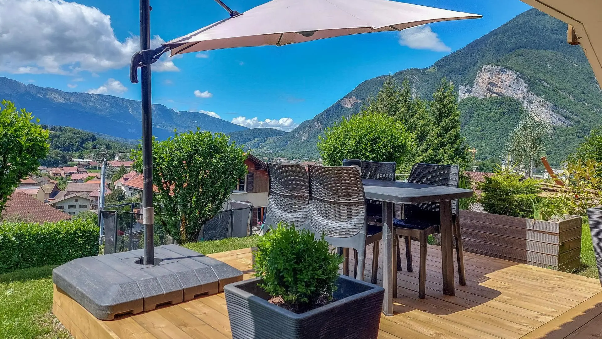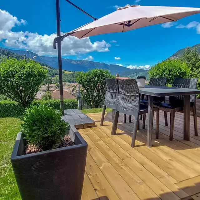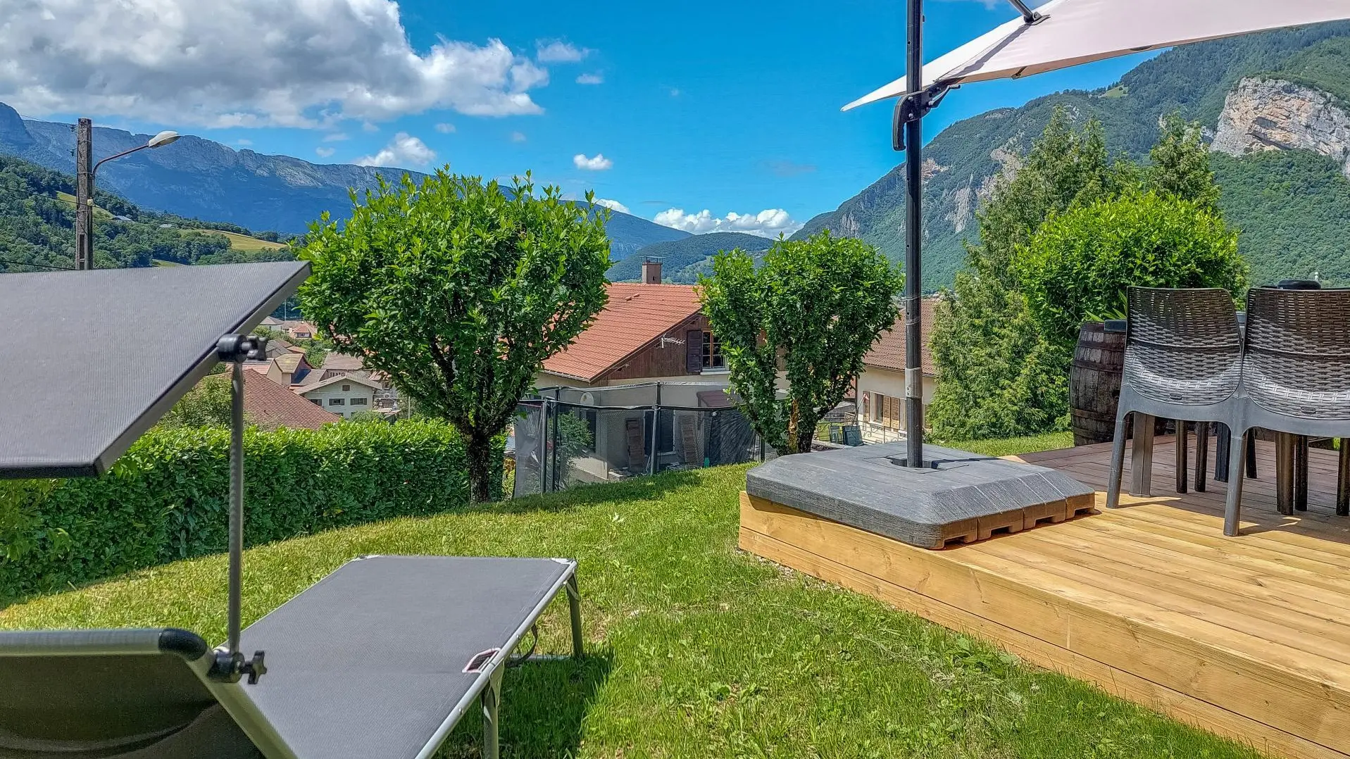 Gîte de 32m² situé au rez-de-jardin de la maison des propriétaires, accès indépendant depuis le stationnement situé dans l'entrée, avec portail en commun. Entrée par la pièce de vie comprenant une cuisine équipée avec table pour 4, séjour un canapé convertible 140x190 cm, TV murale. Chambre avec lit 140 x 190 cm, placard/penderie et bureaux. Accès à la salle d'eau depuis la chambre. Terrasse aménagée située devant le gîte avec table de repas, parasol, transats. Vue sur le château de Faverges et montagnes environnantes. Espace du jardin arboré privatisé qui surplombe la ville de Faverges.
