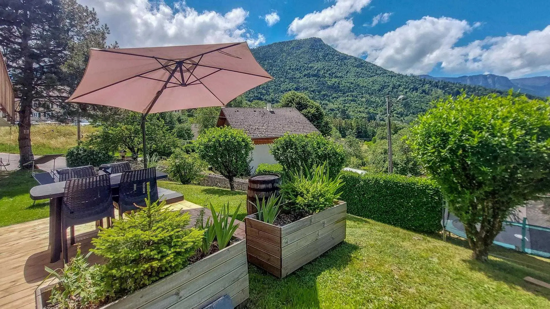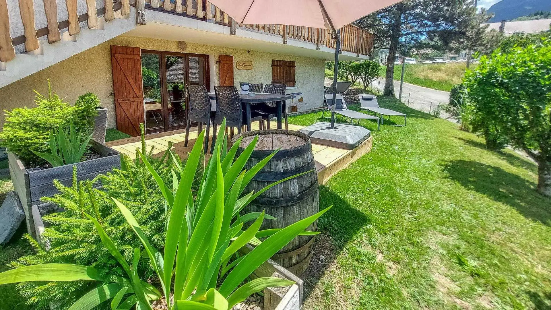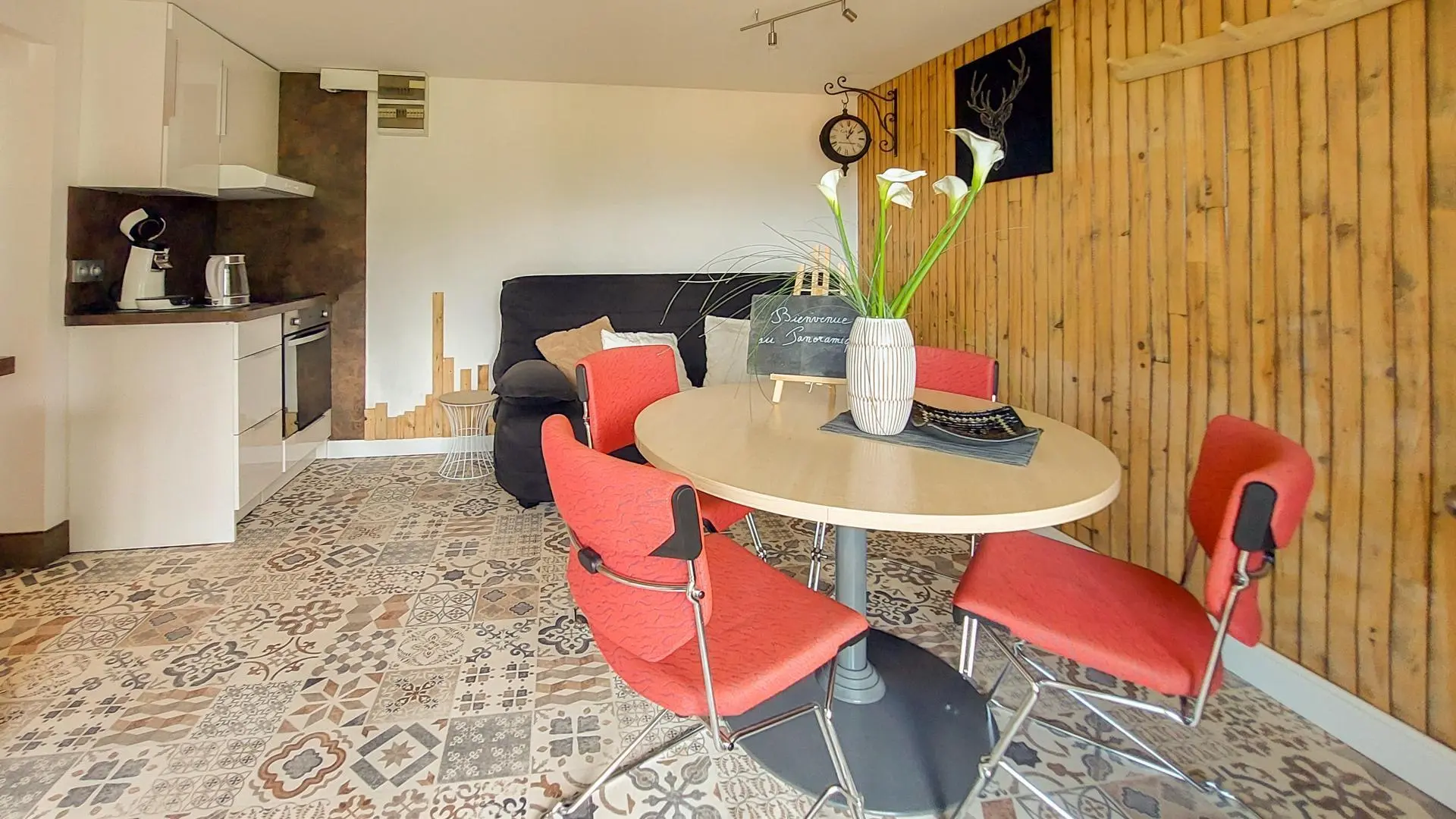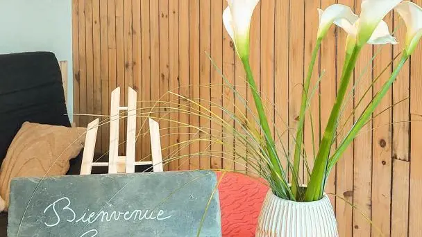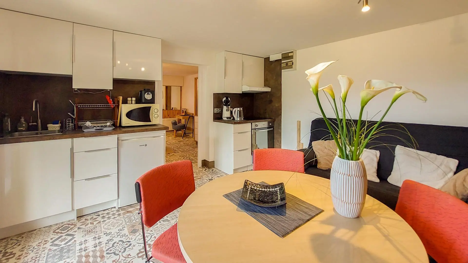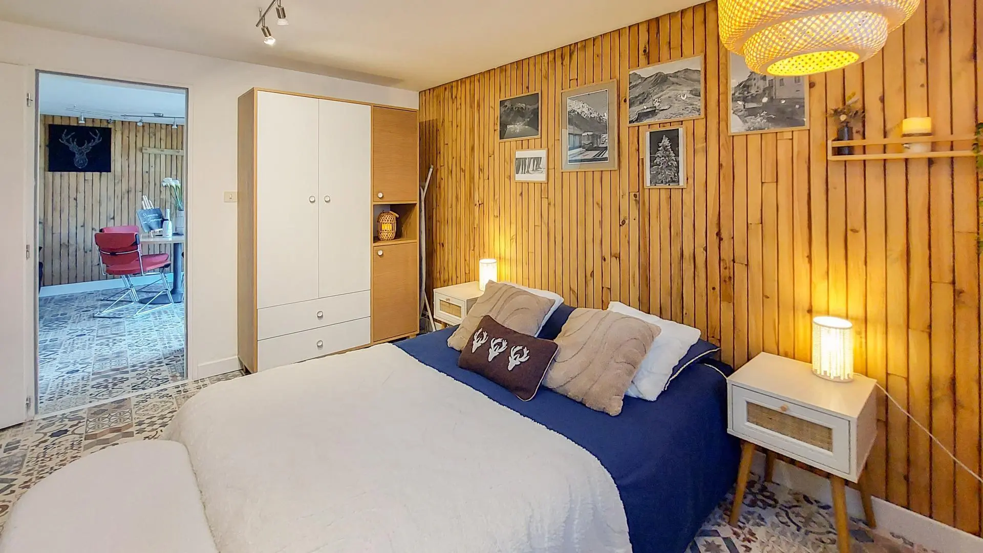 Gîte de 32m² situé au rez-de-jardin de la maison des propriétaires, accès indépendant depuis le stationnement situé dans l'entrée, avec portail en commun. Entrée par la pièce de vie comprenant une cuisine équipée avec table pour 4, séjour un canapé convertible 140x190 cm, TV murale. Chambre avec lit 140 x 190 cm, placard/penderie et bureaux. Accès à la salle d'eau depuis la chambre. Terrasse aménagée située devant le gîte avec table de repas, parasol, transats. Vue sur le château de Faverges et montagnes environnantes. Espace du jardin arboré privatisé qui surplombe la ville de Faverges.