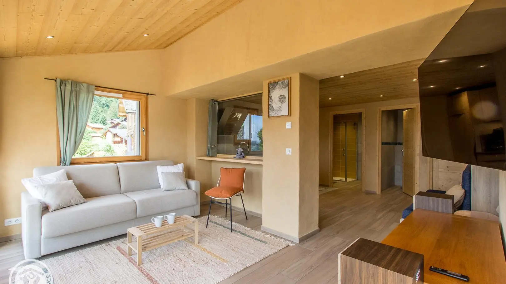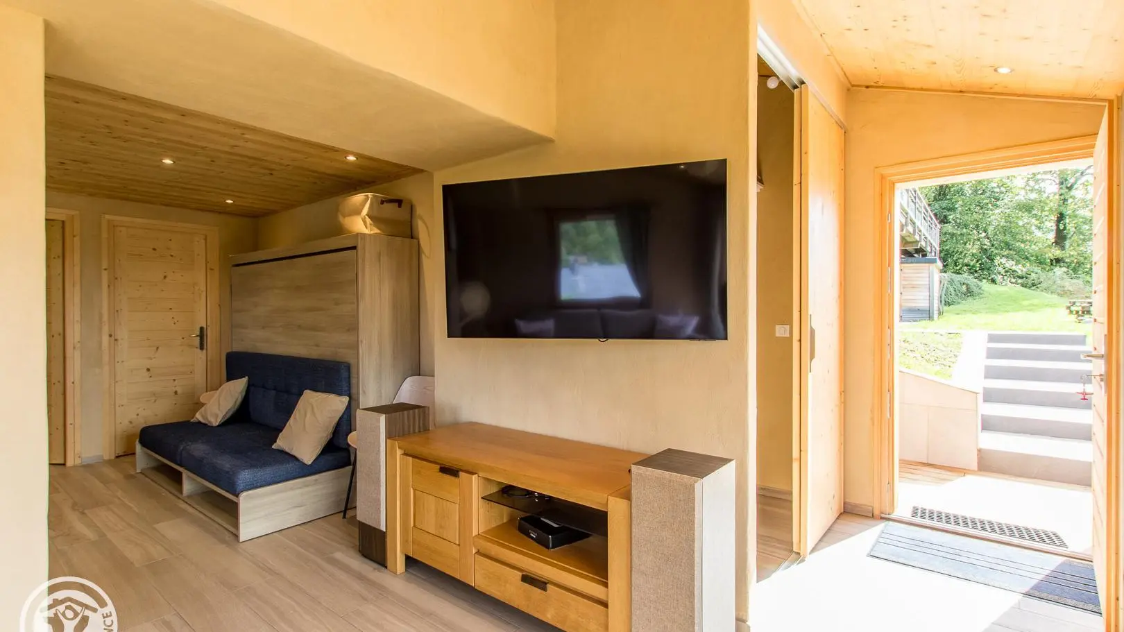 - Salon/coin nuit semi-ouvert sur cuisine (grande Tv, canapé convertible rapido offrant un très bon couchage grande dimension 160x200cm).