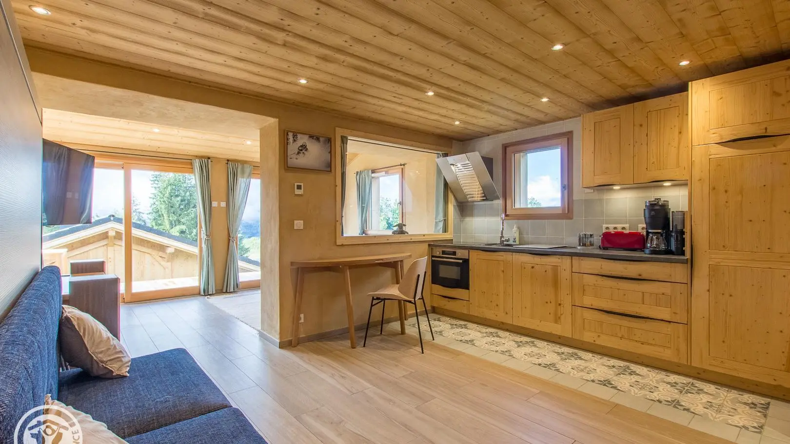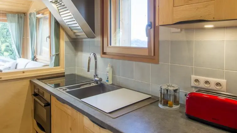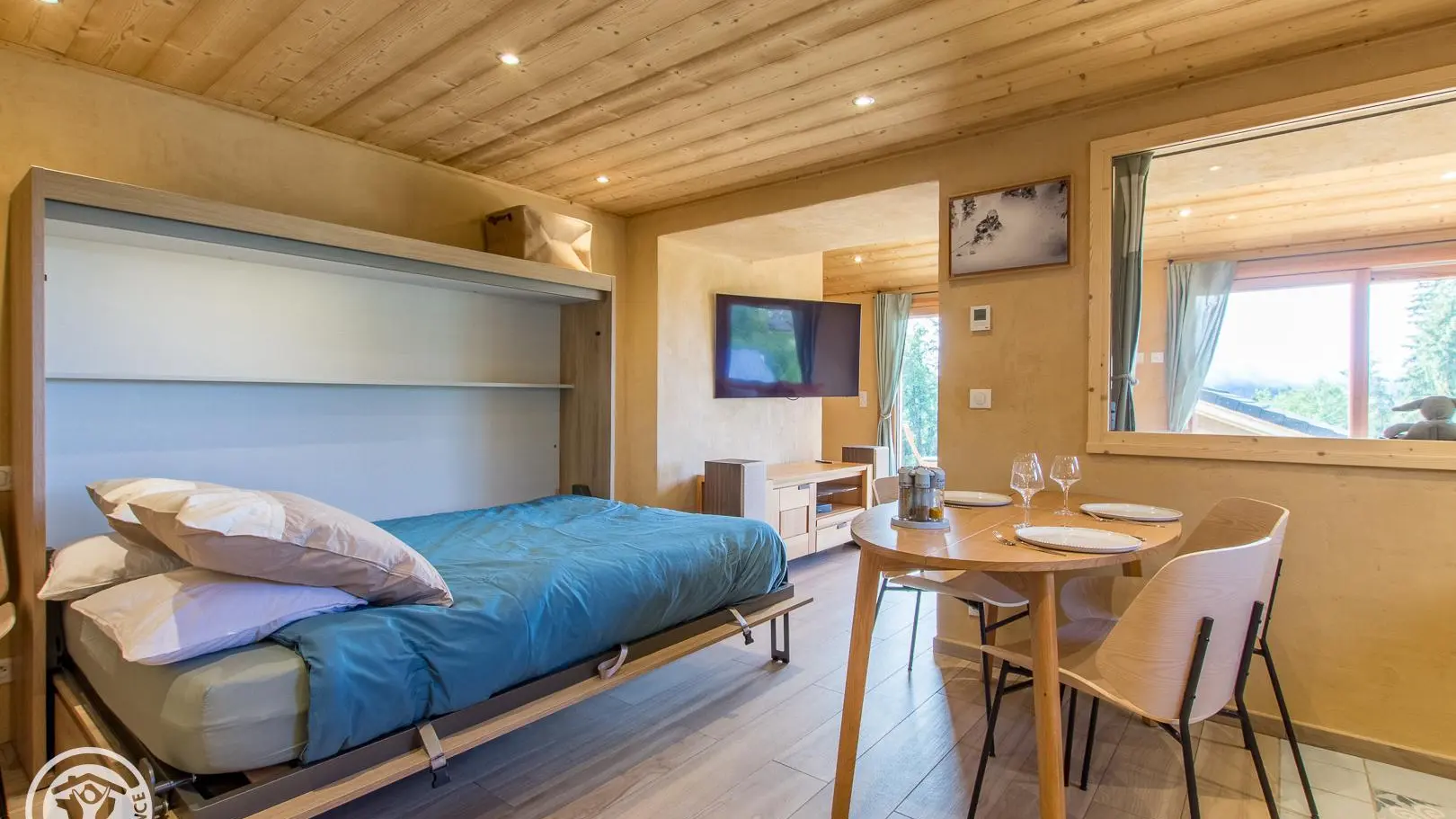 - Cuisine intégrée semi-ouverte sur salon/coin nuit (table de repas, lit escamotable d'appoint offrant un couchage 140x200cm).