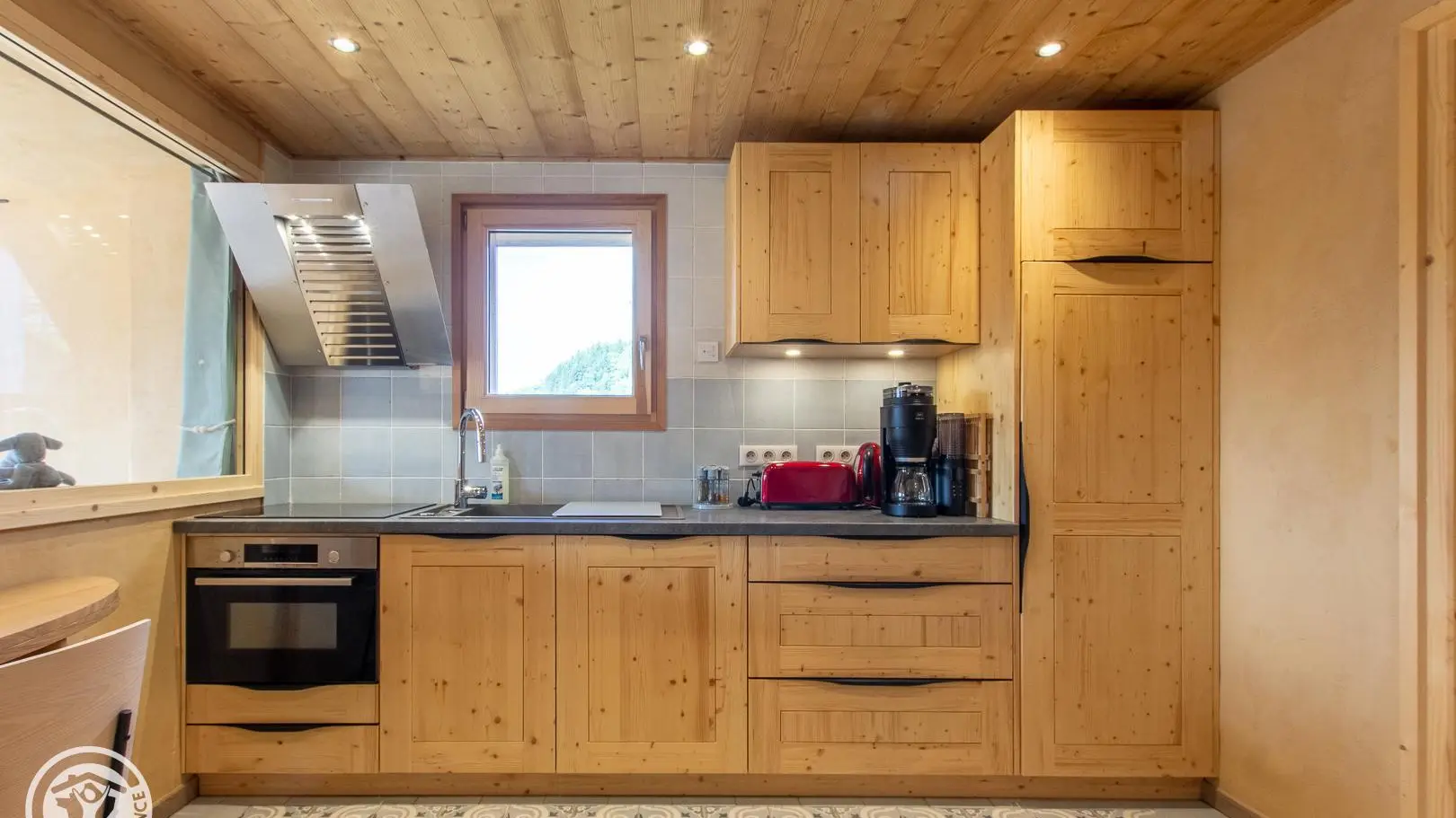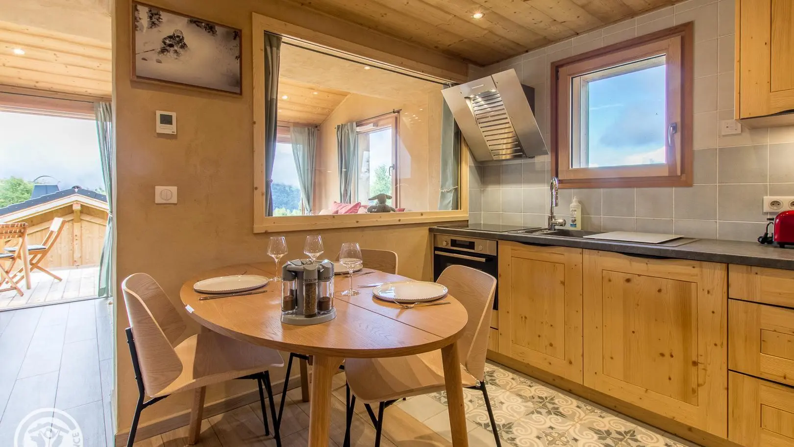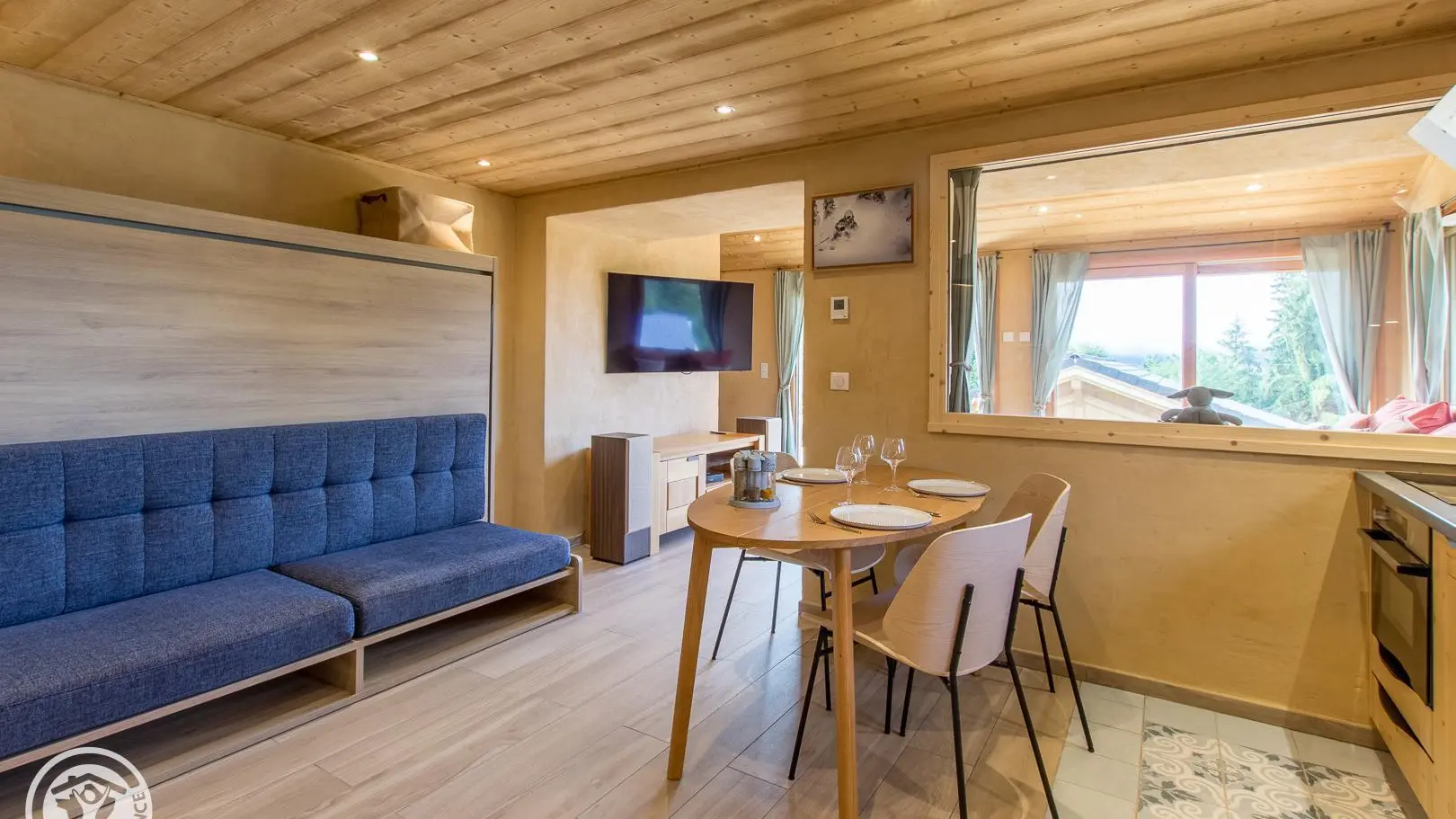 - Cuisine intégrée semi-ouverte sur salon/coin nuit (table de repas, lit escamotable d'appoint offrant un couchage 140x200cm).