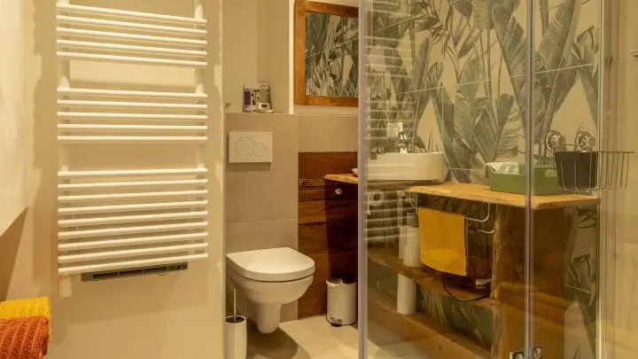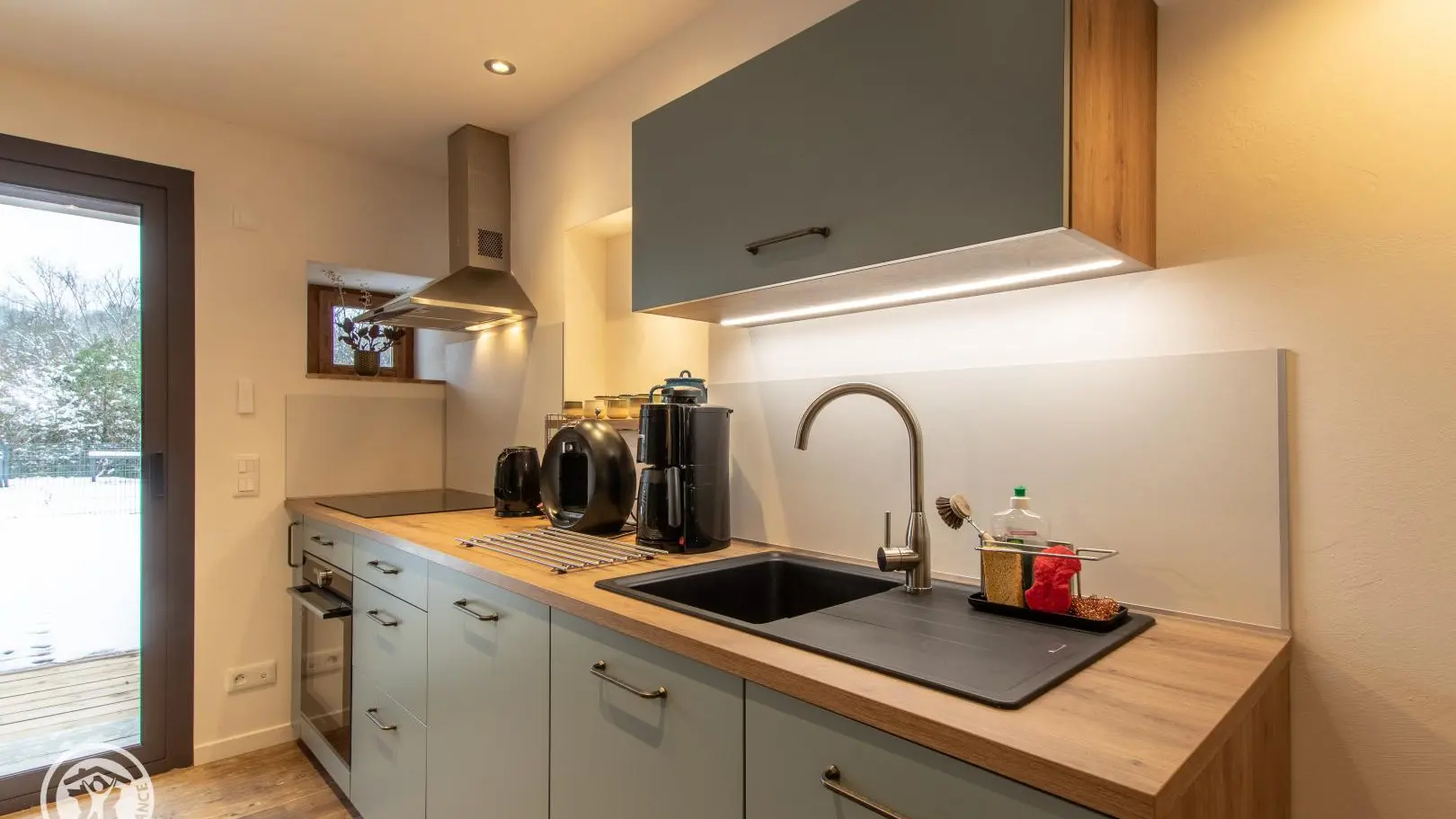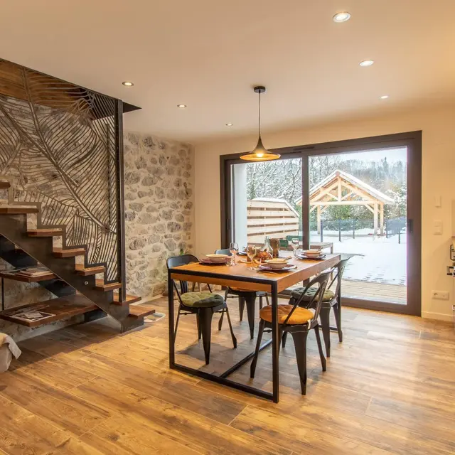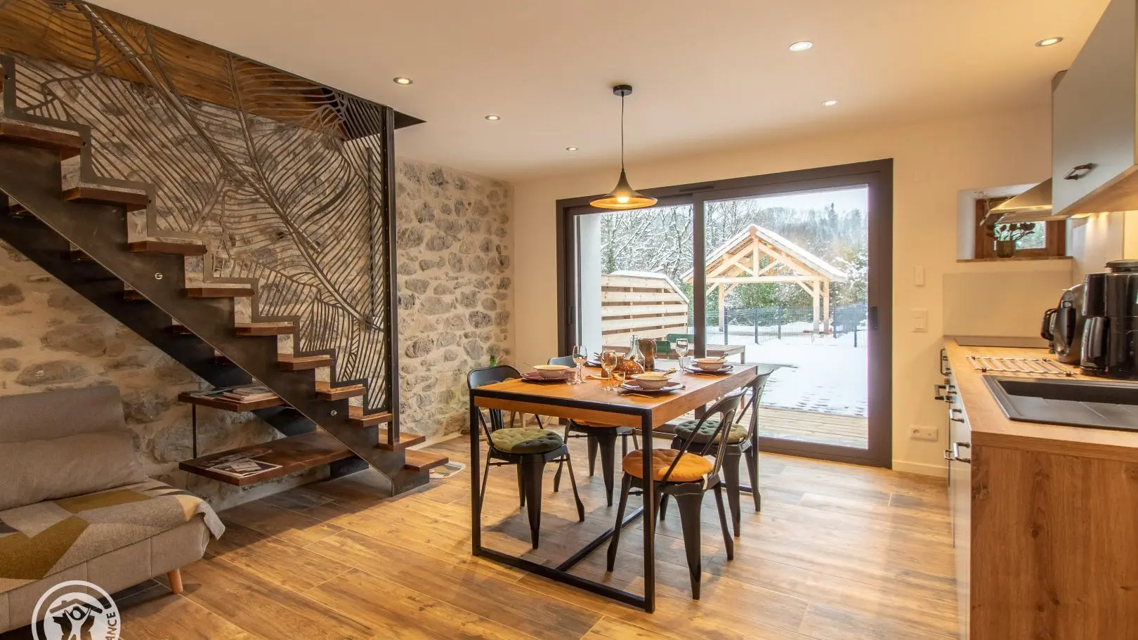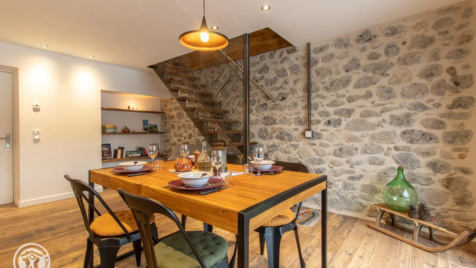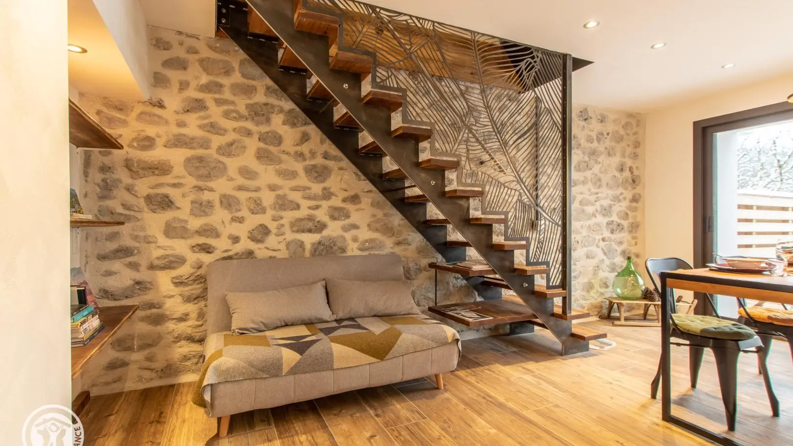 Gîte de 38 m² sur deux étages, dans une ancienne bâtisse du 19ème siècle transformée en 2023 en copropriété de 7 logements. Appartement situé au rez-de-jardin, accès possible de plain-pied. Entrée sur pièce de vie composée d'un salon (canapé convertible, TV sur meuble) et d'une cuisine ouverte. Accès à la terrasse/pelouse privative par baie vitrée.