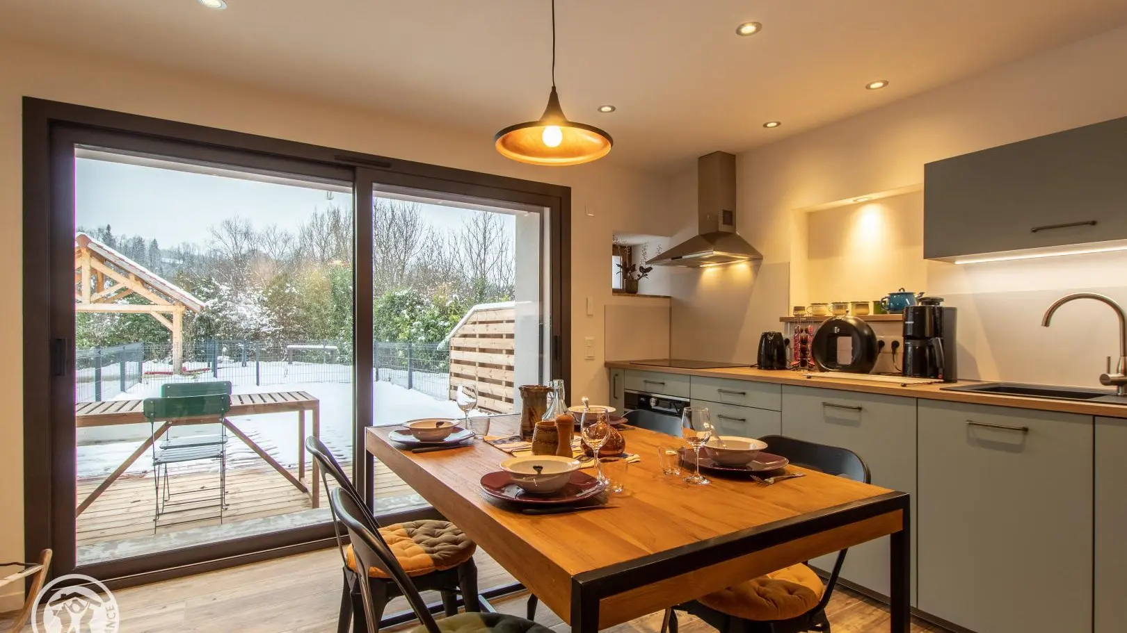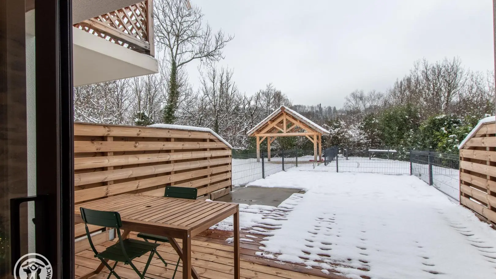 Buanderie privative (avec lave-linge, congélateur) située à l'extérieur, accessible immédiatement à côté de l'entrée du logement. Cave disponible pour rangement vélo/skis. Équipement bébé disponible sur demande (chaise haute, lit).