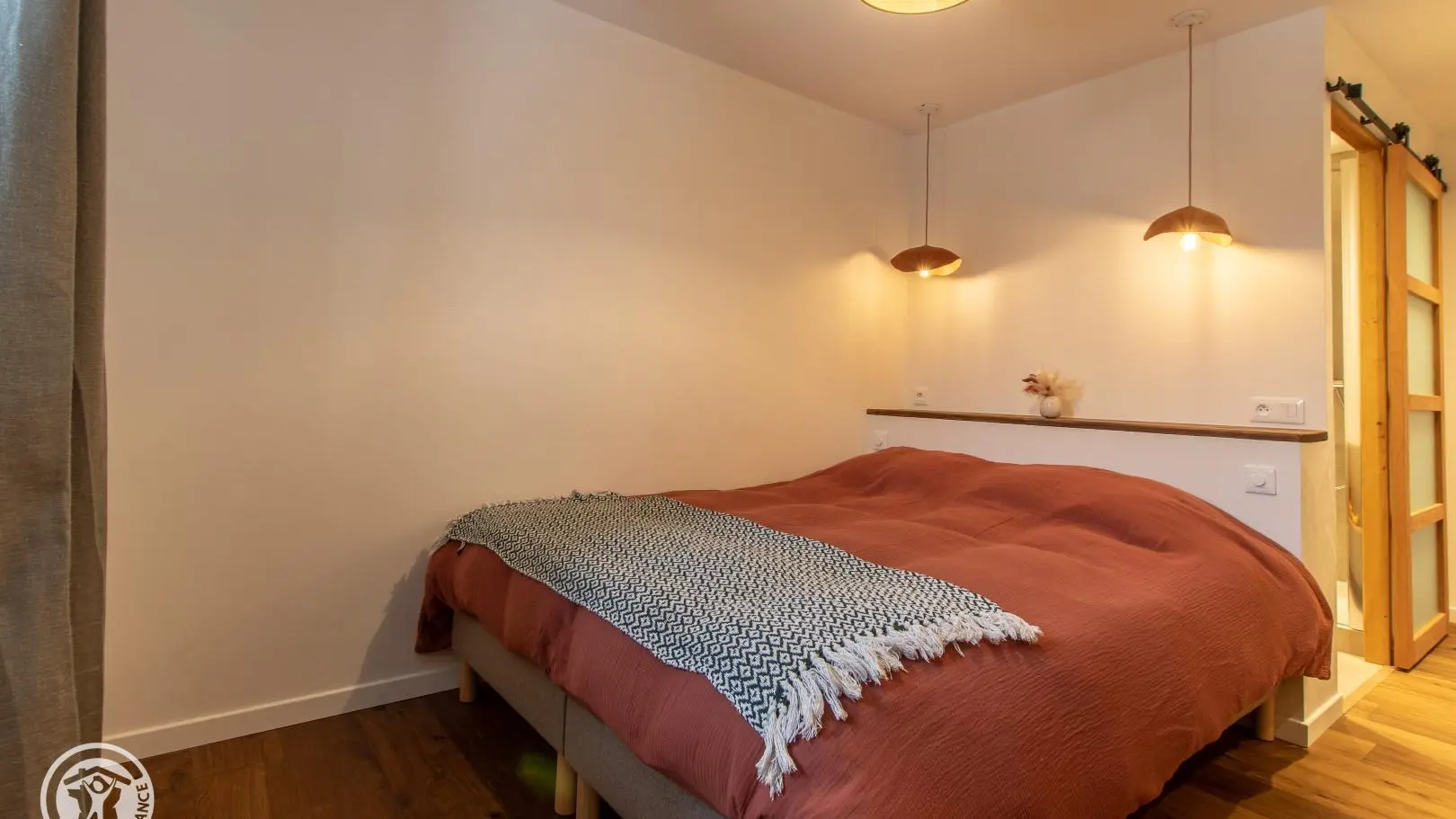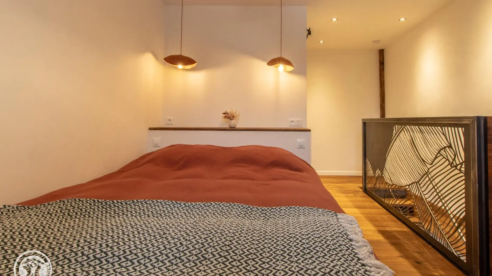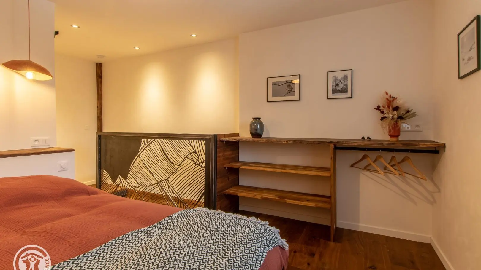Escalier d'accès à l'étage composé intégralement par une chambre (lit 160x200 cm) et la salle d'eau (douche, vasque sur meuble, WC).