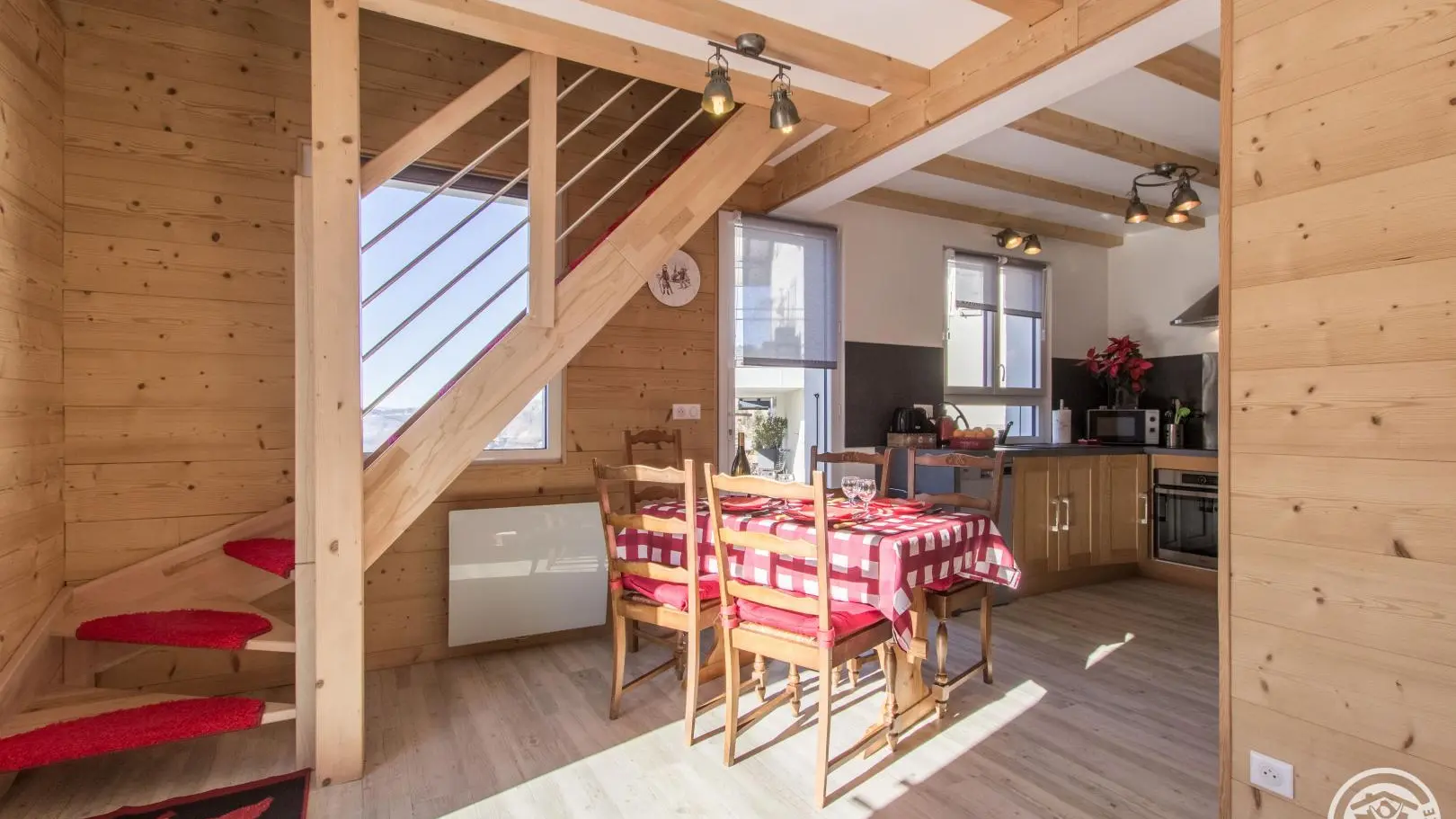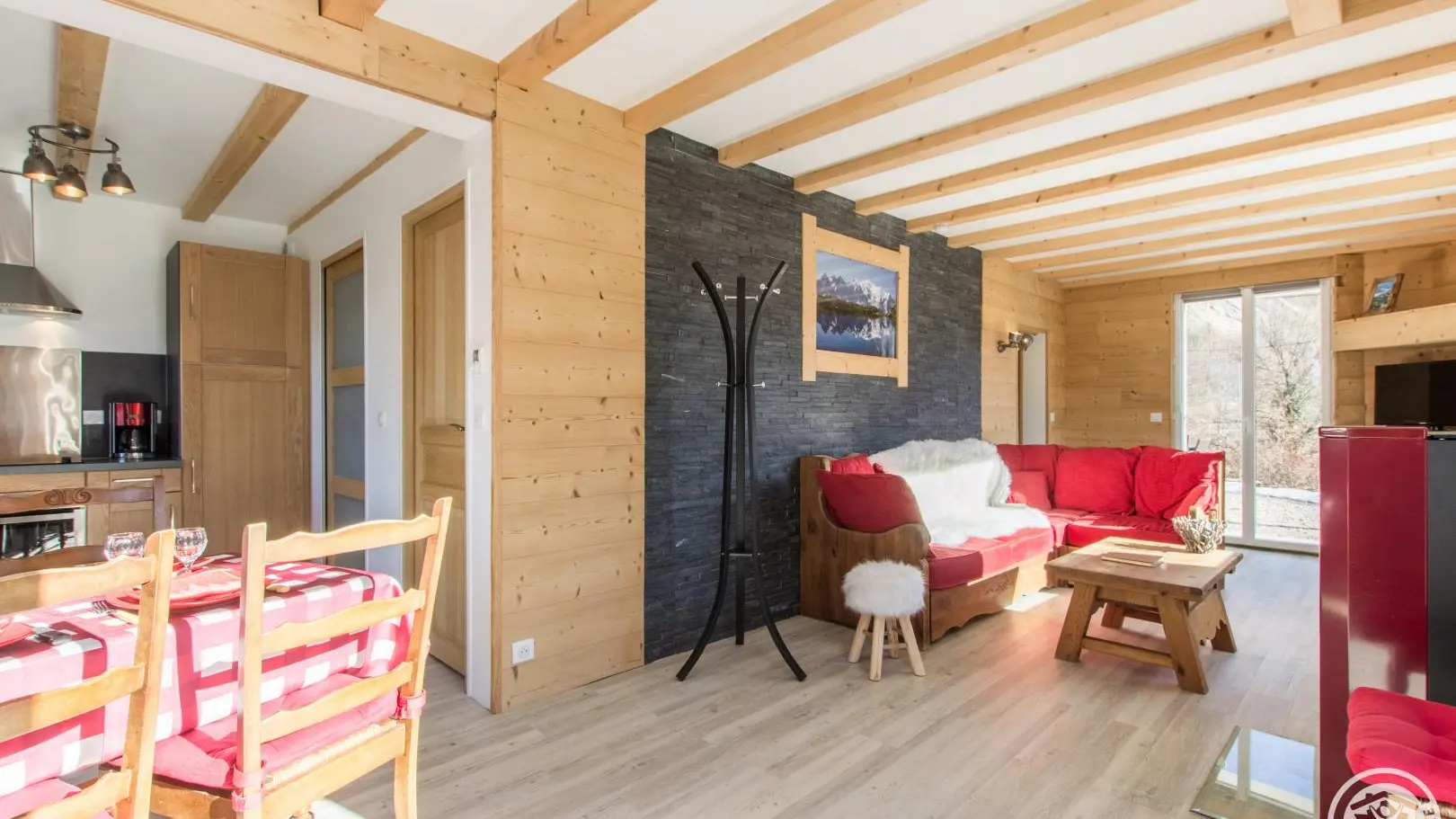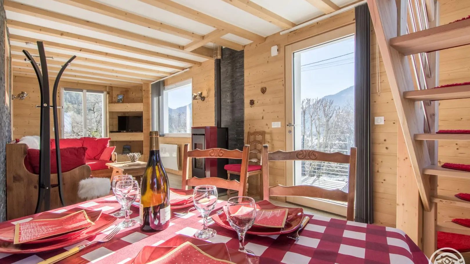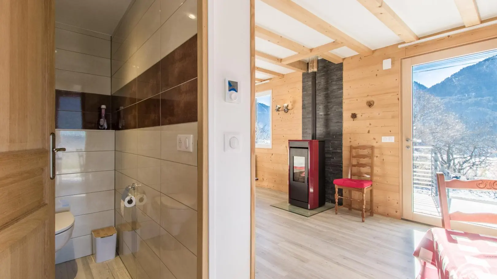 Cuisine équipée ouverte sur le séjour (table repas, canapé d'angle, télévision, poêle à granulés/pellets), accès à la terrasse, wc indépendant, chambre 1 (1 lit 160x200cm, salle d'eau avec douche).