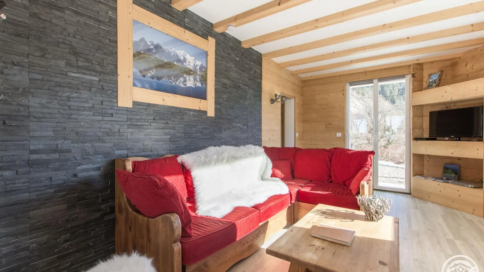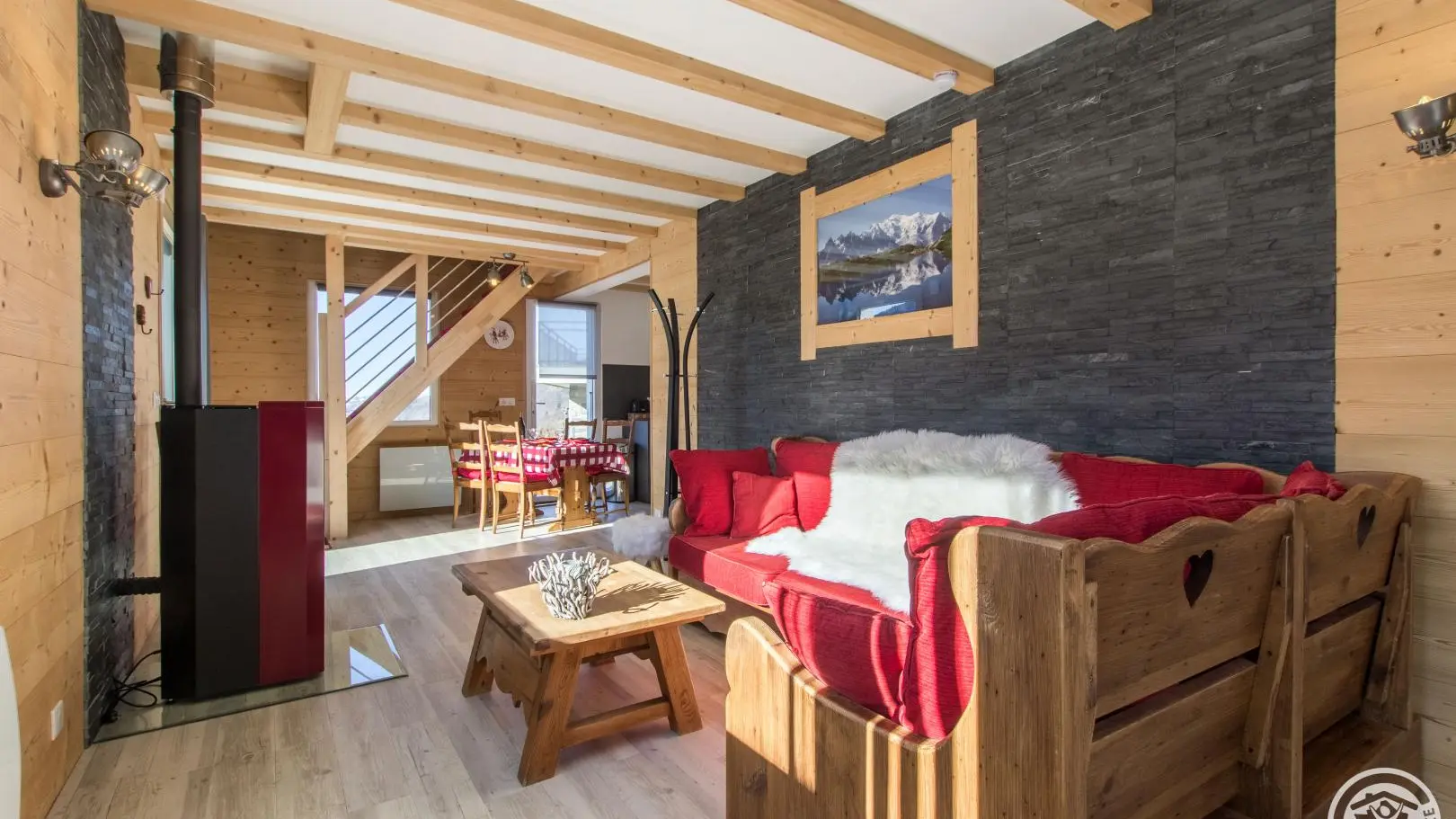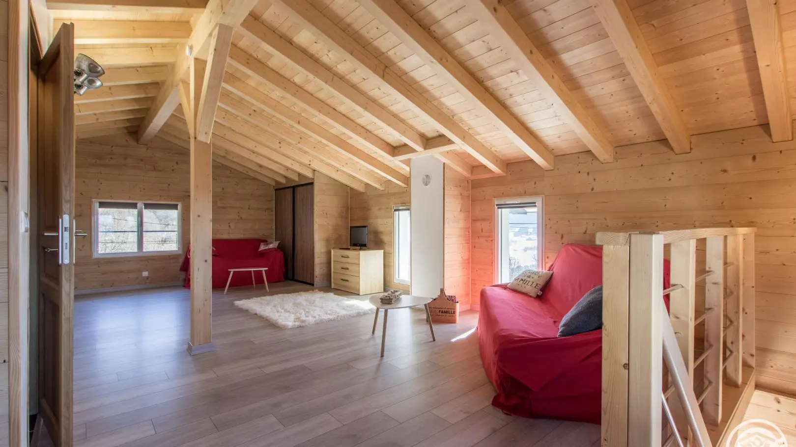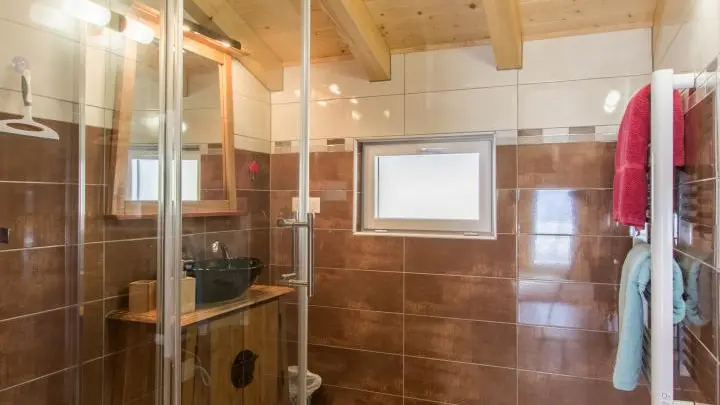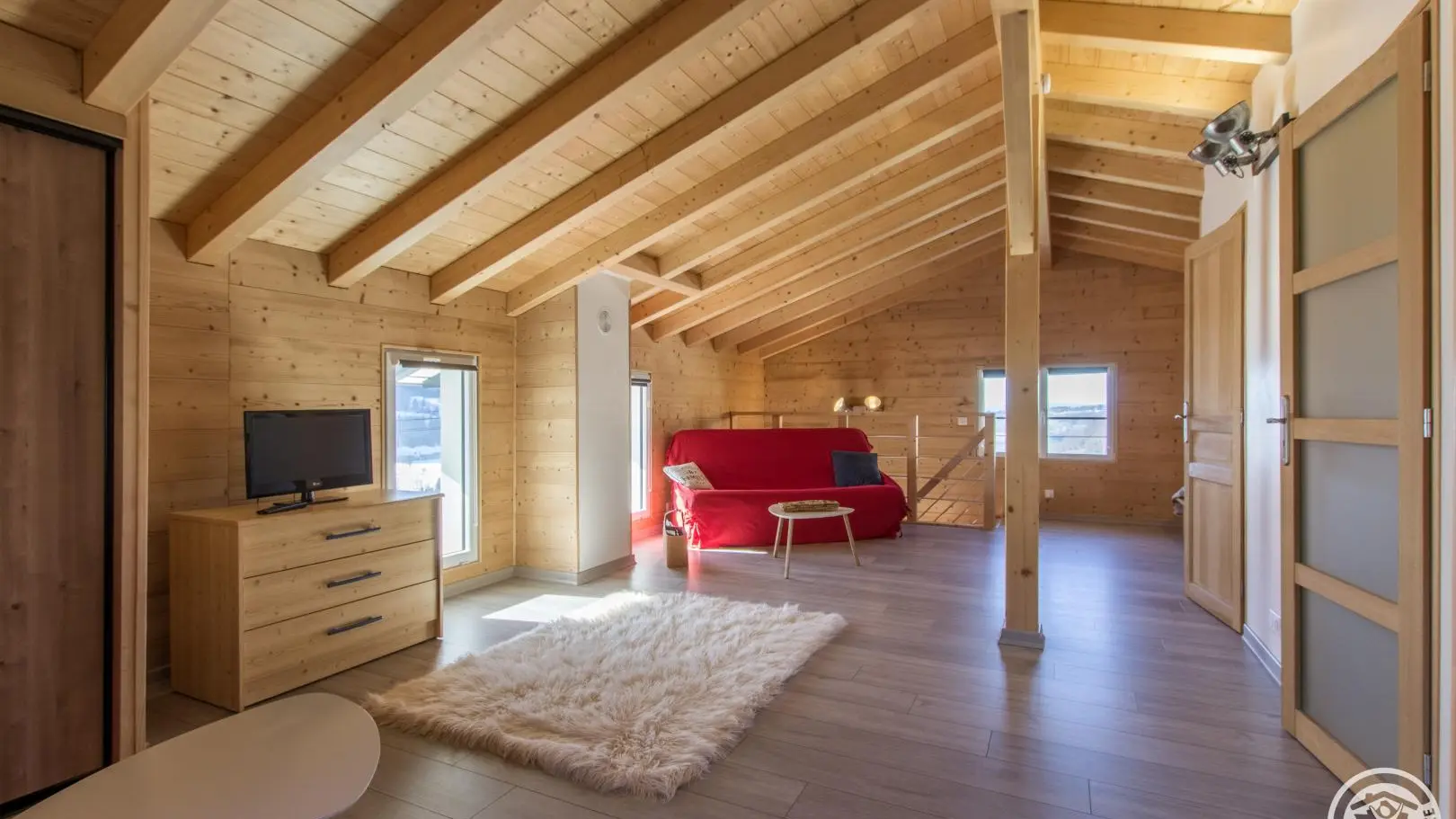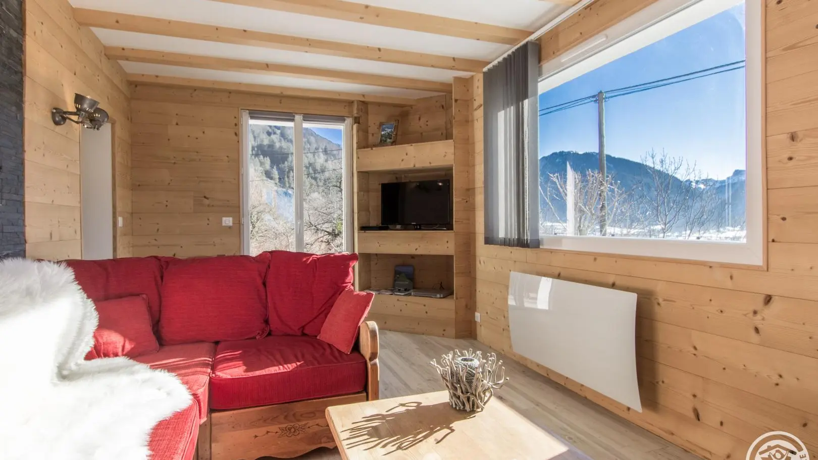 Cuisine équipée ouverte sur le séjour (table repas, canapé d'angle, télévision, poêle à granulés/pellets), accès à la terrasse, wc indépendant, chambre 1 (1 lit 160x200cm, salle d'eau avec douche).