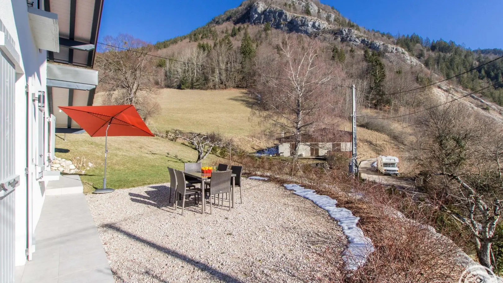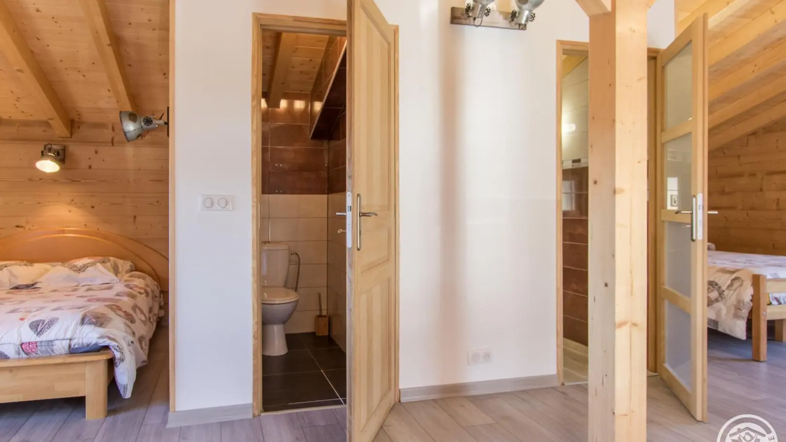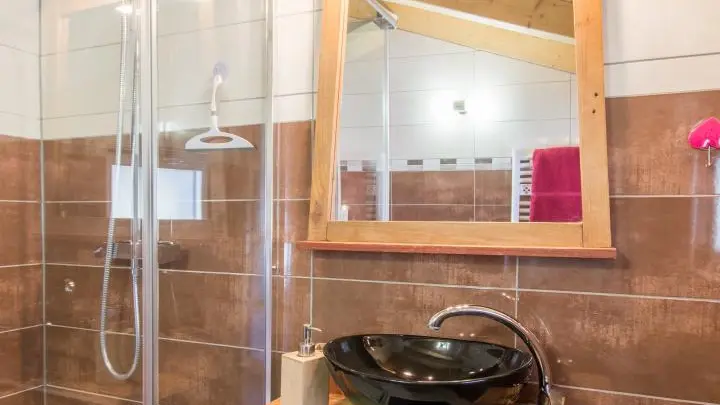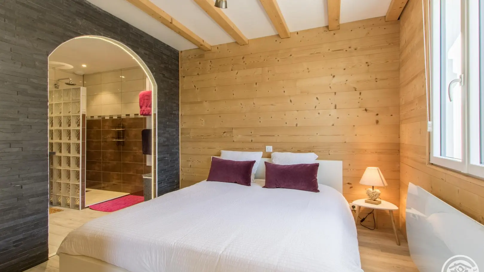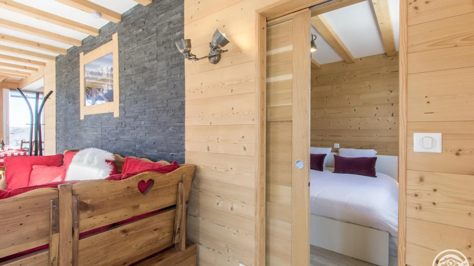 Cuisine équipée ouverte sur le séjour (table repas, canapé d'angle, télévision, poêle à granulés/pellets), accès à la terrasse, wc indépendant, chambre 1 (1 lit 160x200cm, salle d'eau avec douche).