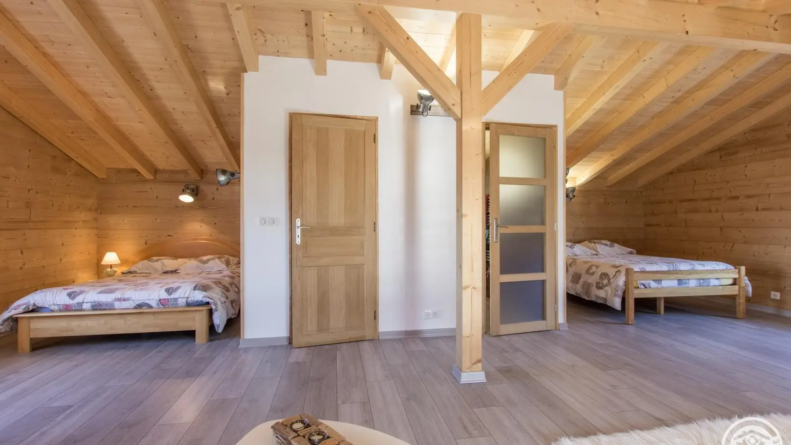 En duplex : grand espace nuit à l'étage avec 2 lits 140x190cm séparés par la salle d'eau (douche, petite vasque) et le wc indépendant, télévision, canapé. Terrasse privative sur le côté de la maison avec mobilier de jardin,transats, parasol, barbecue. Jardin/terrain commun sur l'arrière. Parking privatif dans la cour.