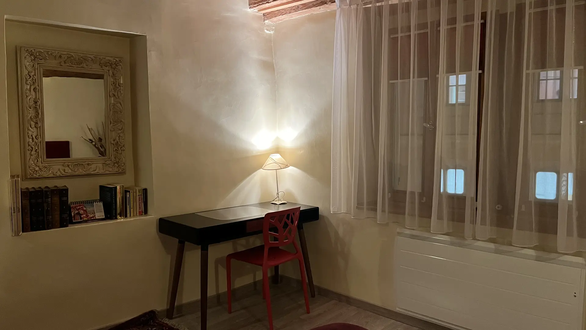 Ce bel appartement traversant de 60 m² possède une très jolie vue sur le canal et sur le château. Le charme des murs colorés à la chaux cirée, les plafonds à l’ancienne et les poutres apparentes vous raviront.