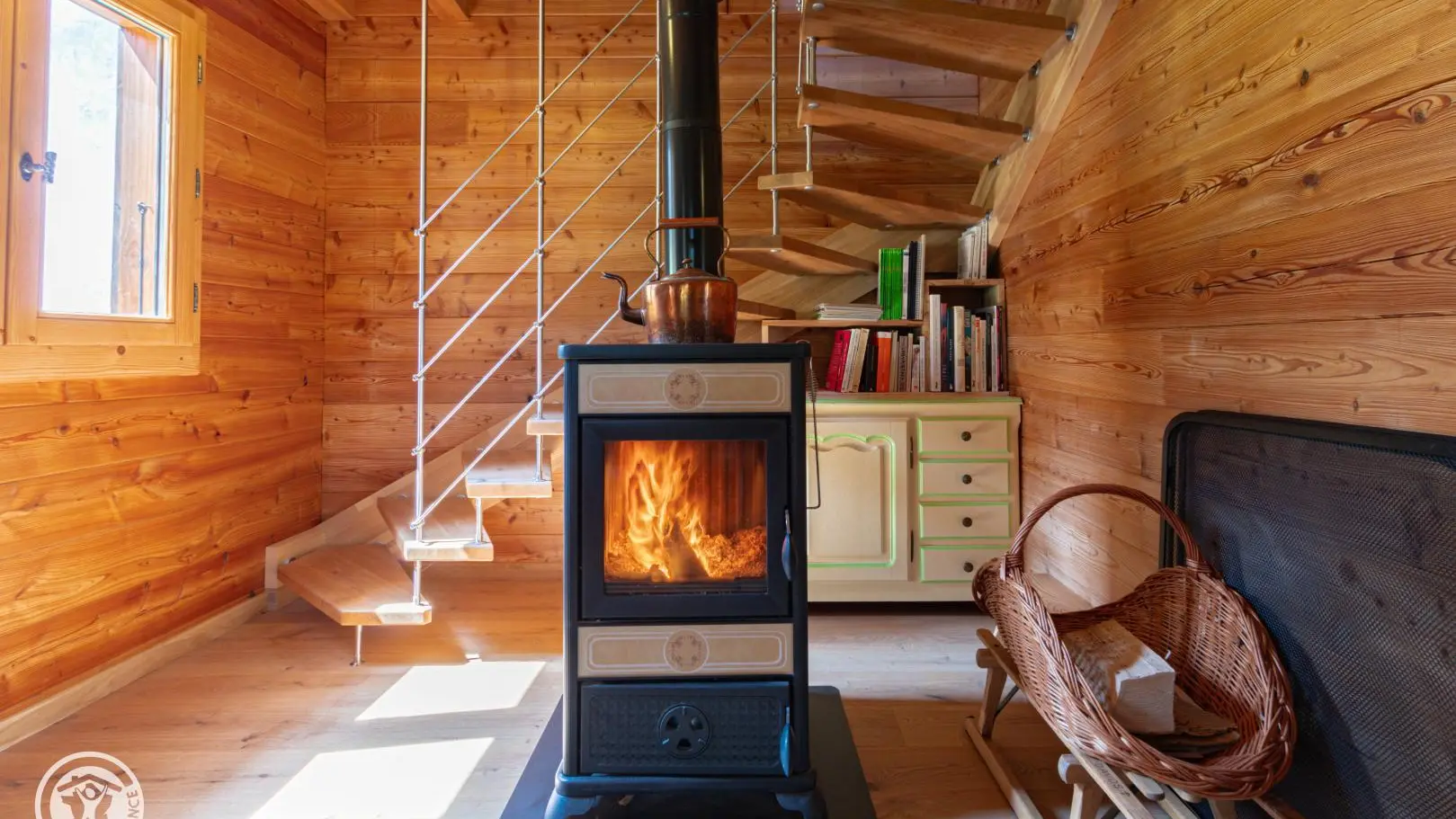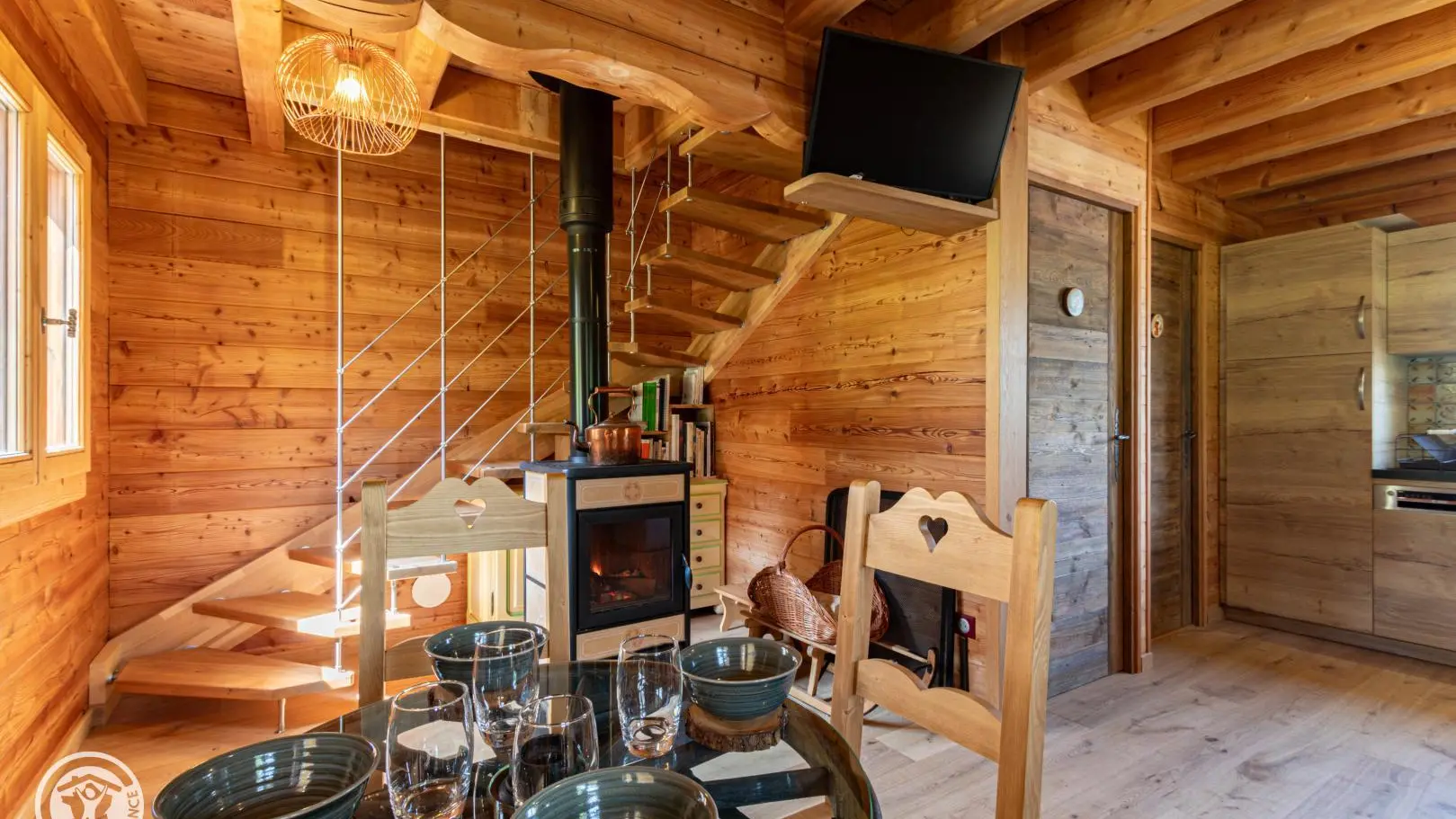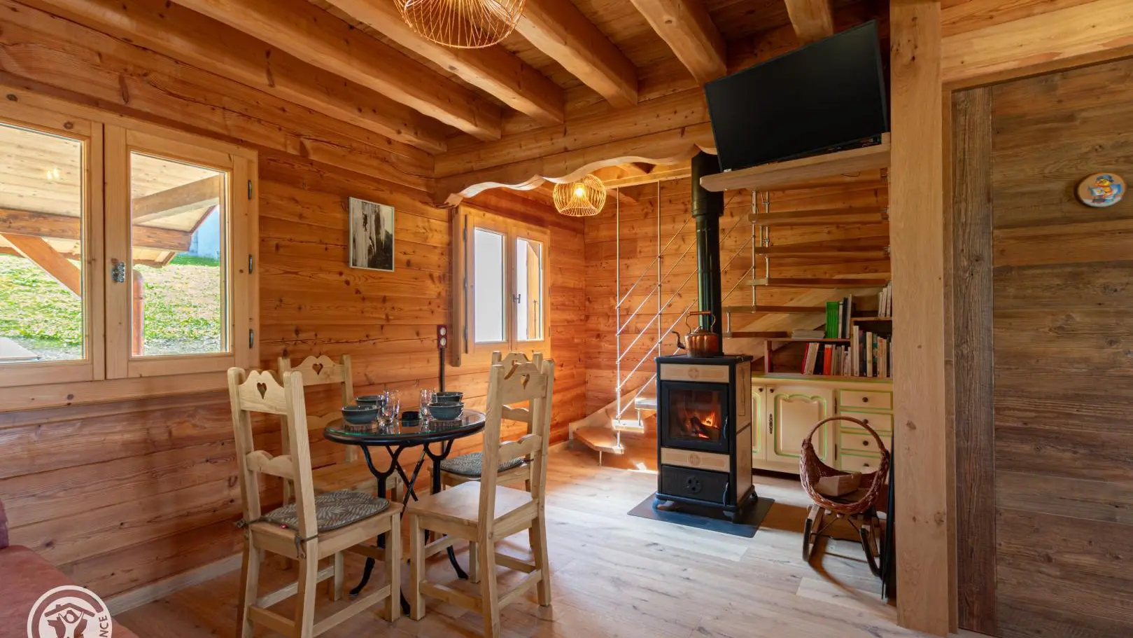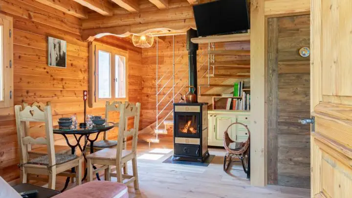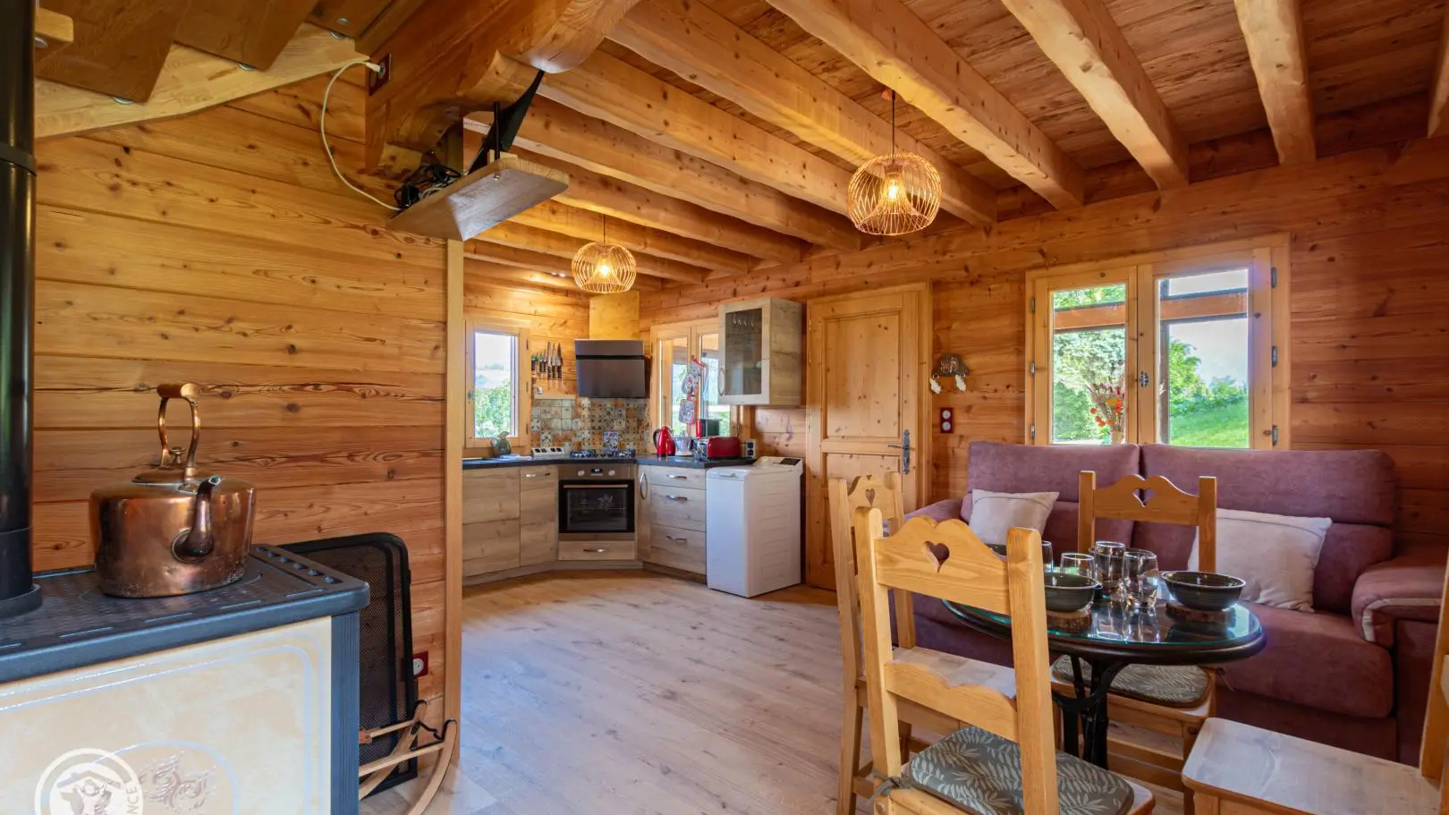 Dans le chalet, grande pièce de vie avec cuisine intégrée équipée (dont lave-vaisselle, lave-linge), poêle à bois (bois à disposition en option, 8€ par panier auprès du propriétaire), TV murale et coin salon comprenant une bibliothèque avec livres de montagne. Accès WC indépendant et salle d'eau (douche à l'italienne).