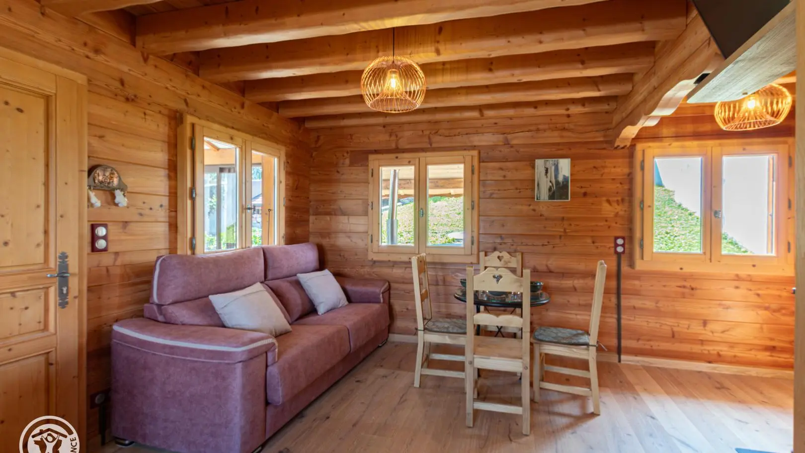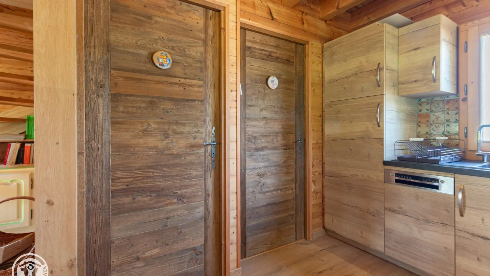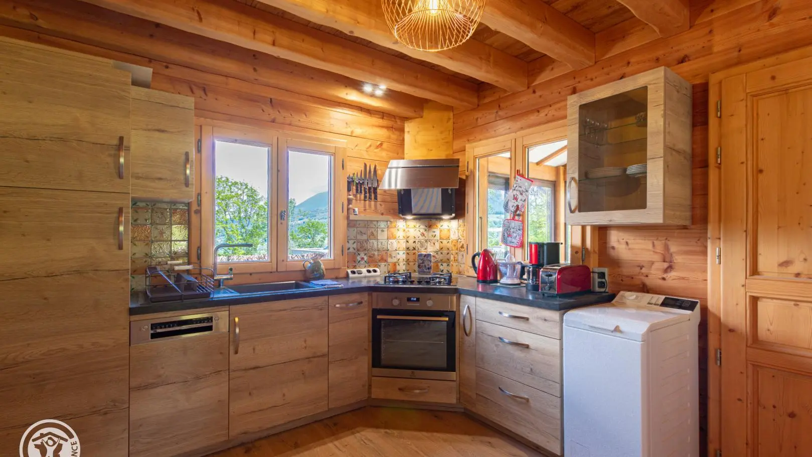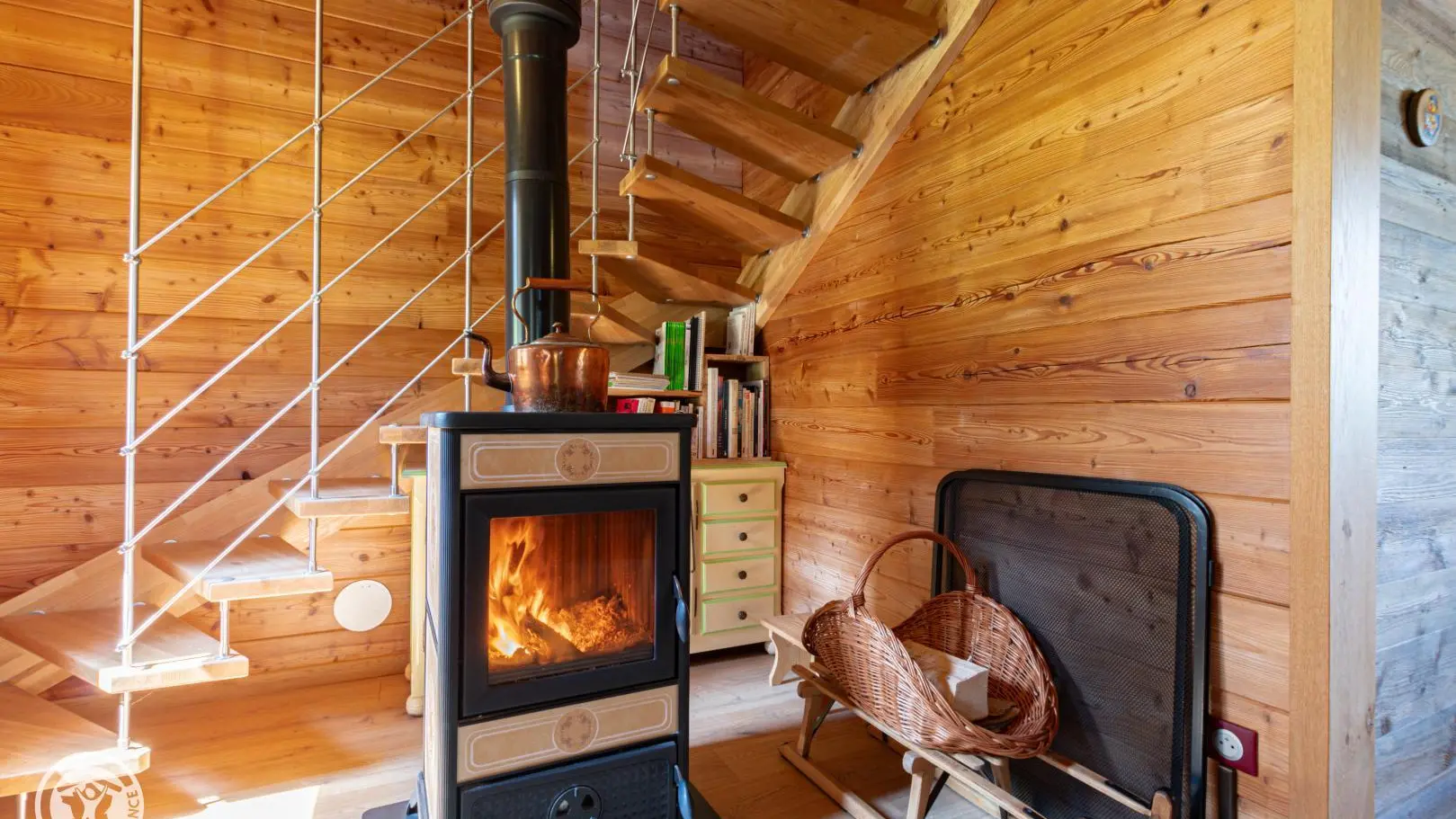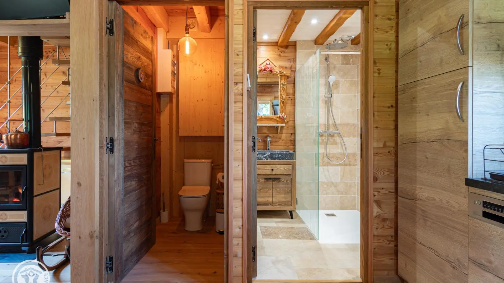 Dans le chalet, grande pièce de vie avec cuisine intégrée équipée (dont lave-vaisselle, lave-linge), poêle à bois (bois à disposition en option, 8€ par panier auprès du propriétaire), TV murale et coin salon comprenant une bibliothèque avec livres de montagne. Accès WC indépendant et salle d'eau (douche à l'italienne).