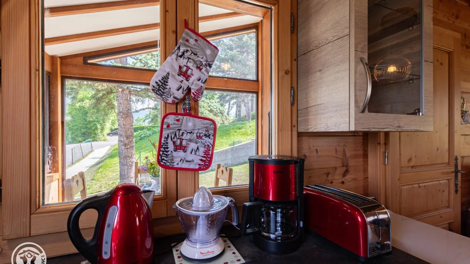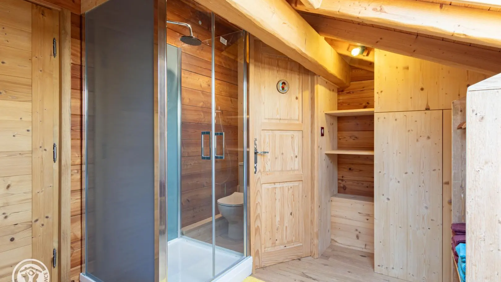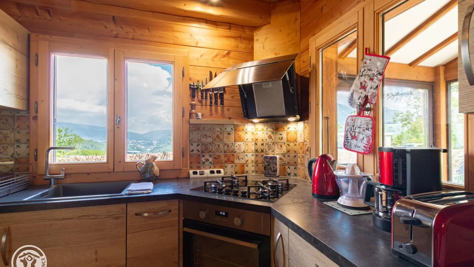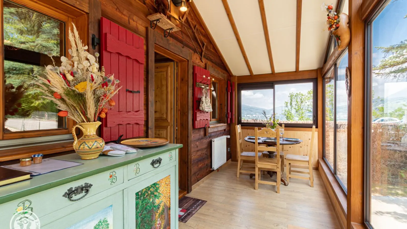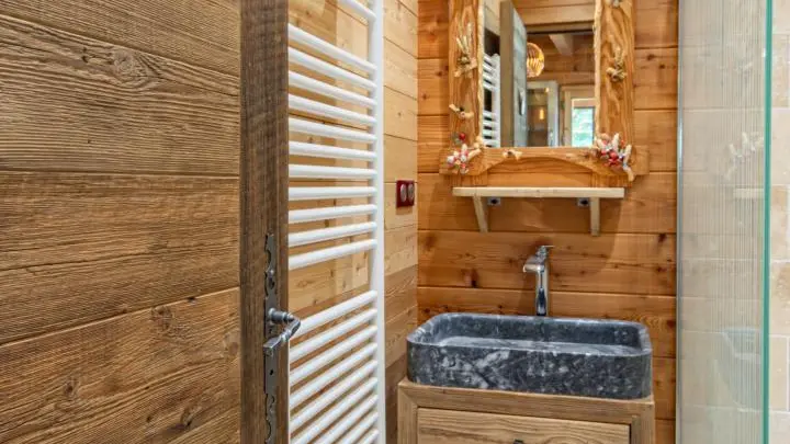 Dans le chalet, grande pièce de vie avec cuisine intégrée équipée (dont lave-vaisselle, lave-linge), poêle à bois (bois à disposition en option, 8€ par panier auprès du propriétaire), TV murale et coin salon comprenant une bibliothèque avec livres de montagne. Accès WC indépendant et salle d'eau (douche à l'italienne).