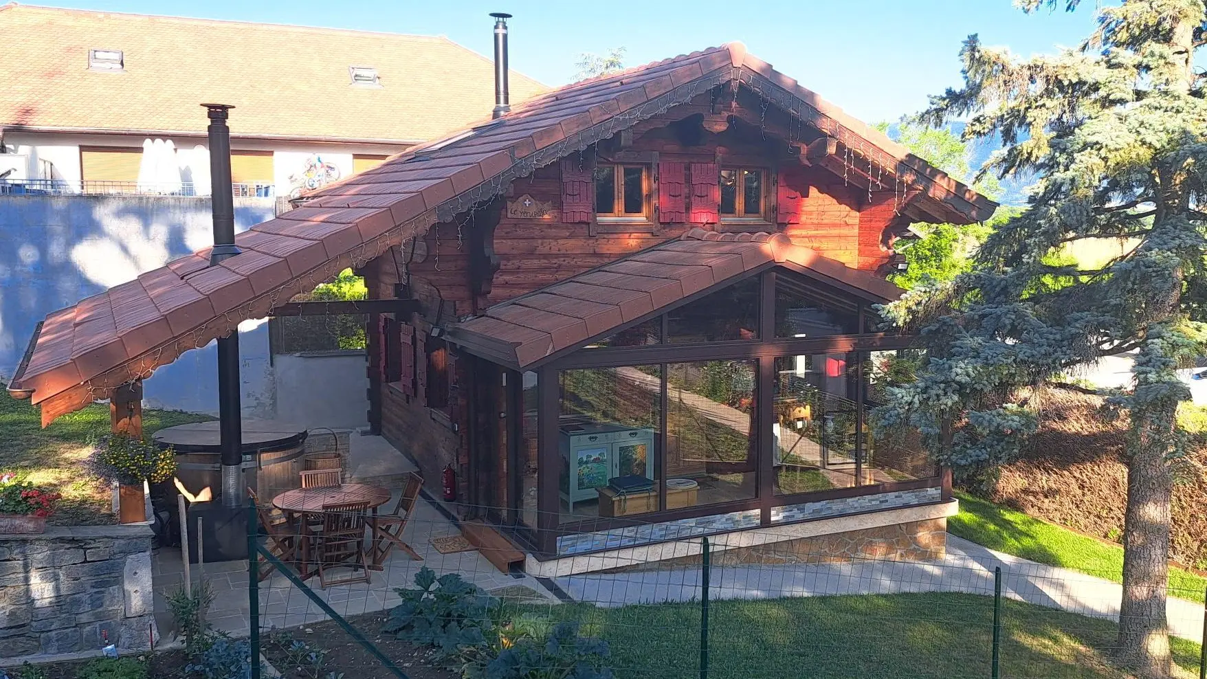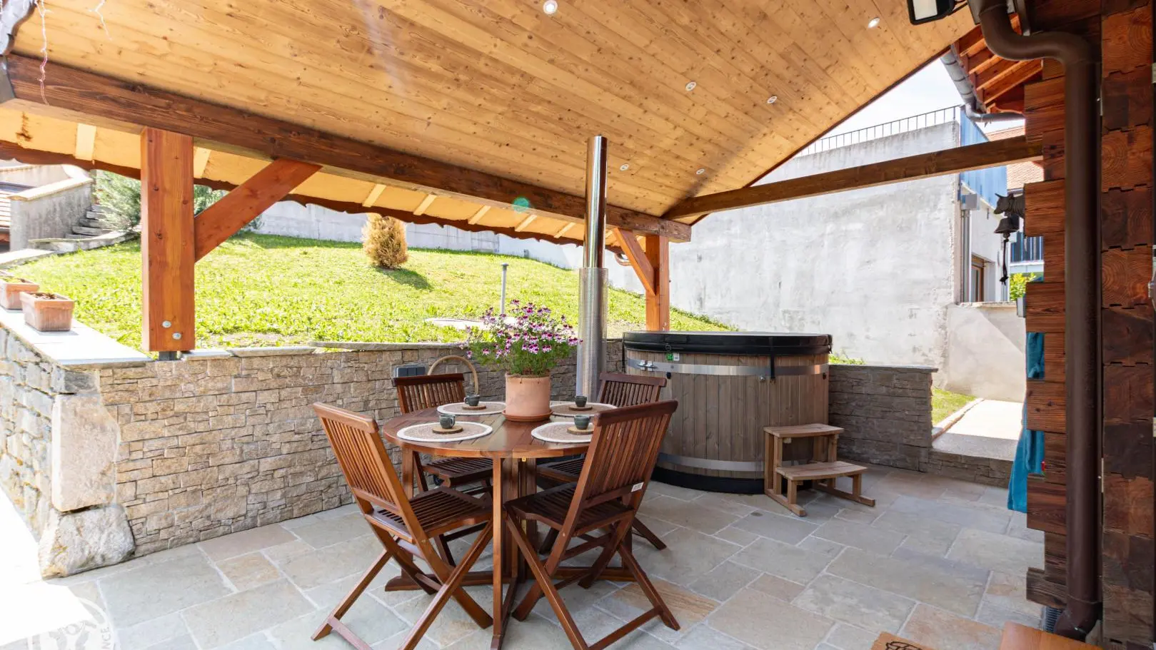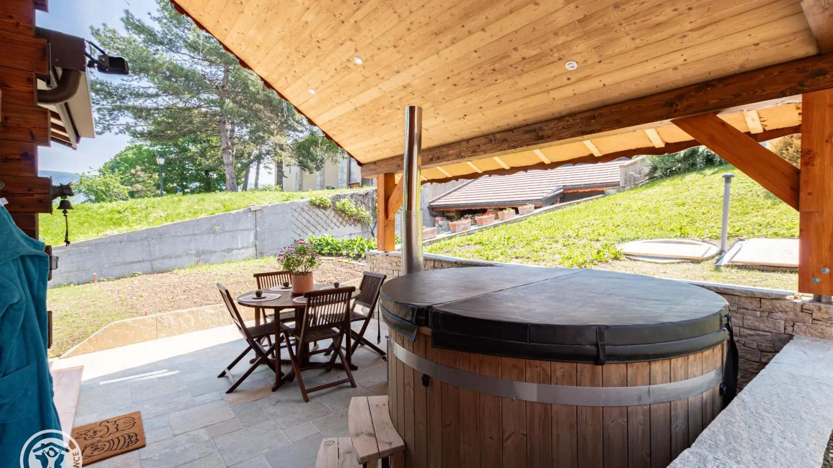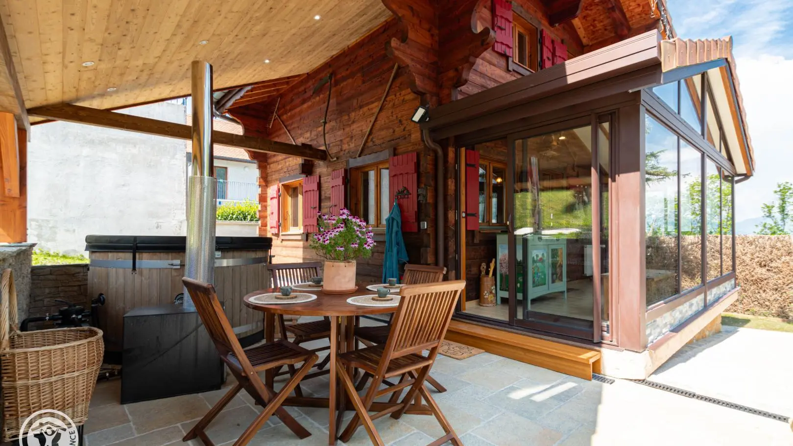 Entrée depuis la terrasse abritée comportant un salon de jardin et un SPA chauffé au bois. Passage par une véranda avec table de repas et rangements.