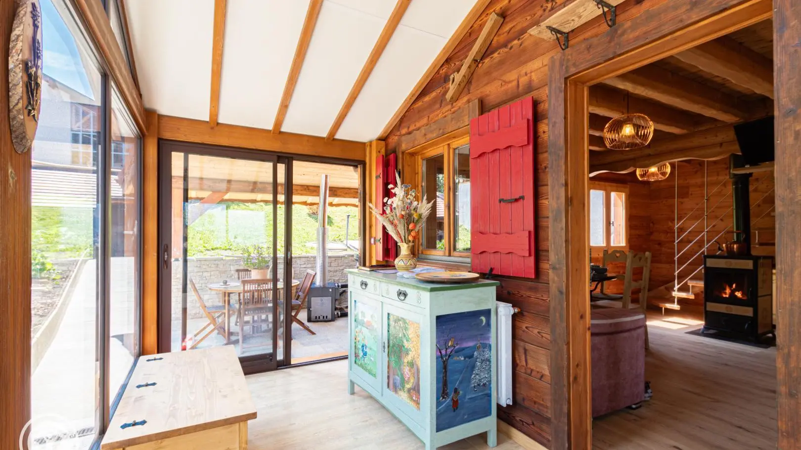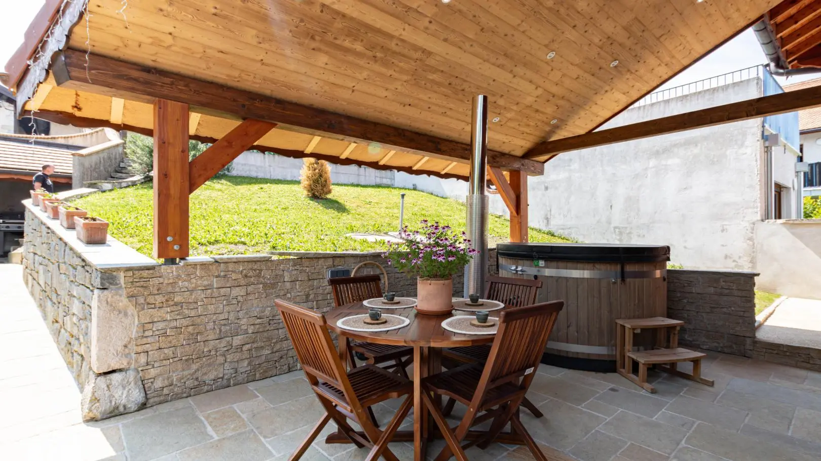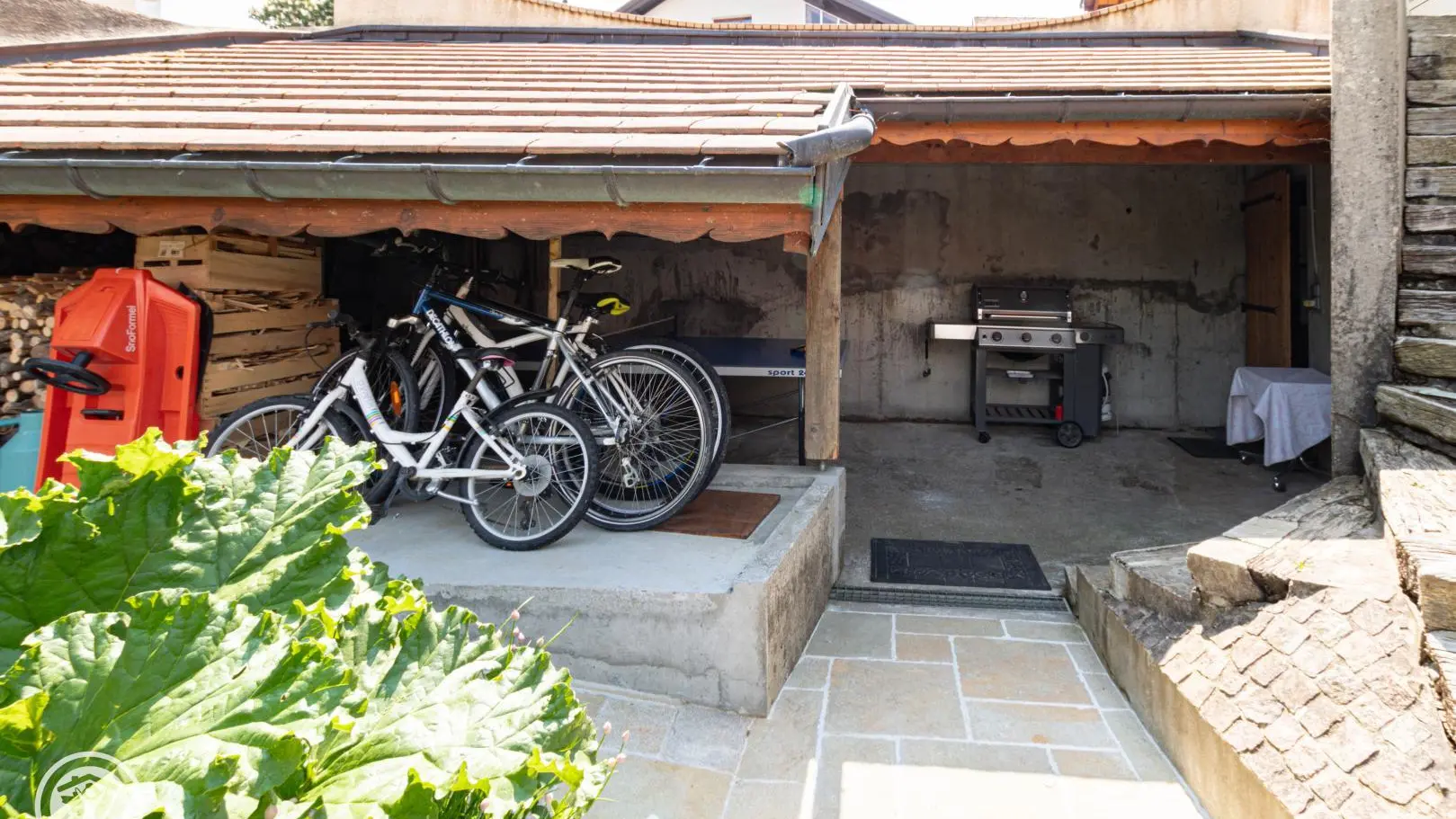 Entrée depuis la terrasse abritée comportant un salon de jardin et un SPA chauffé au bois. Passage par une véranda avec table de repas et rangements.