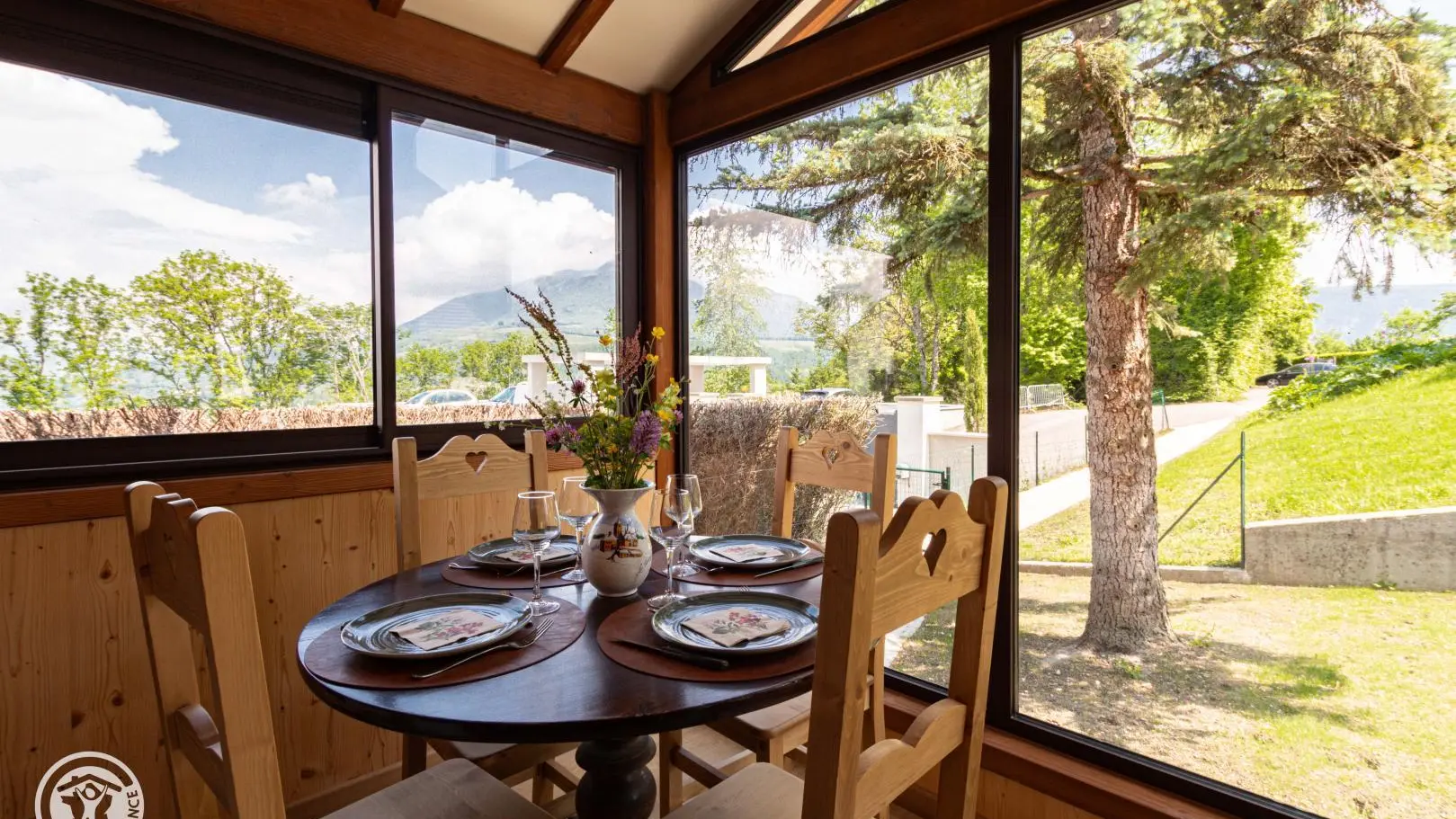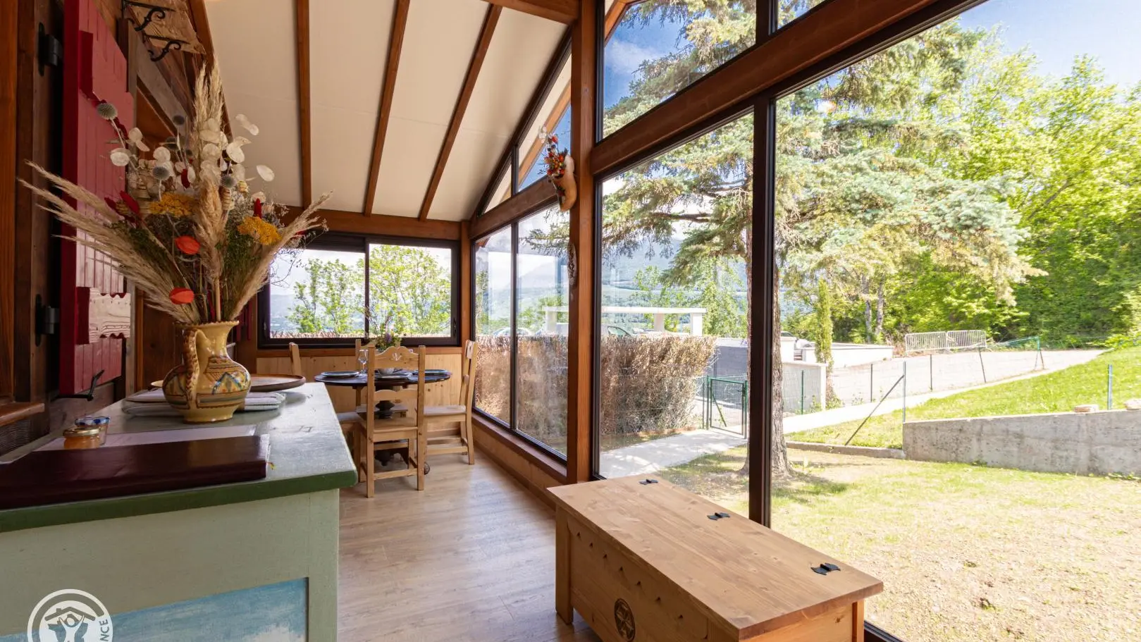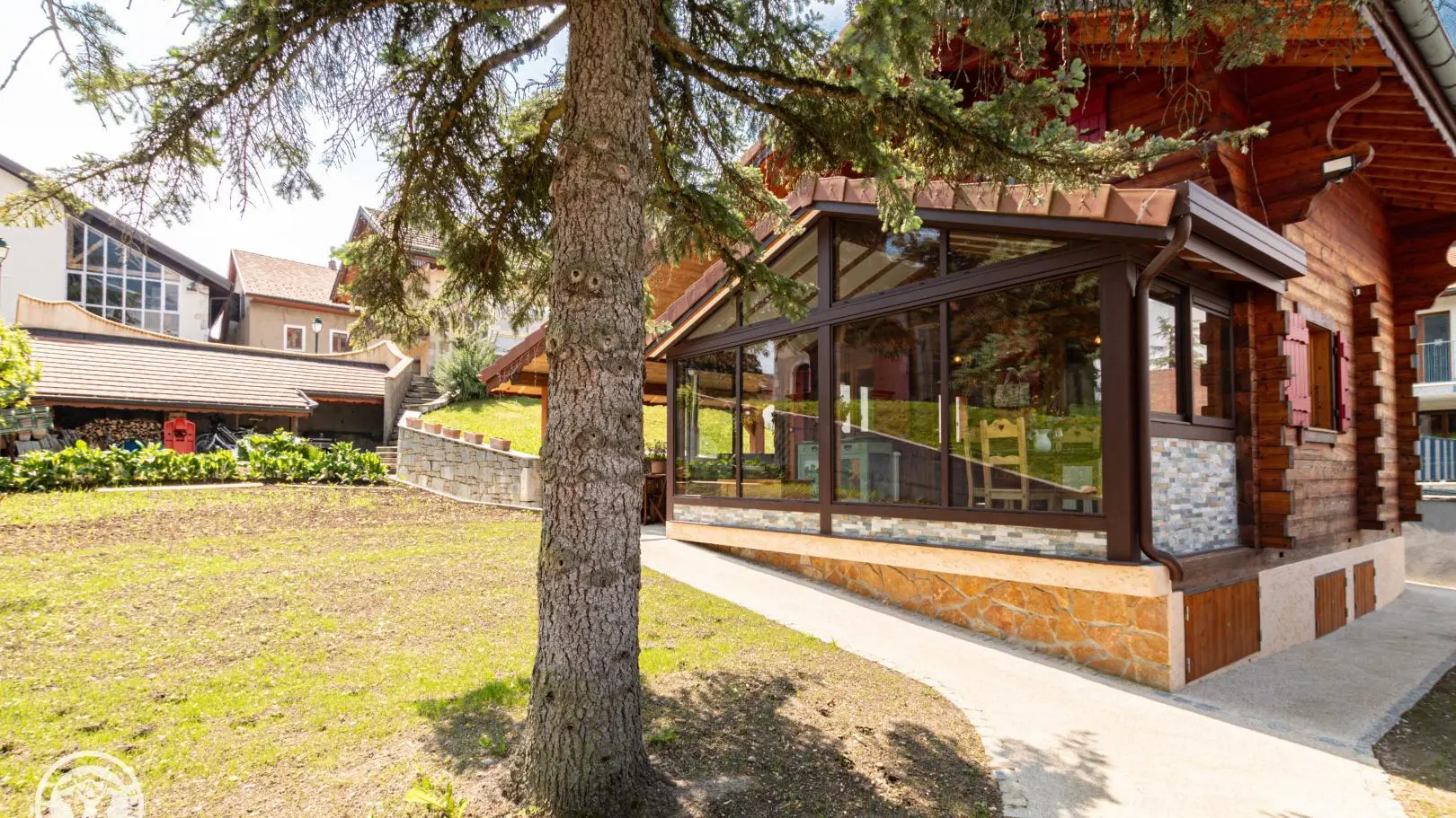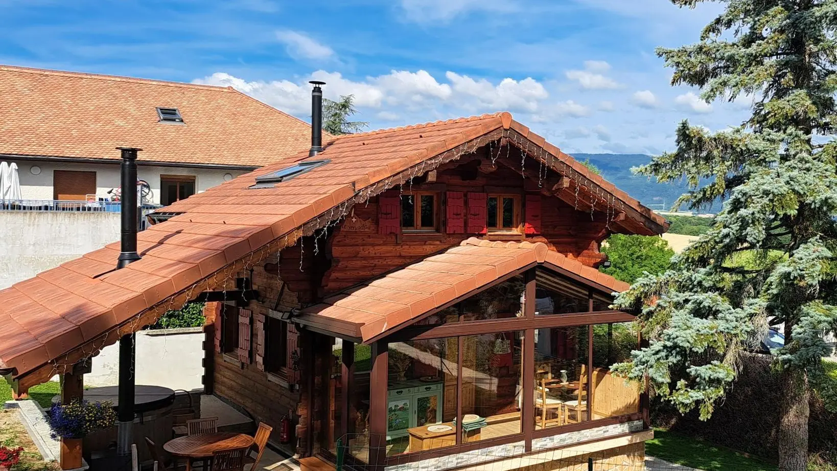Entrée depuis la terrasse abritée comportant un salon de jardin et un SPA chauffé au bois. Passage par une véranda avec table de repas et rangements.