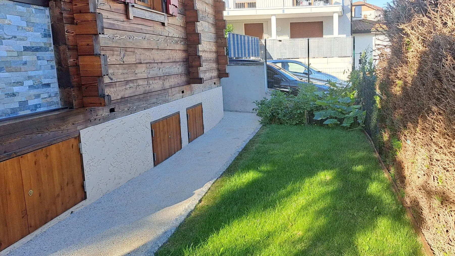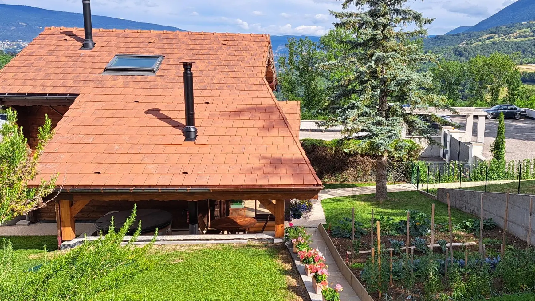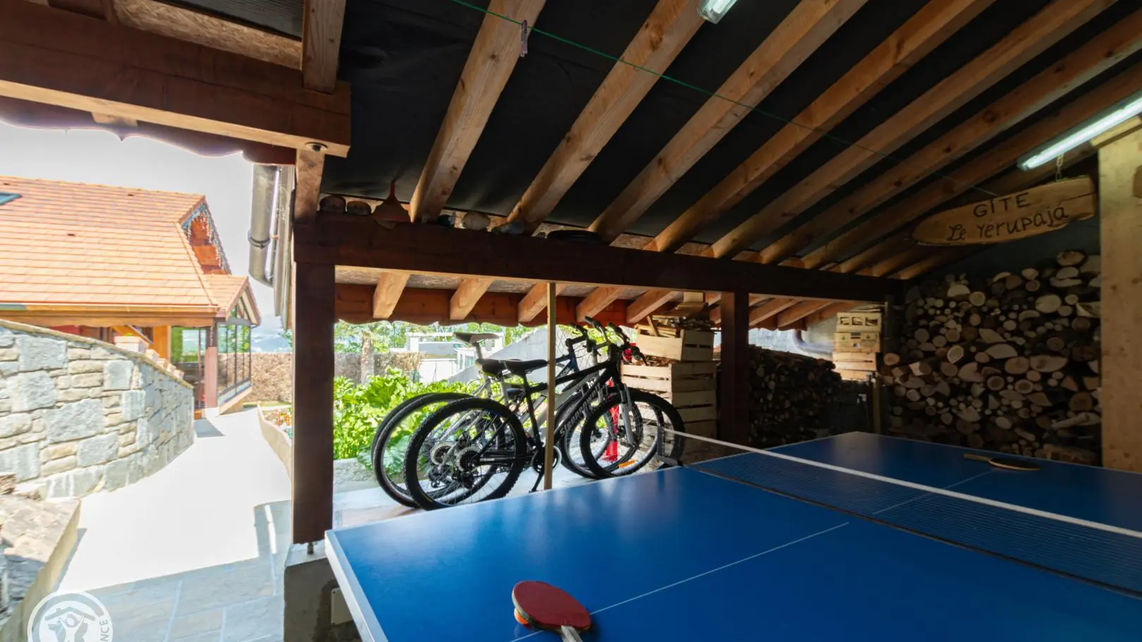 Terrain avec pelouse comprenant 2 chaises longues et bois et un hamac pour moments de détente. Espace commun avec le propriétaire (potager). Accès à un appentis où se trouve le bois avec une table de ping-pong et du matériel pour la période hivernale (luges, raquettes) ainsi qu'un barbecue gaz.