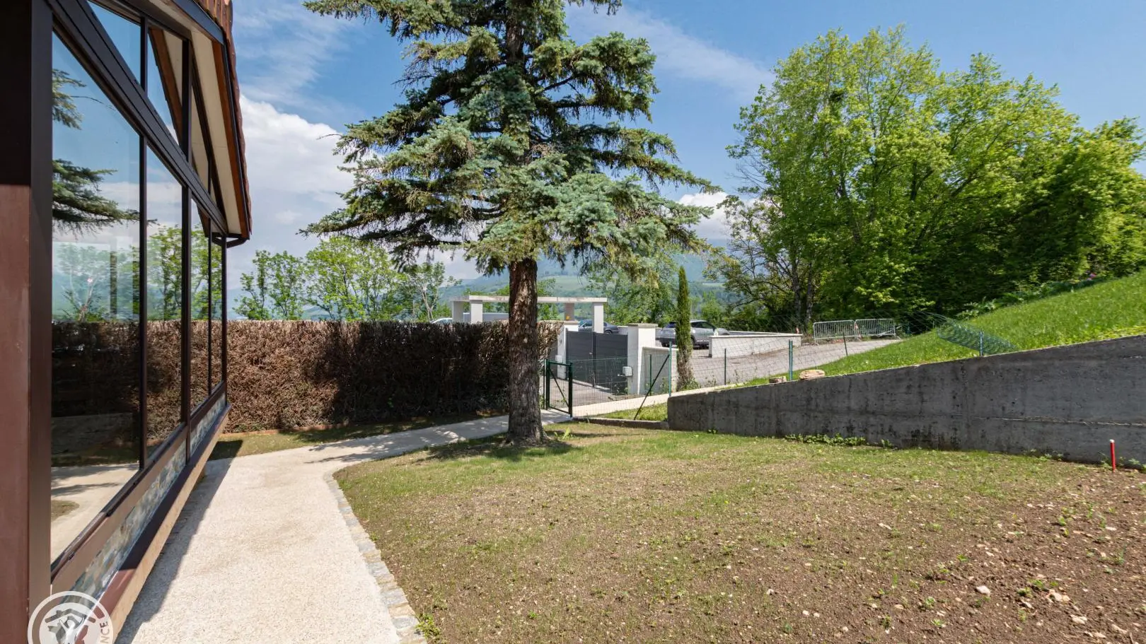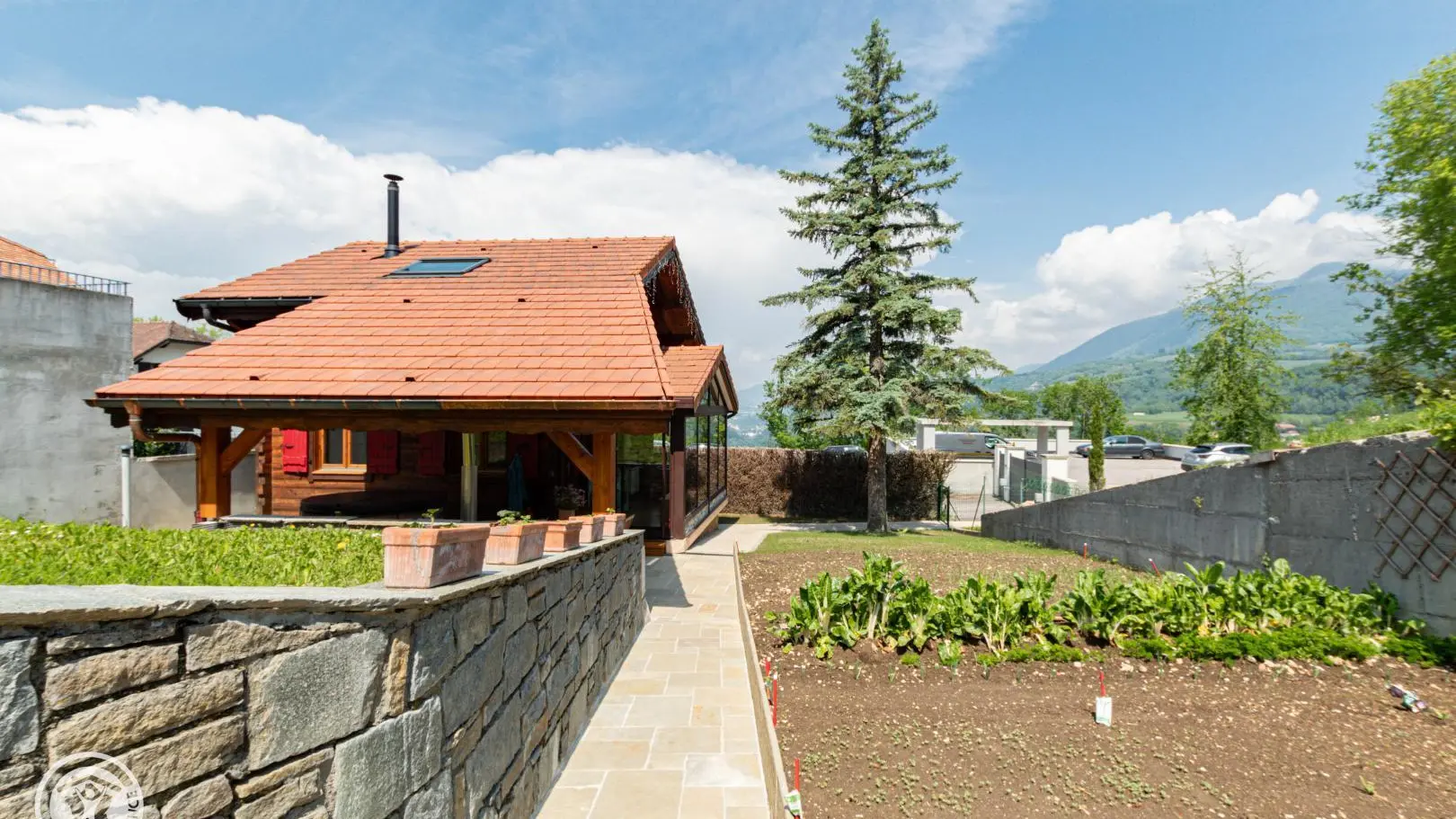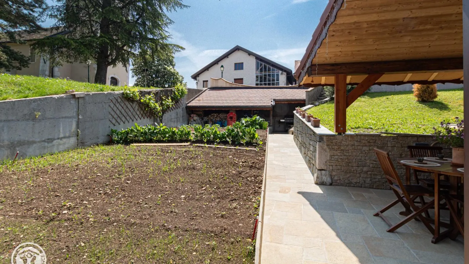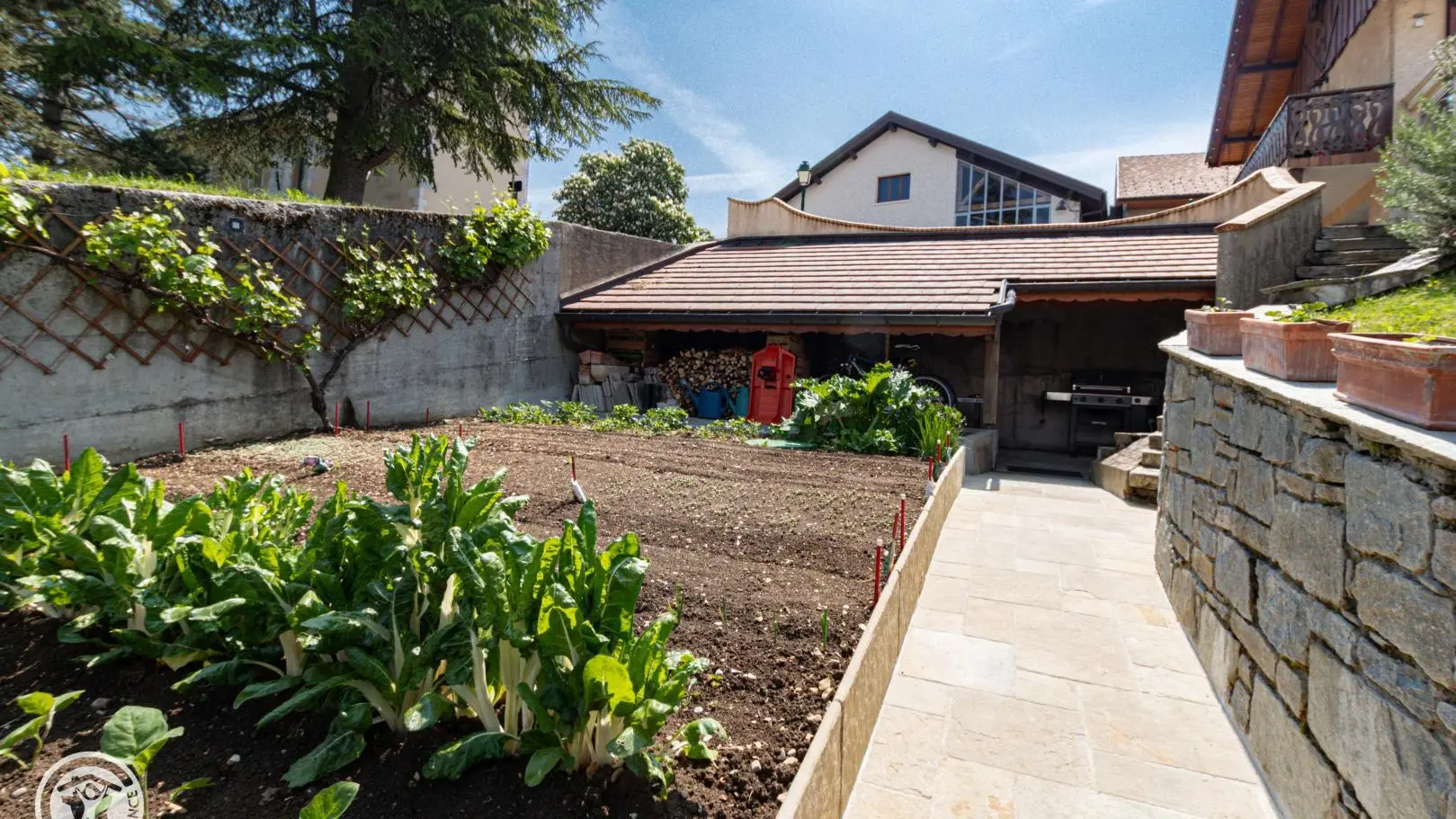 Terrain avec pelouse comprenant 2 chaises longues et bois et un hamac pour moments de détente. Espace commun avec le propriétaire (potager). Accès à un appentis où se trouve le bois avec une table de ping-pong et du matériel pour la période hivernale (luges, raquettes) ainsi qu'un barbecue gaz.