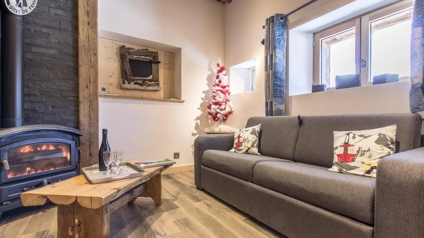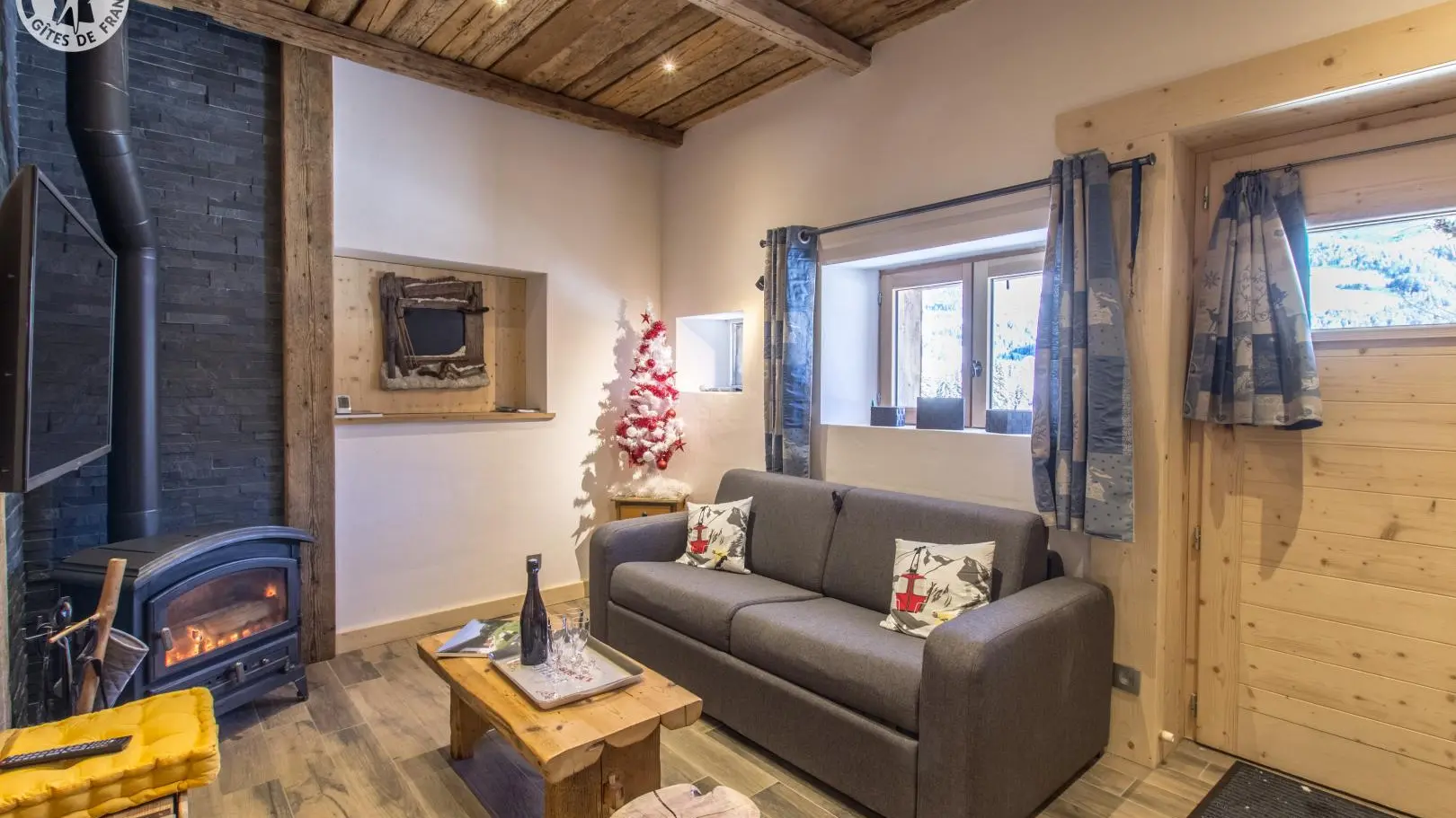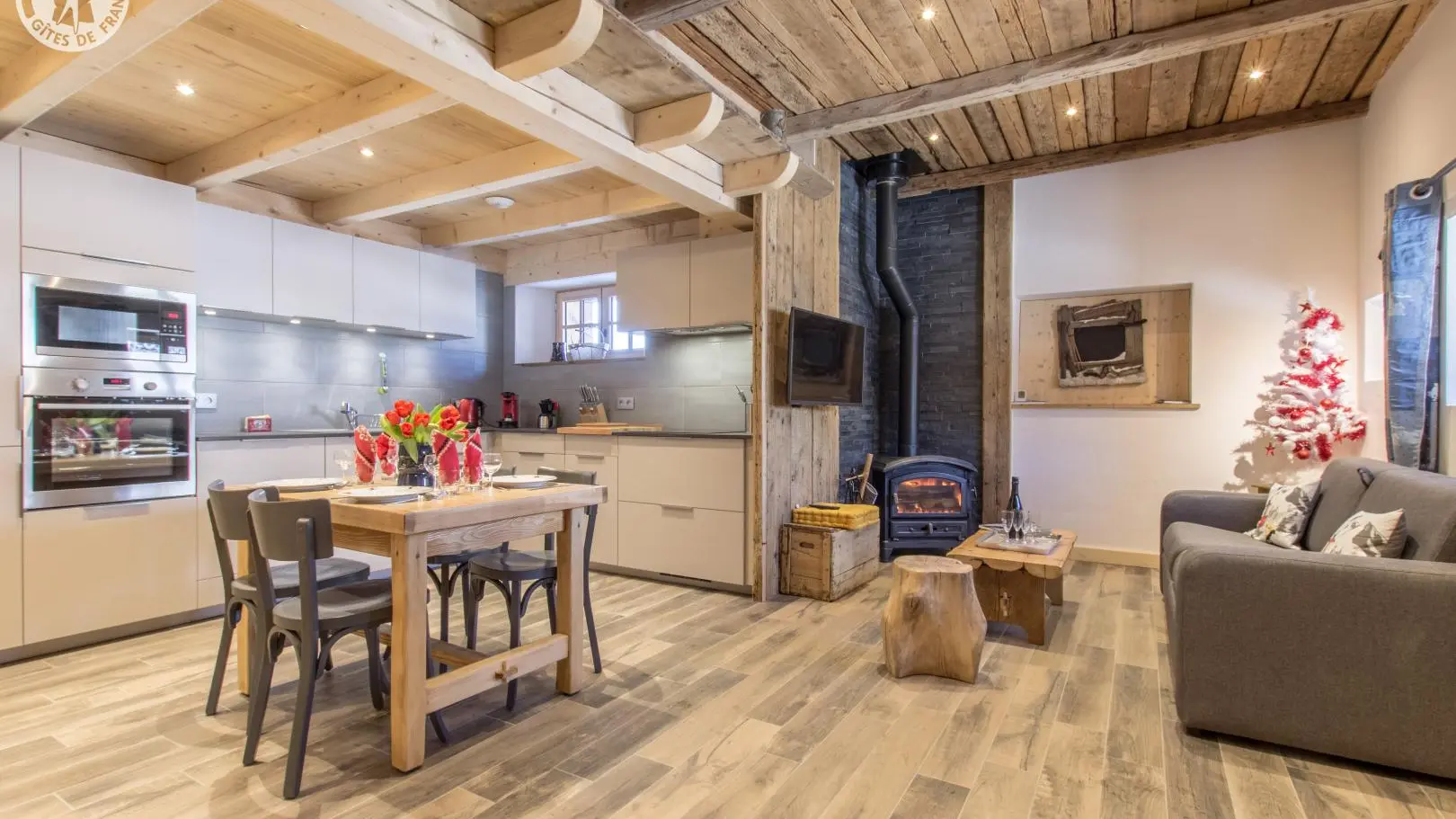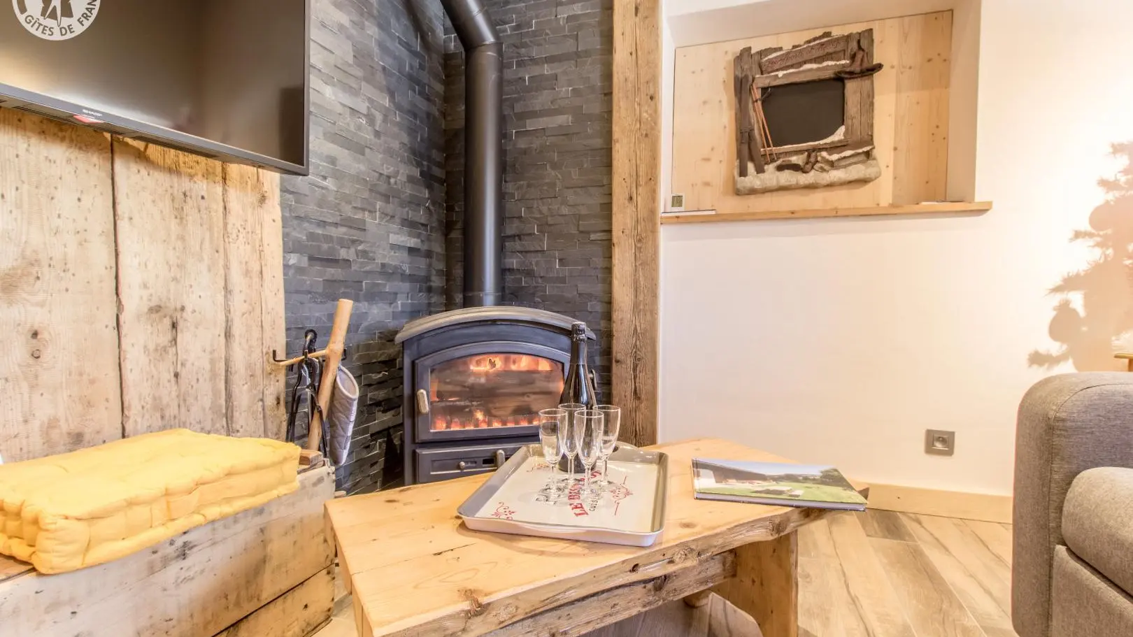Cuisine intégrée ouverte sur séjour (canapé convertible offrant un confortable couchage d'appoint 140x190cm, Tv, poêle à bois), chambre 1 (2 lits 90x200cm, Tv), chambre 2 (1 lit 160x200cm, Tv), salle de d'eau communiquante avec les 2 chambres (douche à l'italienne, lave-linge). Les draps sont inclus. Internet wifi.