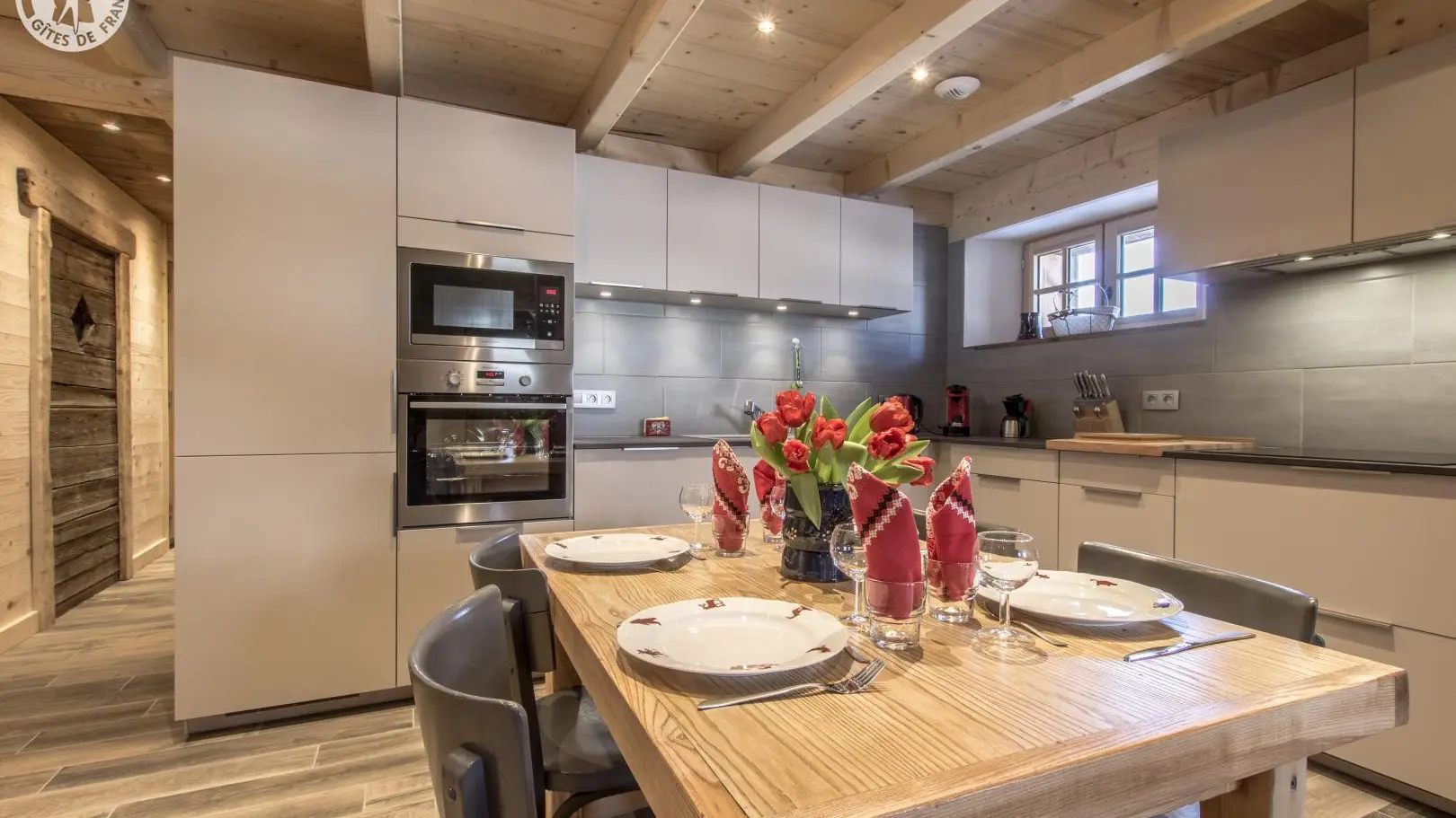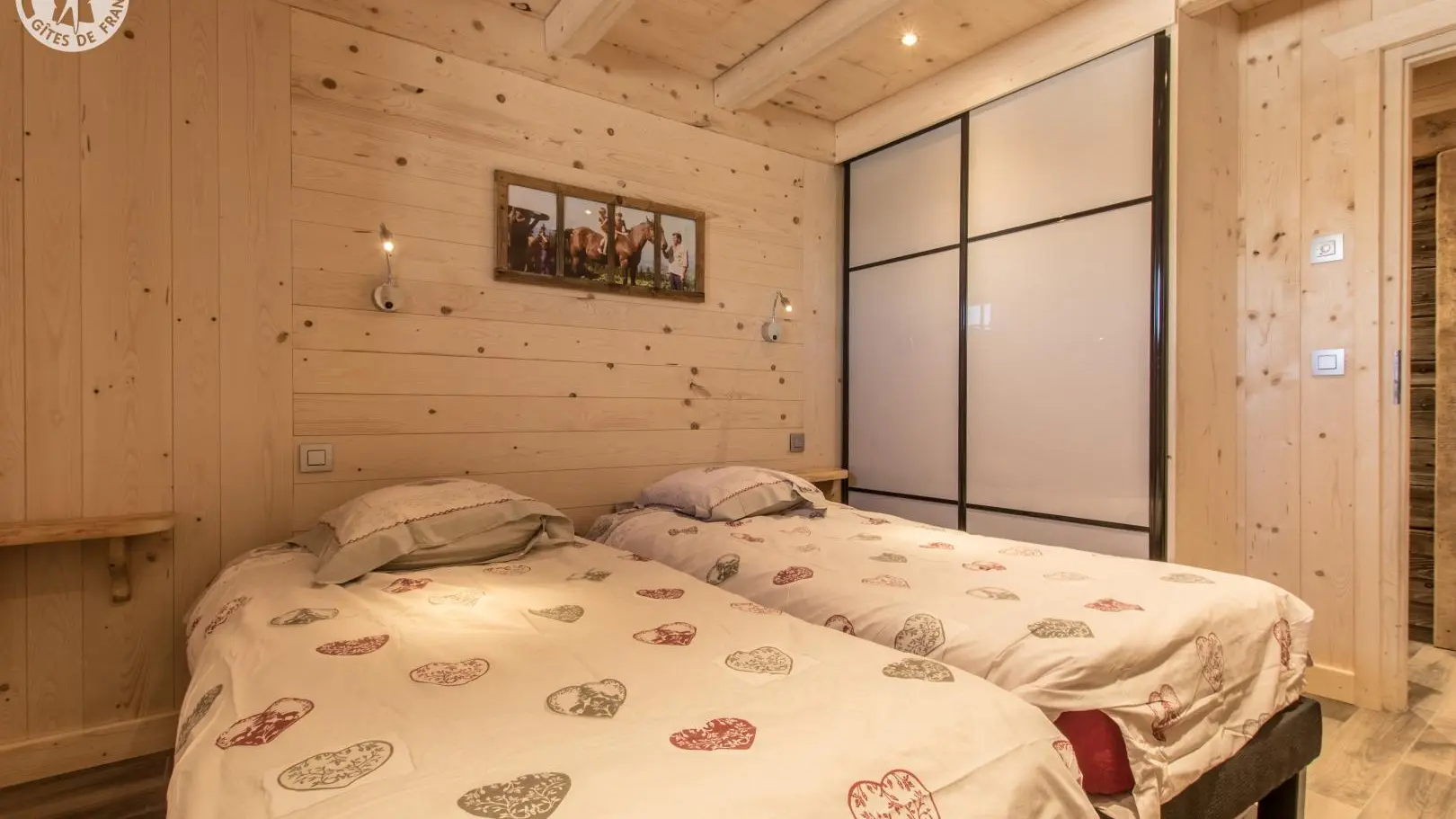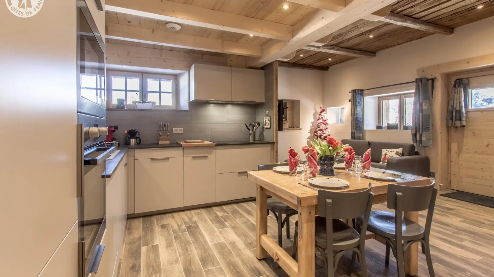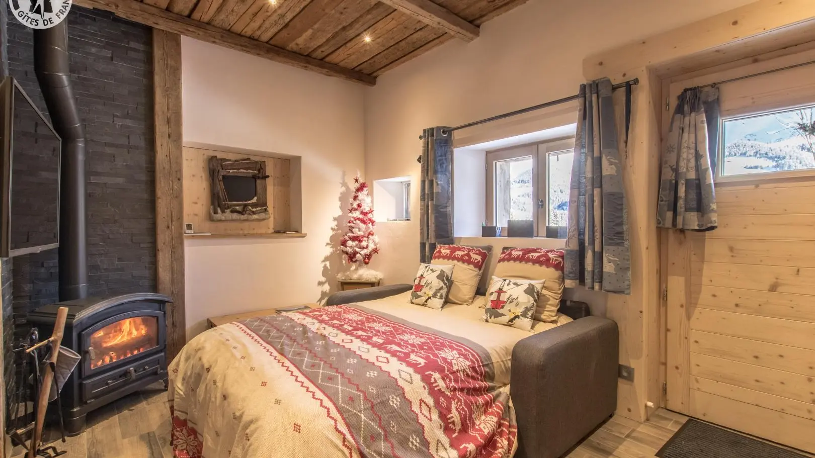 Cuisine intégrée ouverte sur séjour (canapé convertible offrant un confortable couchage d'appoint 140x190cm, Tv, poêle à bois), chambre 1 (2 lits 90x200cm, Tv), chambre 2 (1 lit 160x200cm, Tv), salle de d'eau communiquante avec les 2 chambres (douche à l'italienne, lave-linge). Les draps sont inclus. Internet wifi.