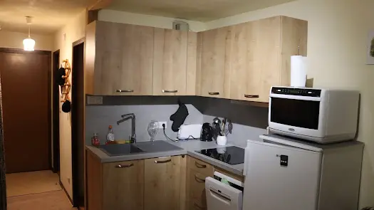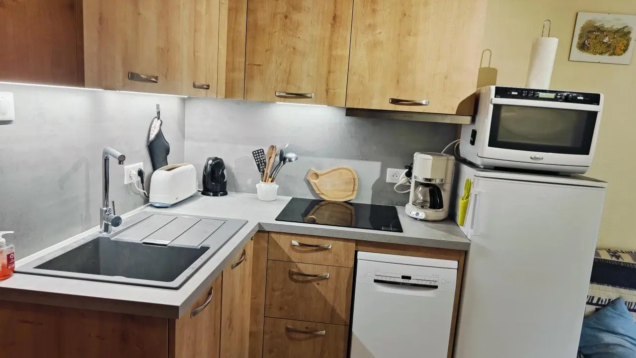 Coin cuisine dans le séjour. 2 feux électriques. Combiné micro-ondes/four, réfrigérateur.
