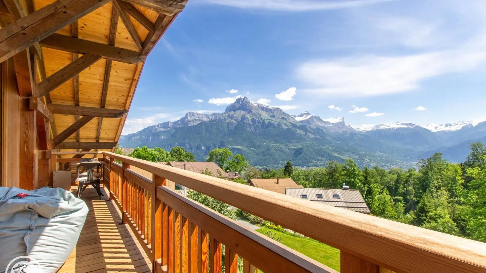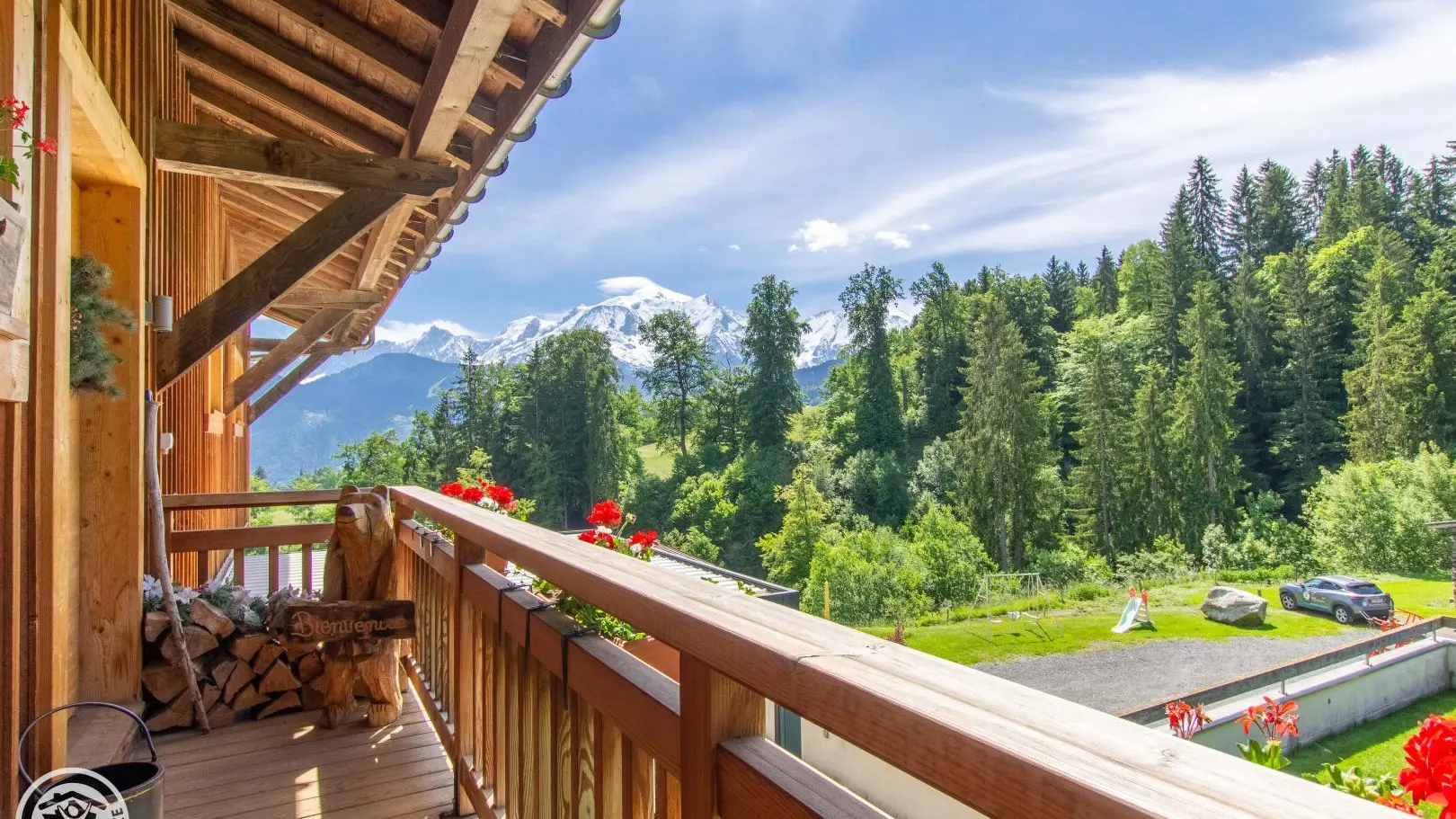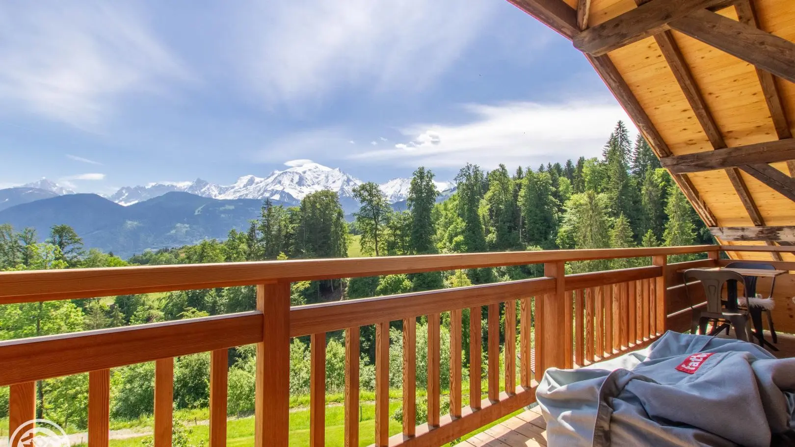 Balcon au 2ème étage face au Mont-Blanc avec 2 petites tables. Internet wifi. Chauffage au sol (électrique).