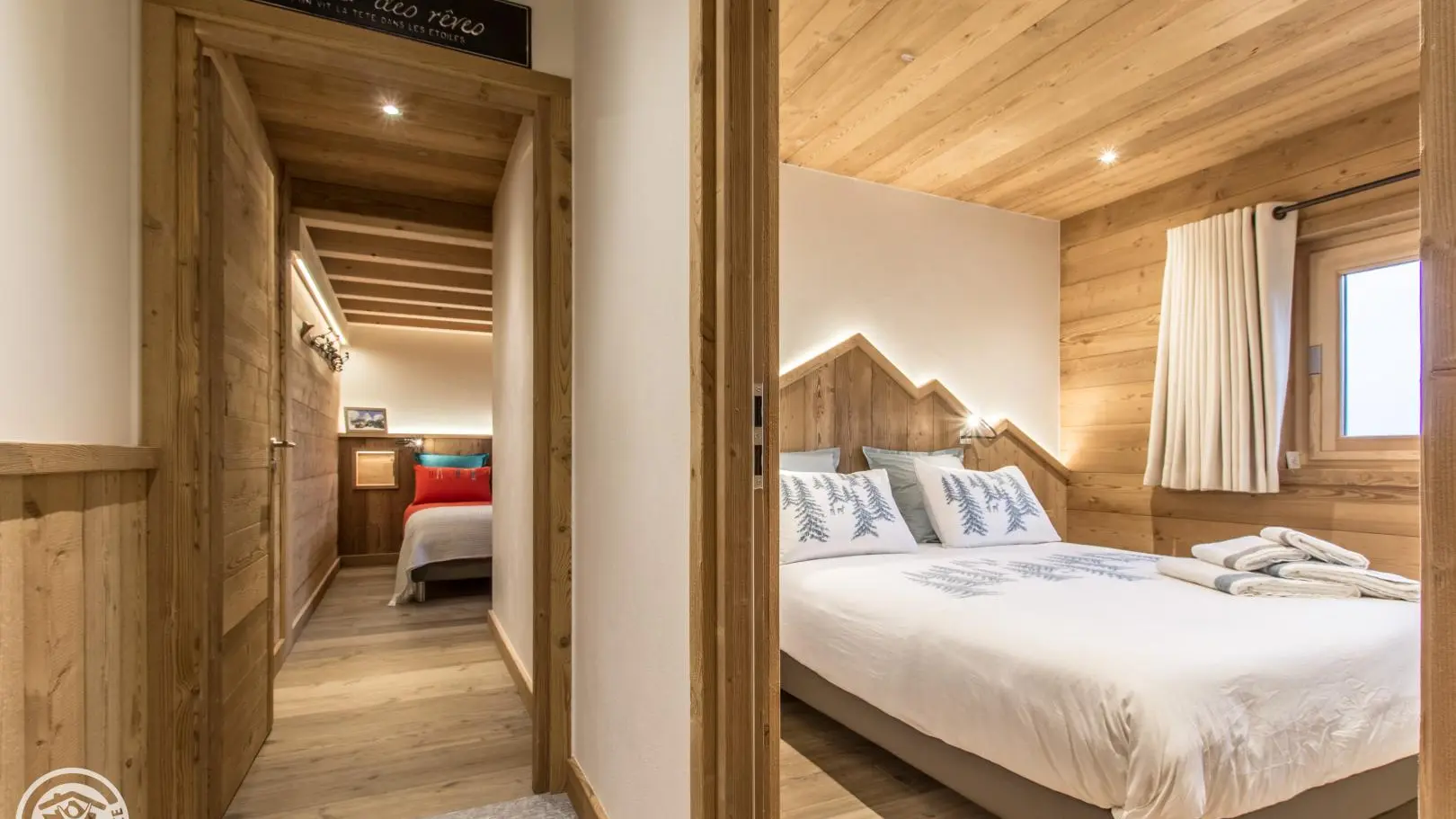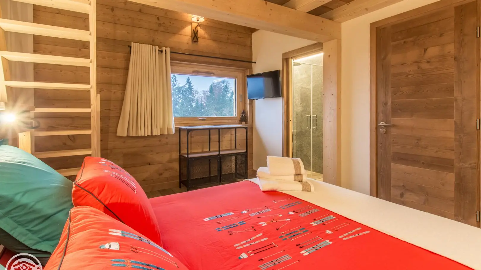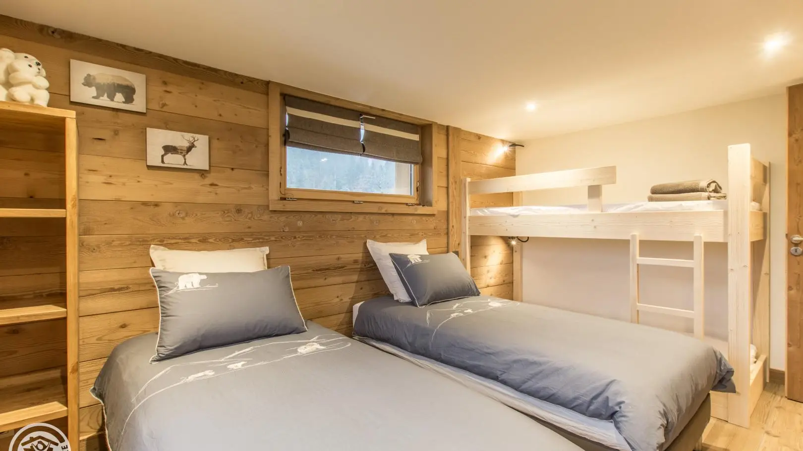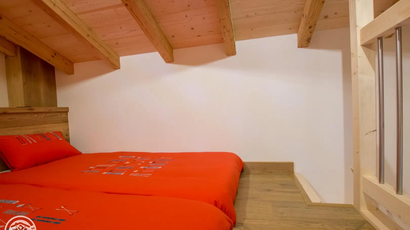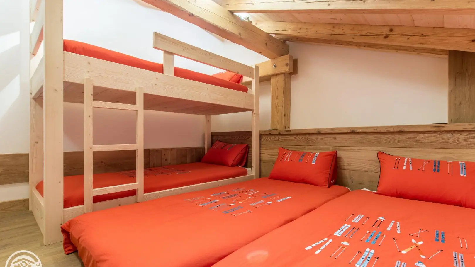 Au 1er: local skiroom, buanderie, chambre 1 (2 lits 90x200cm jumelables, 2 lits 90x200cm superposés, Tv), chambre 2 (1 lit 160x200cm, Tv), chambre 3 (1 lit 160x200cm, Tv), chambre 4 (1 lit 160x200cm, Tv + mezzanine avec accès par escalier raide : 2 lits 90x200cm superposés + 2 lits d'appoints 90cm). Au 2ème : pièce de vie avec coin cuisine intégré ouvert sur espace repas et coin salon (poêle à bois, Tv, canapé).