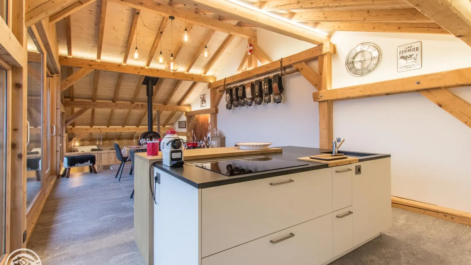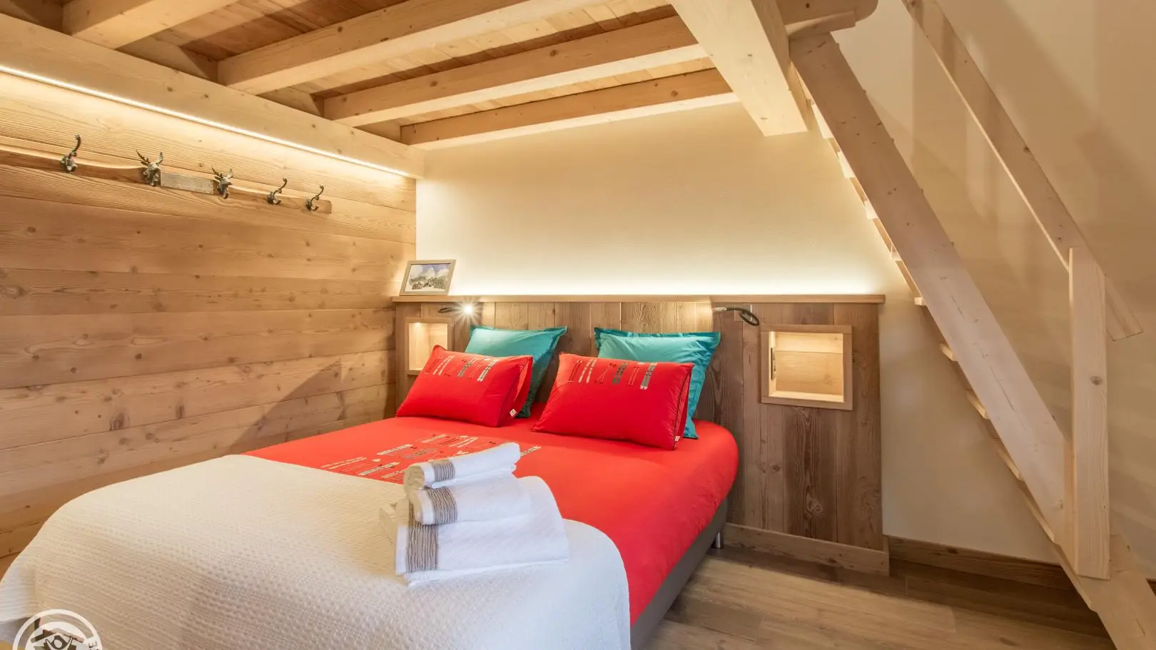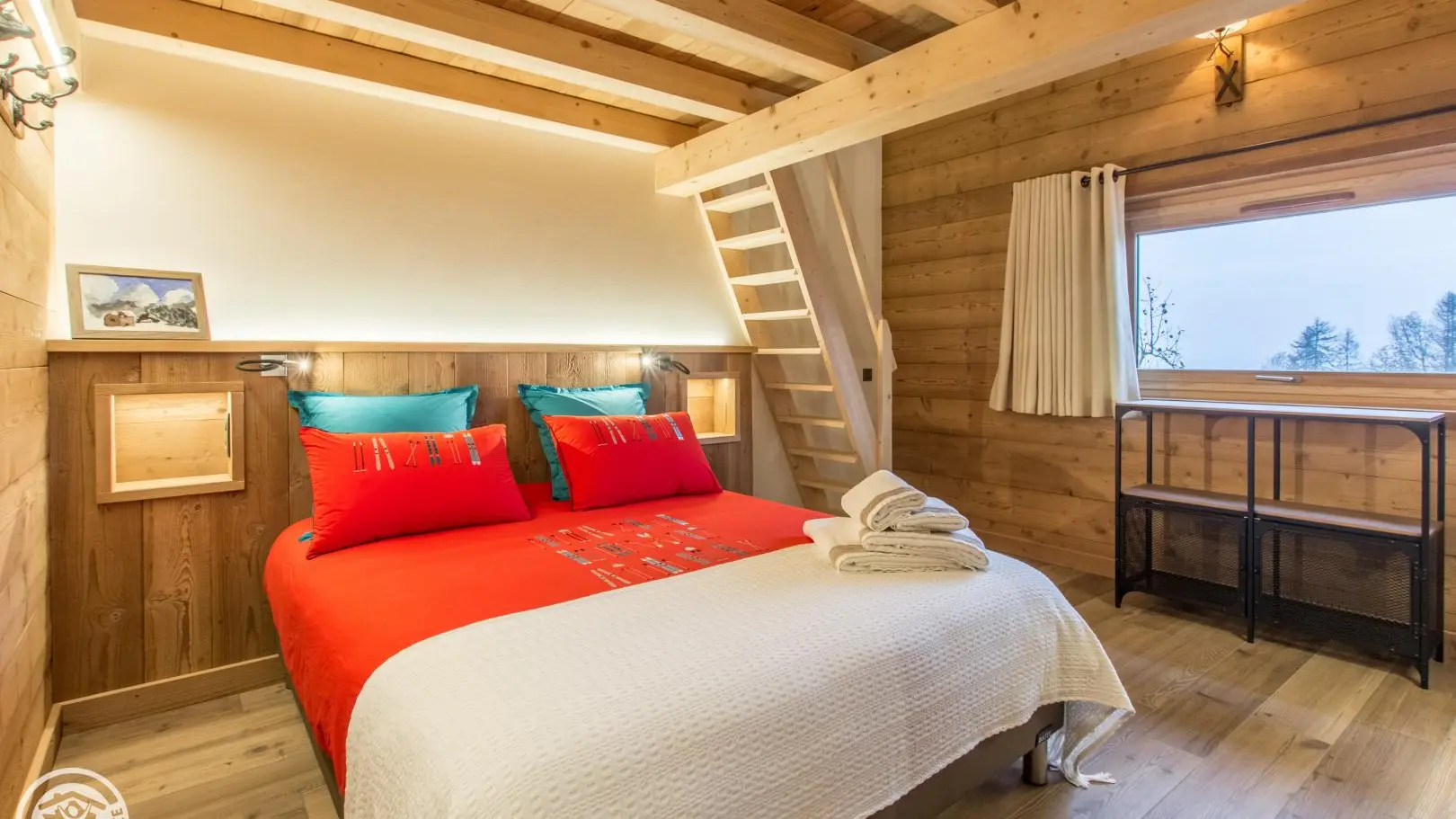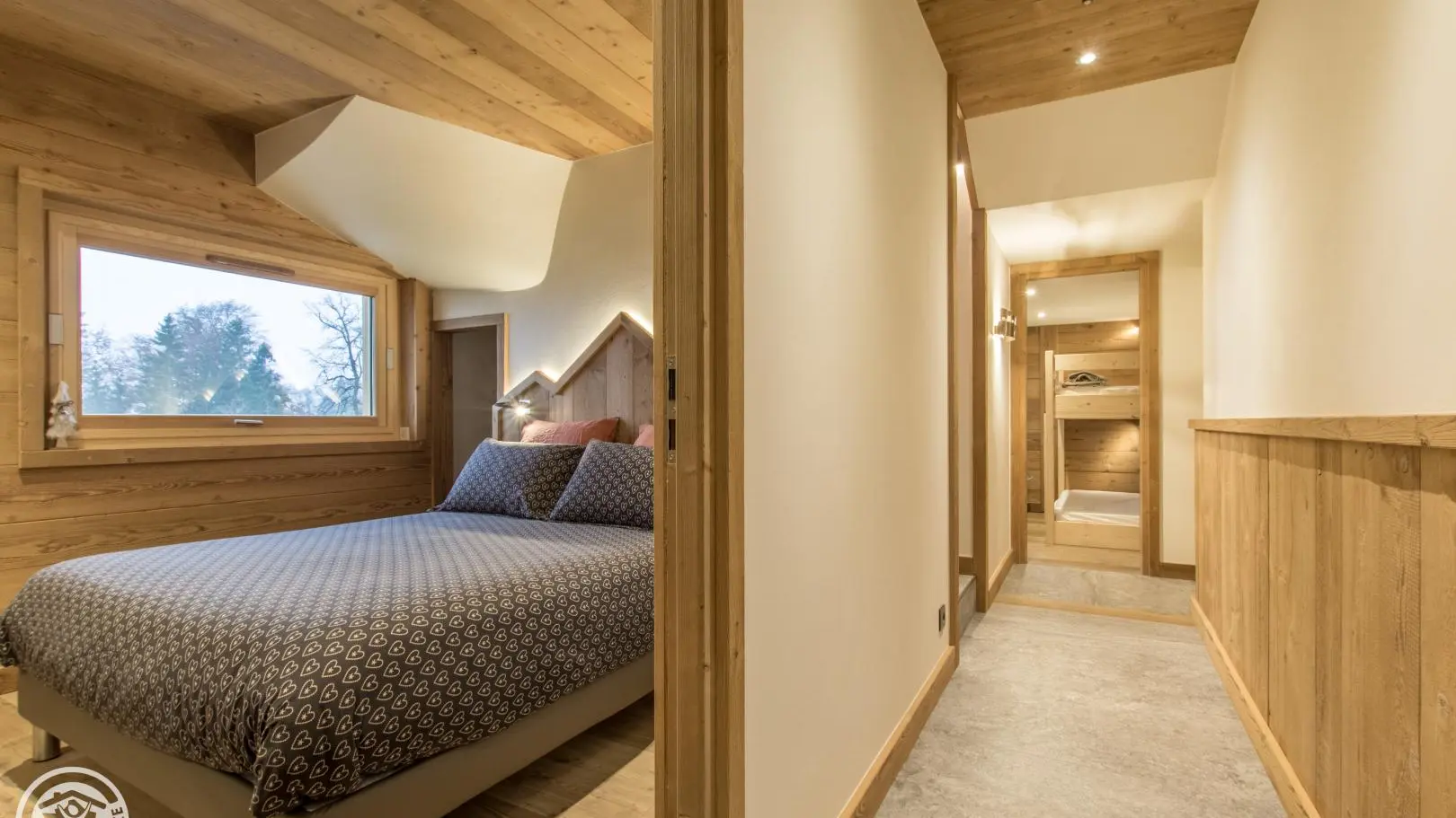Au 1er: local skiroom, buanderie, chambre 1 (2 lits 90x200cm jumelables, 2 lits 90x200cm superposés, Tv), chambre 2 (1 lit 160x200cm, Tv), chambre 3 (1 lit 160x200cm, Tv), chambre 4 (1 lit 160x200cm, Tv + mezzanine avec accès par escalier raide : 2 lits 90x200cm superposés + 2 lits d'appoints 90cm). Au 2ème : pièce de vie avec coin cuisine intégré ouvert sur espace repas et coin salon (poêle à bois, Tv, canapé).