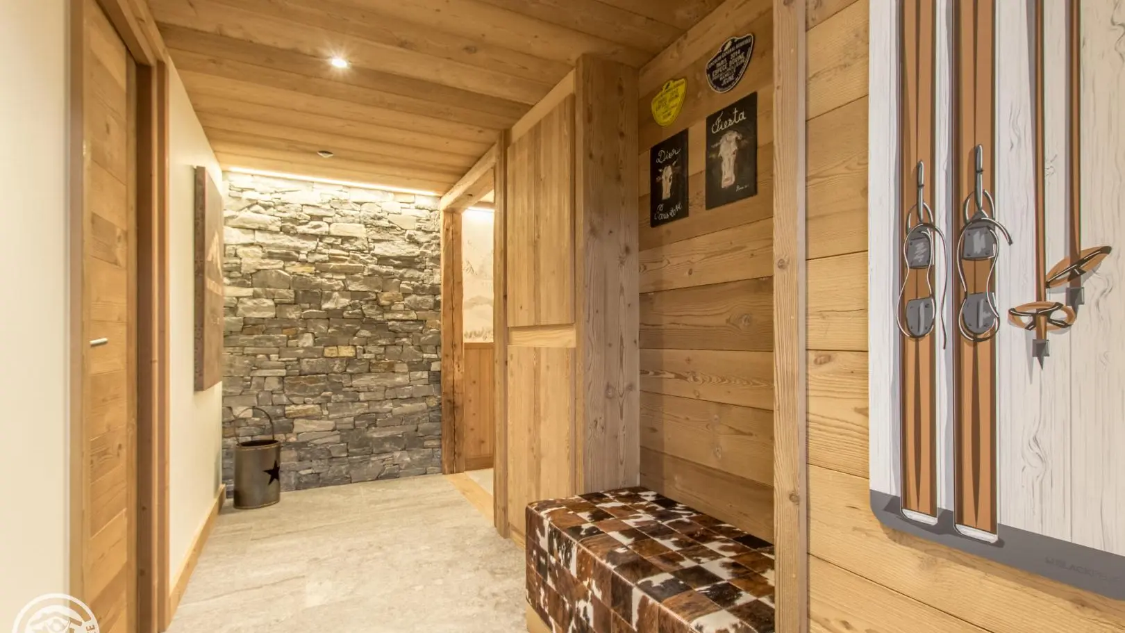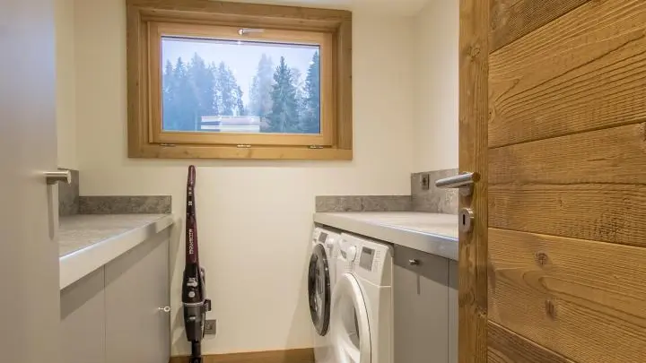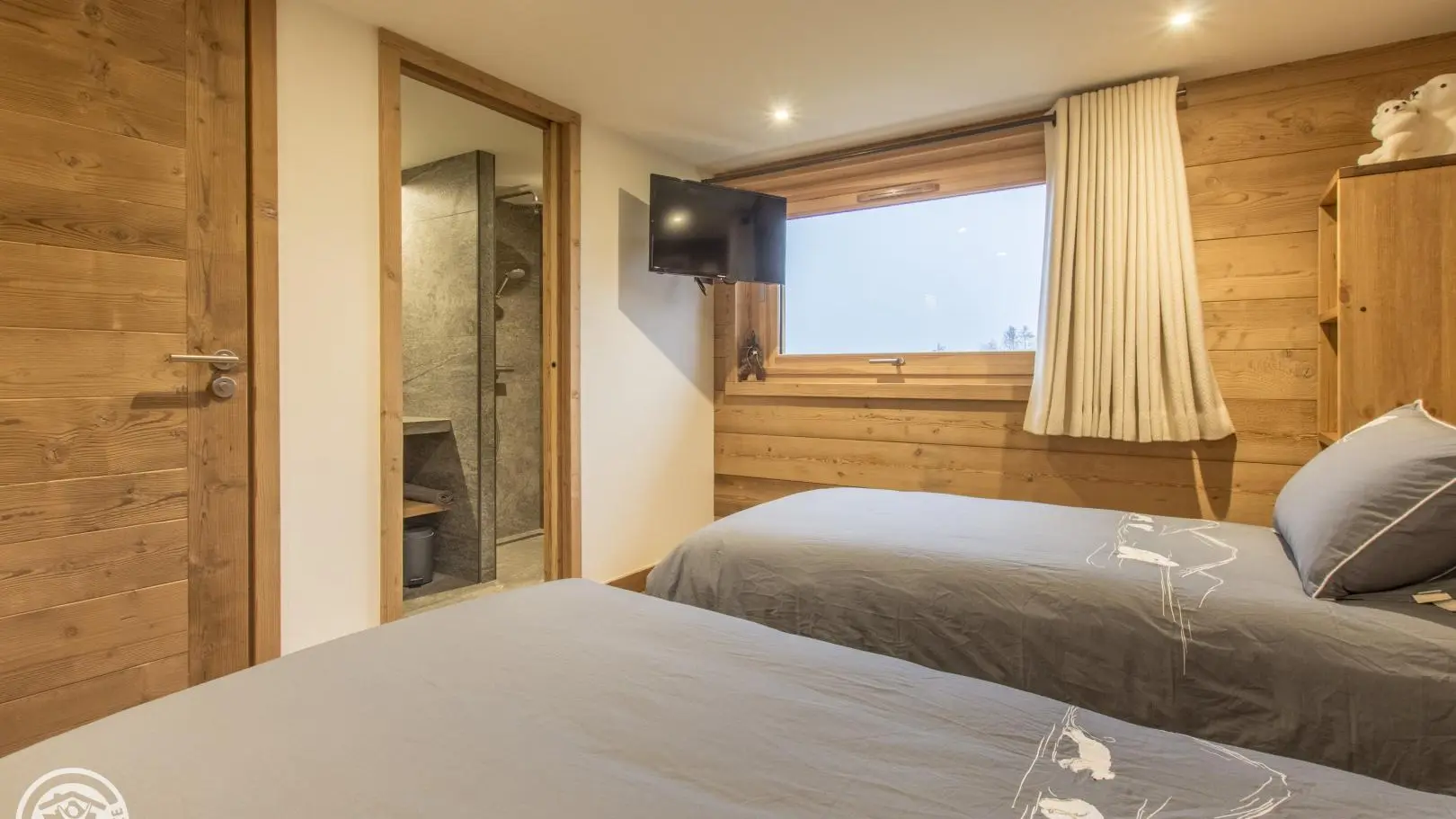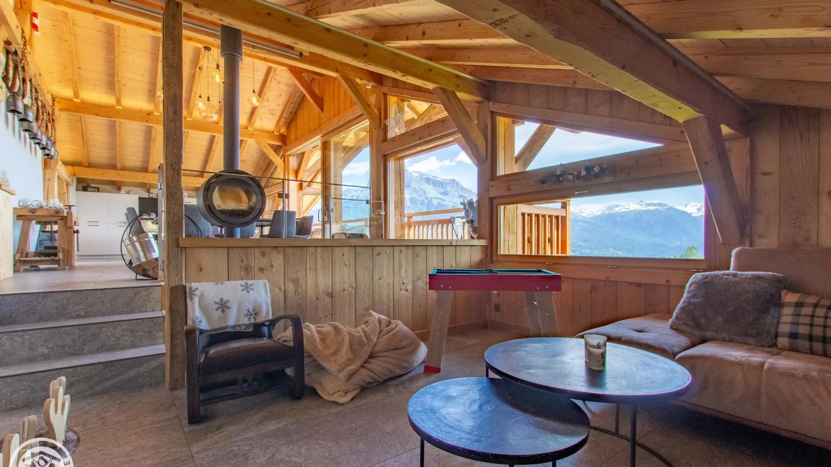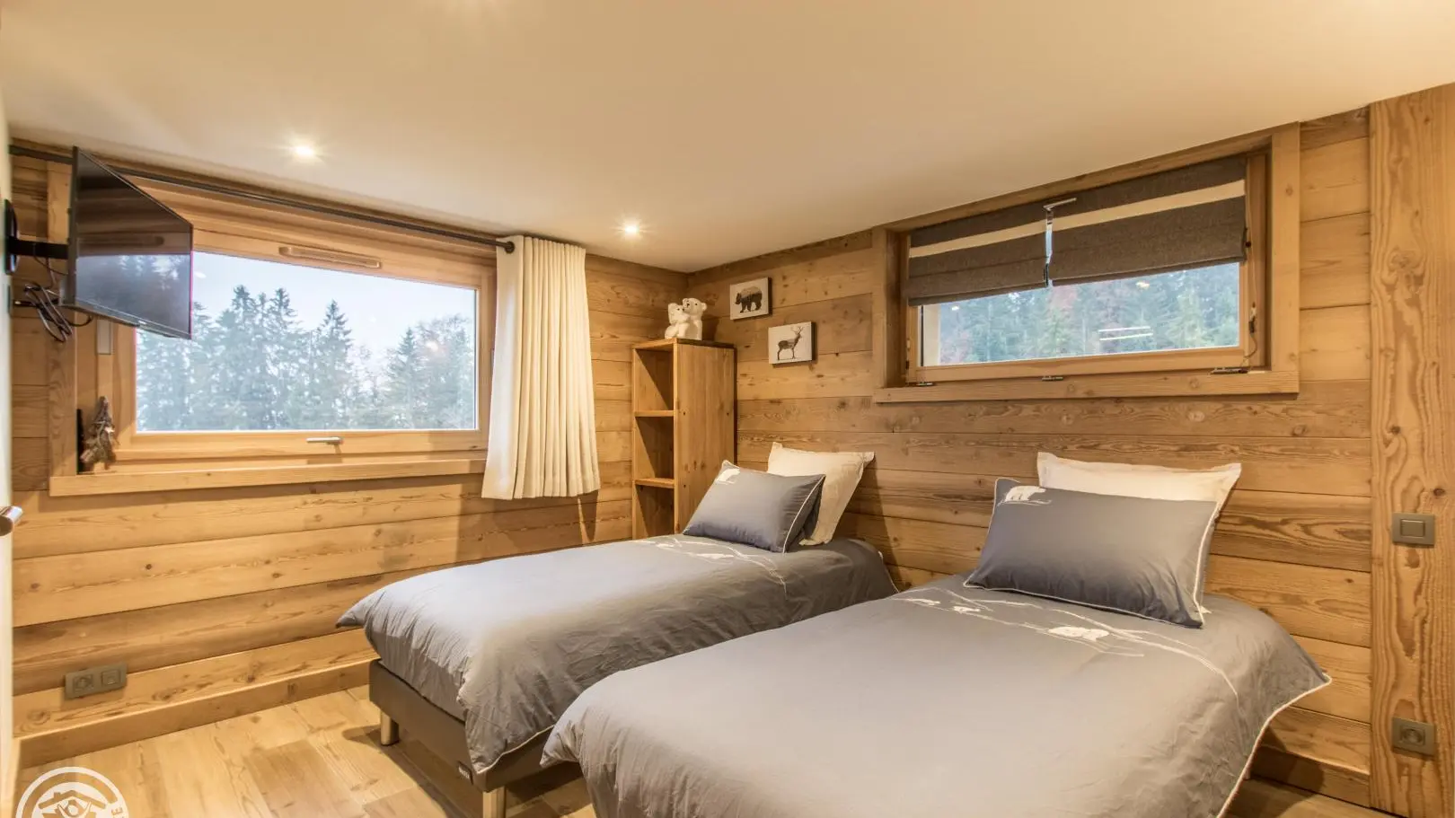 Au 1er: local skiroom, buanderie, chambre 1 (2 lits 90x200cm jumelables, 2 lits 90x200cm superposés, Tv), chambre 2 (1 lit 160x200cm, Tv), chambre 3 (1 lit 160x200cm, Tv), chambre 4 (1 lit 160x200cm, Tv + mezzanine avec accès par escalier raide : 2 lits 90x200cm superposés + 2 lits d'appoints 90cm). Au 2ème : pièce de vie avec coin cuisine intégré ouvert sur espace repas et coin salon (poêle à bois, Tv, canapé).
