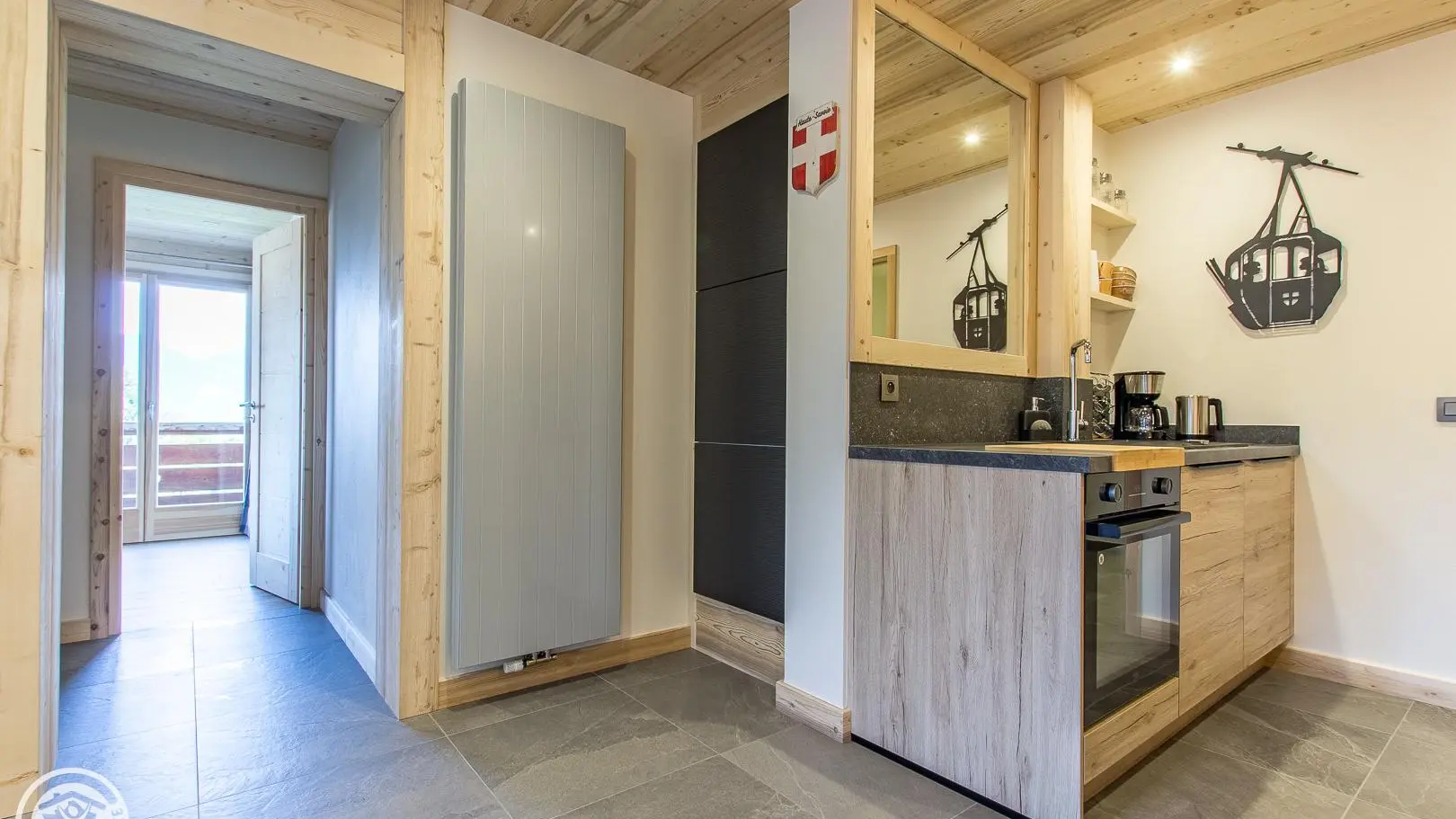 Entrée depuis la terrasse : cuisine intégrée ouverte sur la partie séjour (Tv, canapé convertible rapido offrant un confortable couchage d'appoint 140x190cm), cellier/buanderie, chambre (1 lit 160x200cm), salle d'eau avec douche et wc.