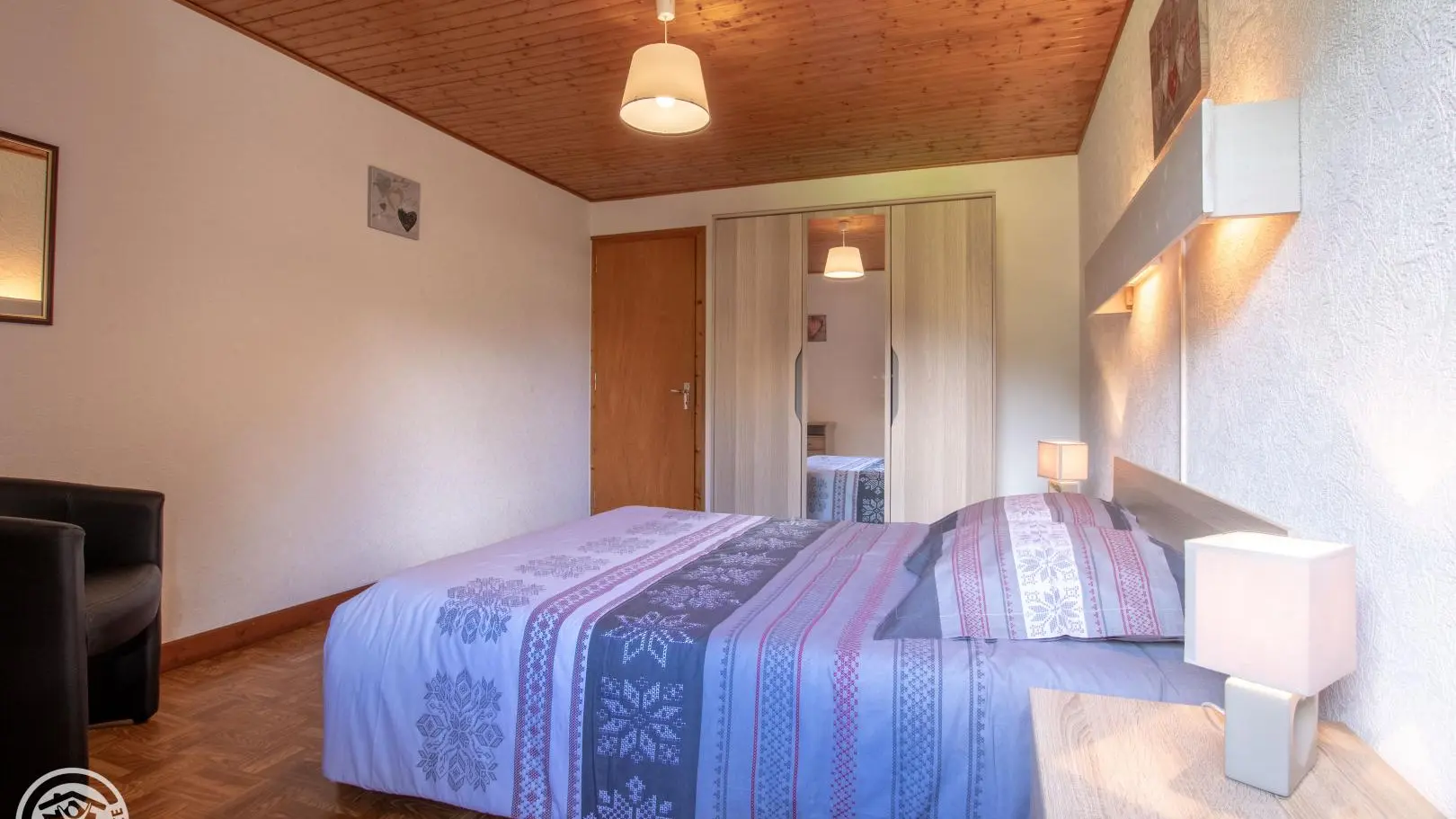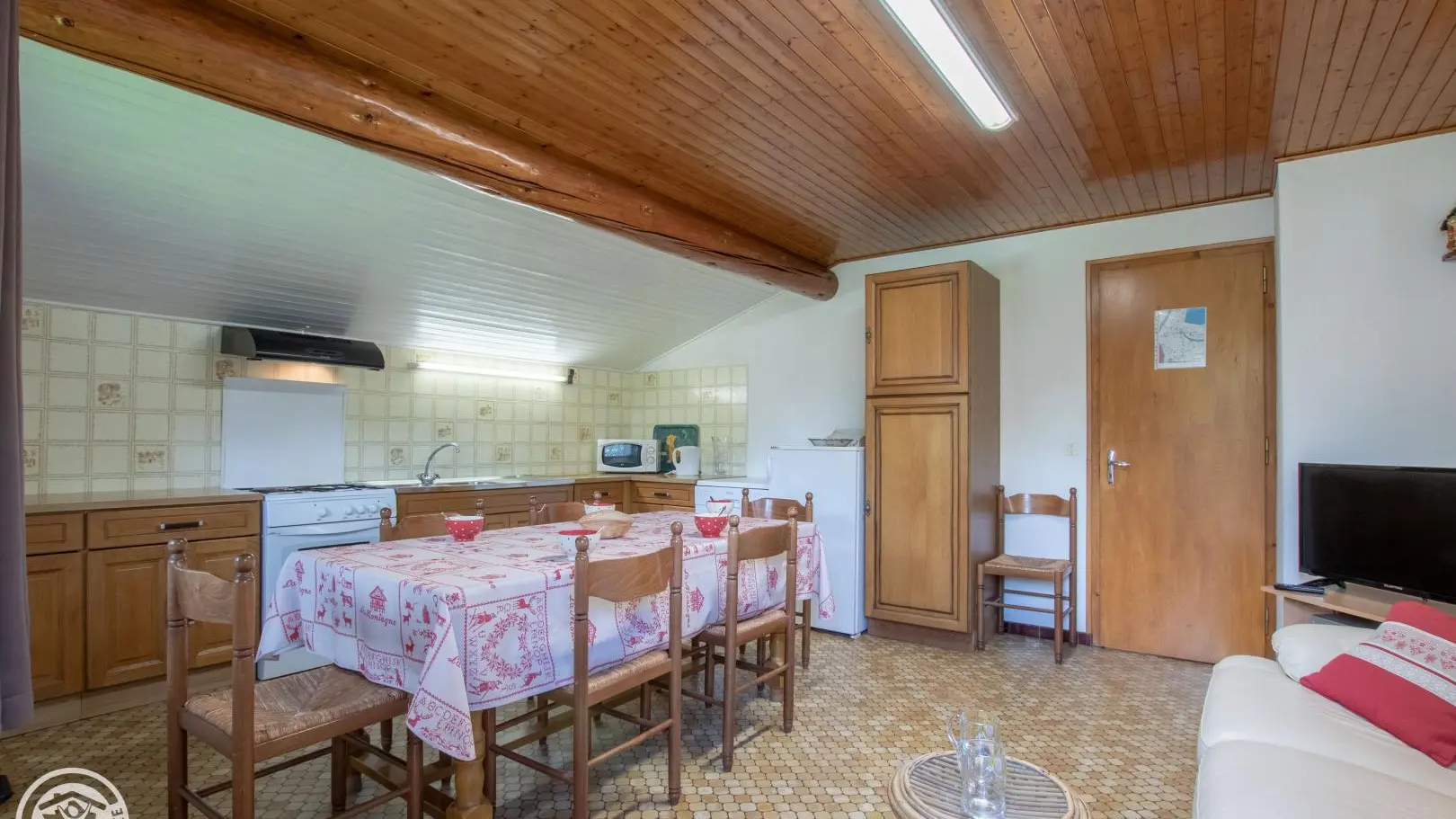 Gîte de 70 m2 au 2ème étage du chalet des propriétaires comprenant un 2nd gîte. Cuisine-séjour (four). 3 chambres (2 lits 2 pers., 3 lits 1 pers.). Bains, wc. Lave et séche-linge commun, buanderie. Chauffage central. Balcon, parking, pelouse, salon de ...