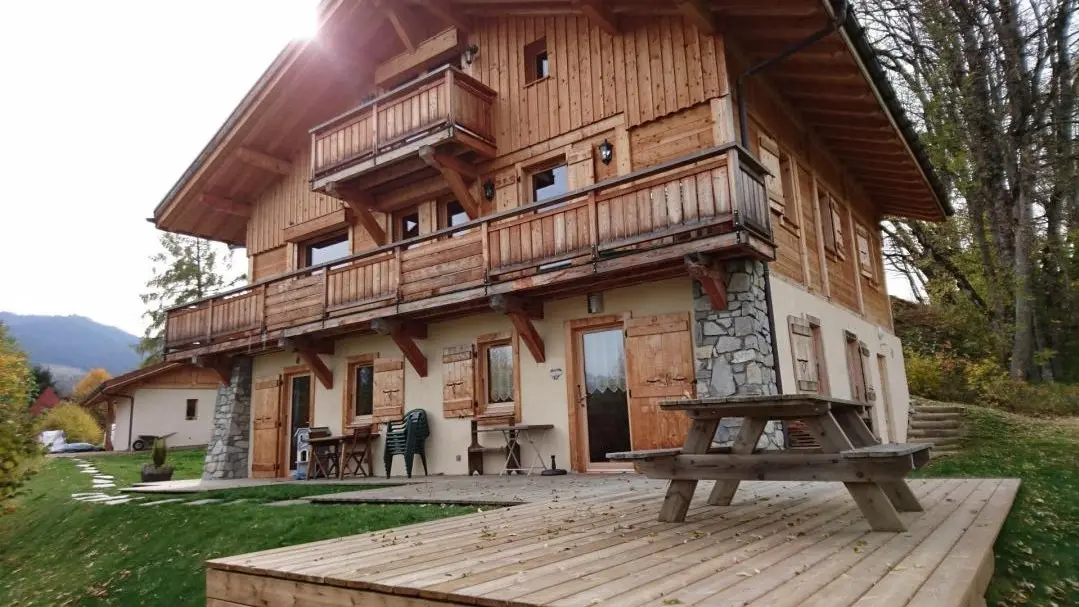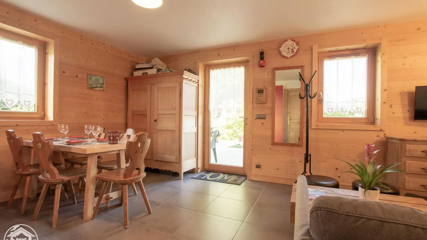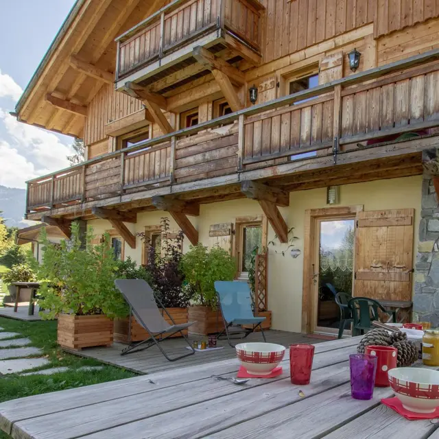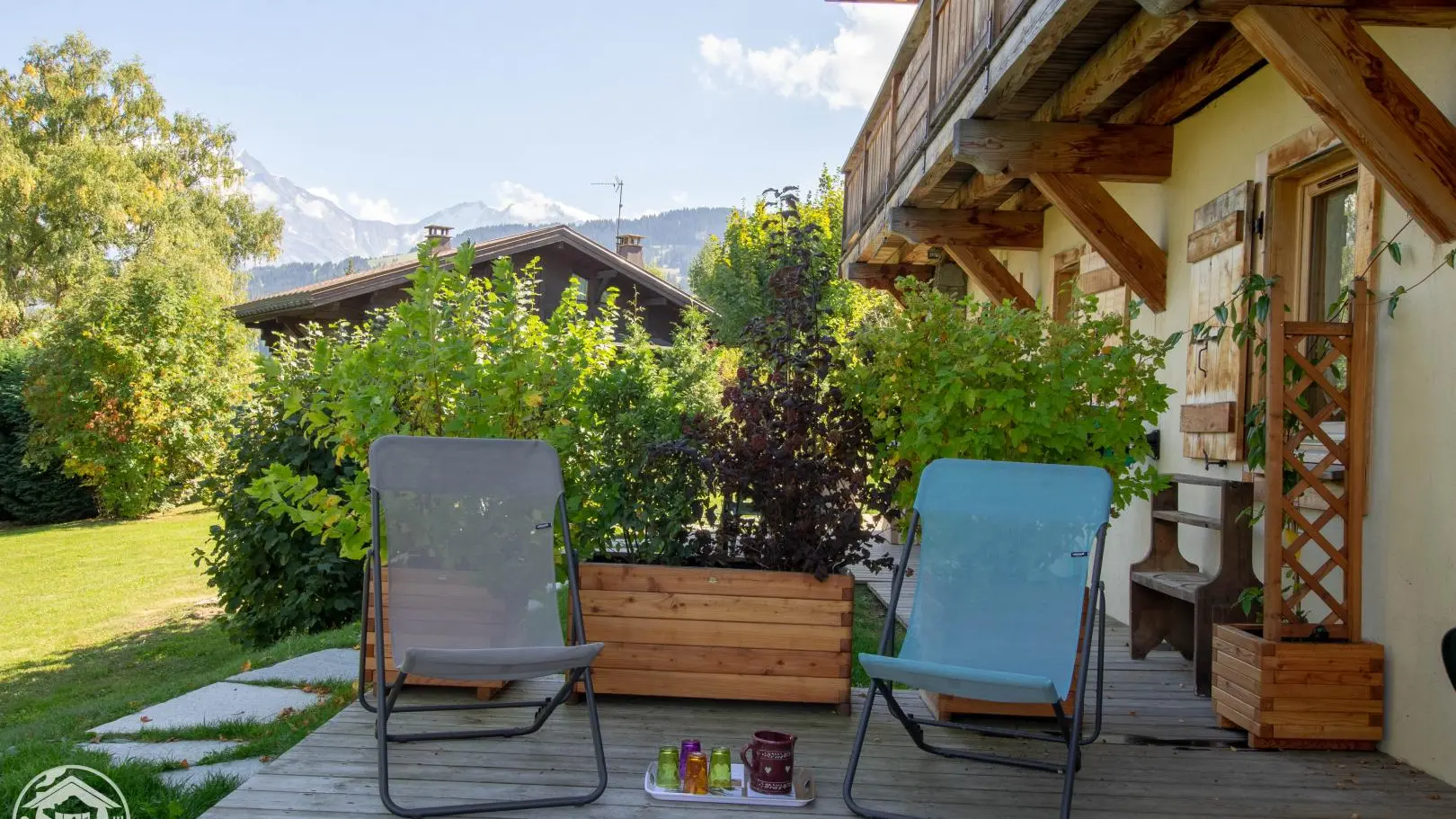 Terrasse bois privative avec mobilier de jardin, transats, barbecue électrique. Centre village de Combloux à 2km (commerces, animations). Domaine skiable de Combloux 1,8km, Megève/St-Gervais 2,1km (télécabine de la Princesse). En été, baignade au plan d'eau biotope de Combloux à 2km. Megève (Palais des sports, piscine) à 4km, Sallanches à 7km, Thermes de Saint-Gervais à 13km. Chamonix à 40 minutes en voiture environ (31km).