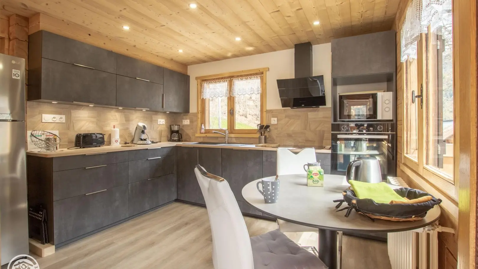 Au cœur de la vallée du Bouchet, chalet indépendant de 140 m2 sur 2 niveaux. Rez-de-chaussée (depuis arrière): cuisine / salle à manger, salon (banquette, poêle à bois), Chambre 1 (1 lit 160), salle d'eau, wc indépendant, cellier.