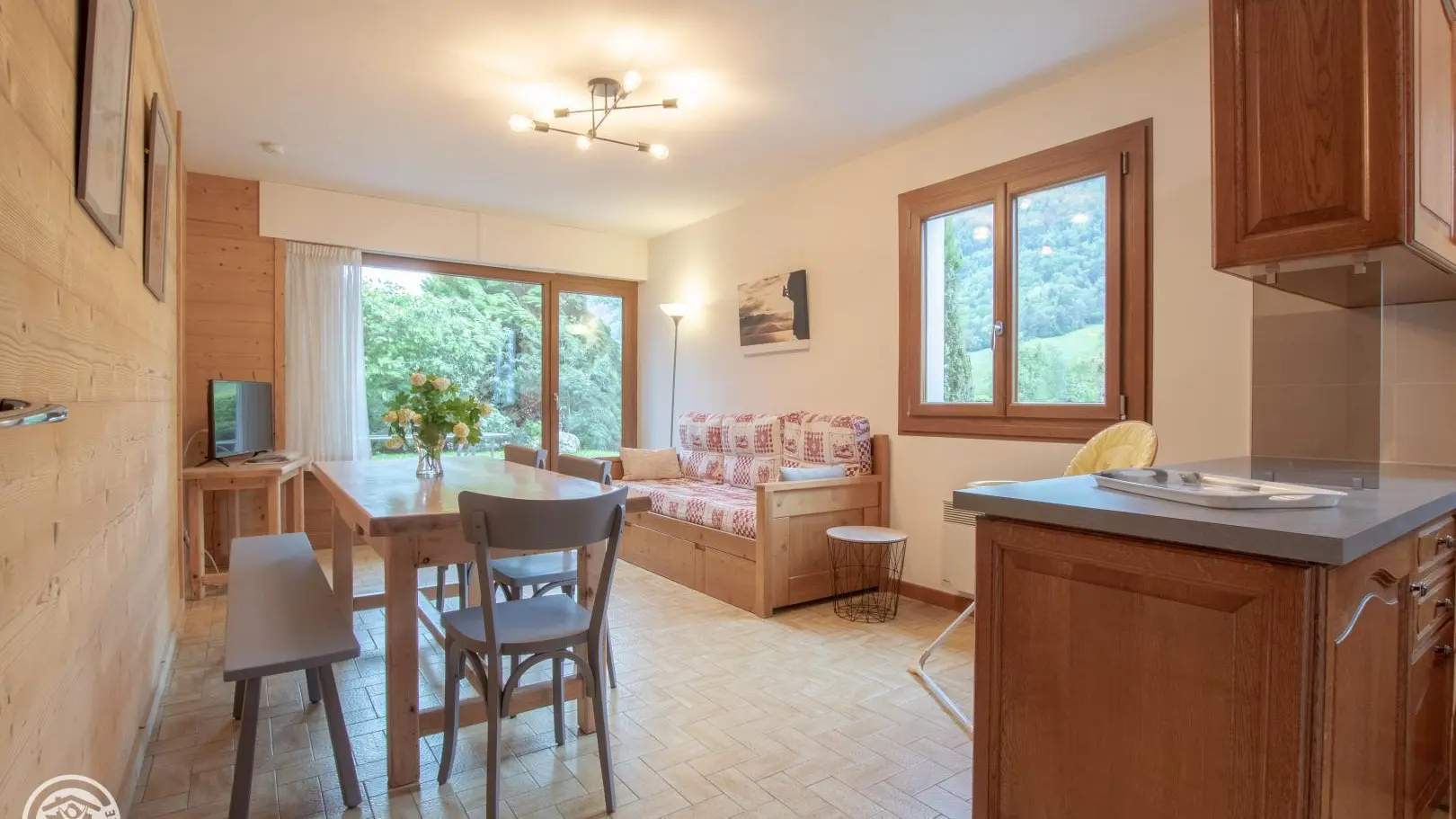 Entre lac d'Annecy et stations des Aravis, gîte de 60 m2 au 1er niveau d'une grande maison comprenant d'autres logements. Coin-cuisine-séjour (banquette), chambre 1 (1 lit 160 cm), chambre 2 ( 2 lits 90 jumelables). Salle d'eau, wc indépendant. Terrasse de plain pied, terrain, jeux, transats. Sur demande, lit bébé et garage à vélo. Possibilité de location : draps / linge de toilette / linge de maison. Lac d'Annecy à 5 km. Stations de La Clusaz et du Grand-Bornand à 20 km, Manigod, La Croix Fry à 15 km. Château de Menthon Saint Bernard à 5 km.
