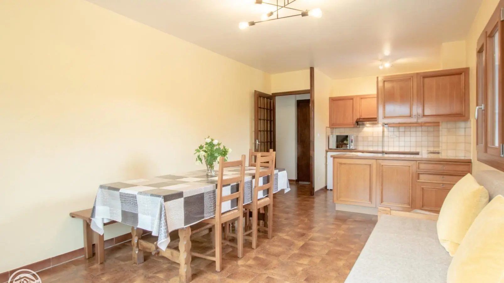 Dans une grande maison comportant plusieurs logements dont 5 gîtes labellisés, gîte de 54m² avec balcon aménagé au 2em niveau. Hall d'entrée, cuisine ouverte sur séjour (banquette), accès au balcon. Chambre 1 ( 1 lit 140x190cm), chambre 2 ( 2 lits 90x190cm jumelables). Salle d'eau (douche, lave-linge), wc indépendant. Balcon avec salon de jardin, terrain/jardin commun avec jeux. Sur demande, lit bébé et garage à vélos. Possibilité de location de draps et linge de toilette.