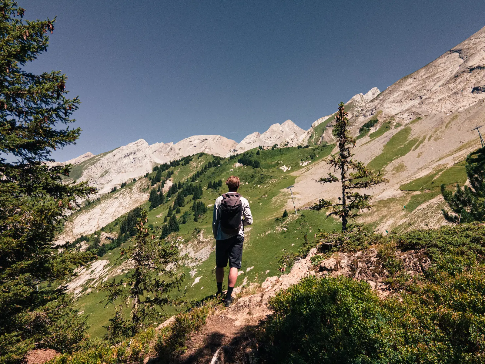 La montée en télésiège permet d'apprécier le panorama sur la Chaîne des Aravis. Une fois au sommet des remontées mécaniques, la balade débute par un sentier descendant en forêt et se poursuit par le chemin de La Motte et le sentier du Bois du Plan, serpentant entre les arbres. Ce parcours au profil descendant et ombragé est idéal aux heures les plus chaudes de la journée.
