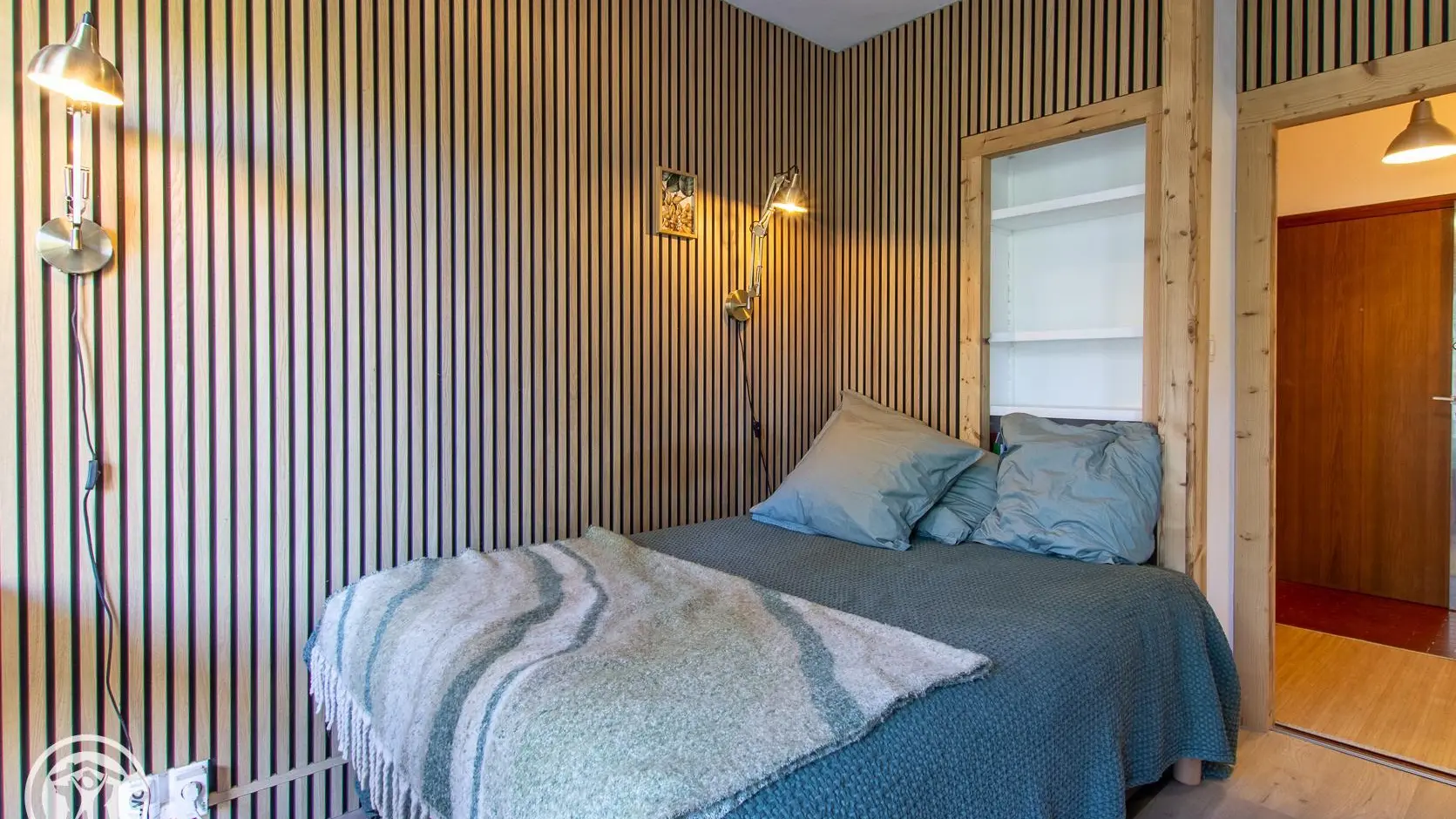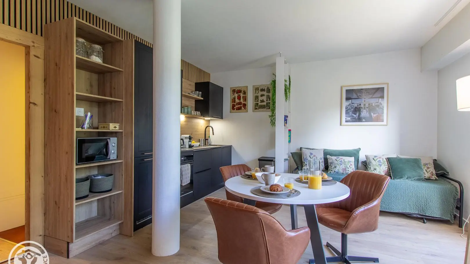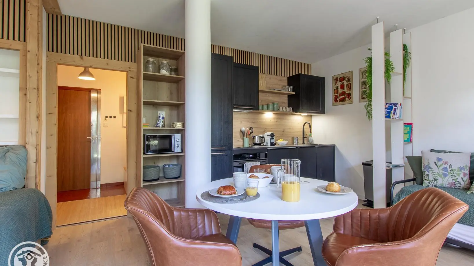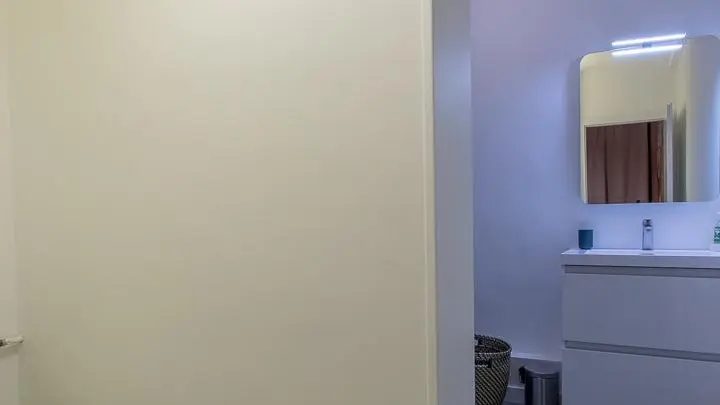 Hall d'entrée avec rangement, pièce de vie avec coin cuisine intégré ouvert sur la partie séjour (Tv, 1 lit 140x190cm, banquette-lit gigogne offrant 2 couchages 90x190cm, table de repas avec fauteuils), salle d'eau (cabine douche, wc, lave-linge). Internet wifi.