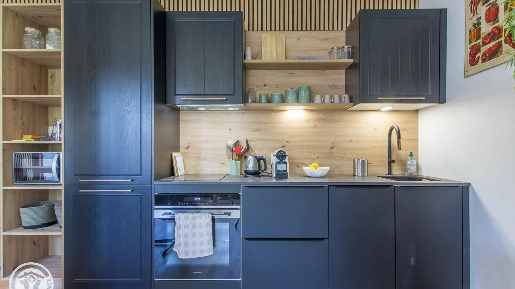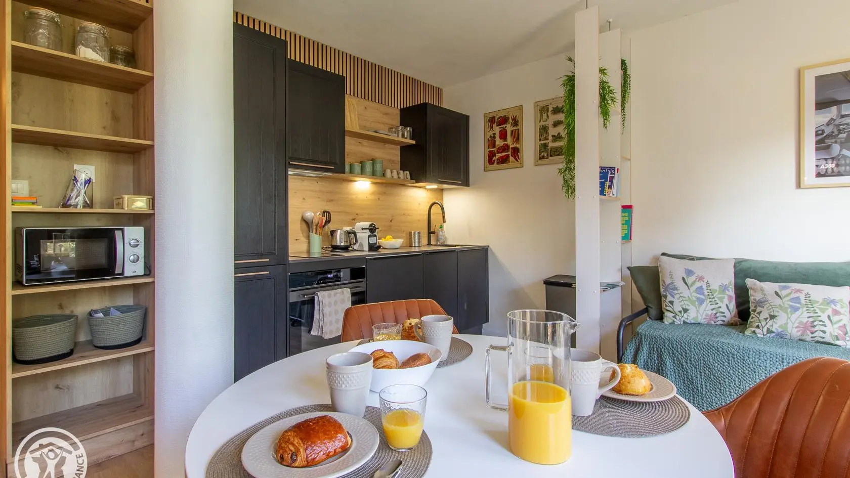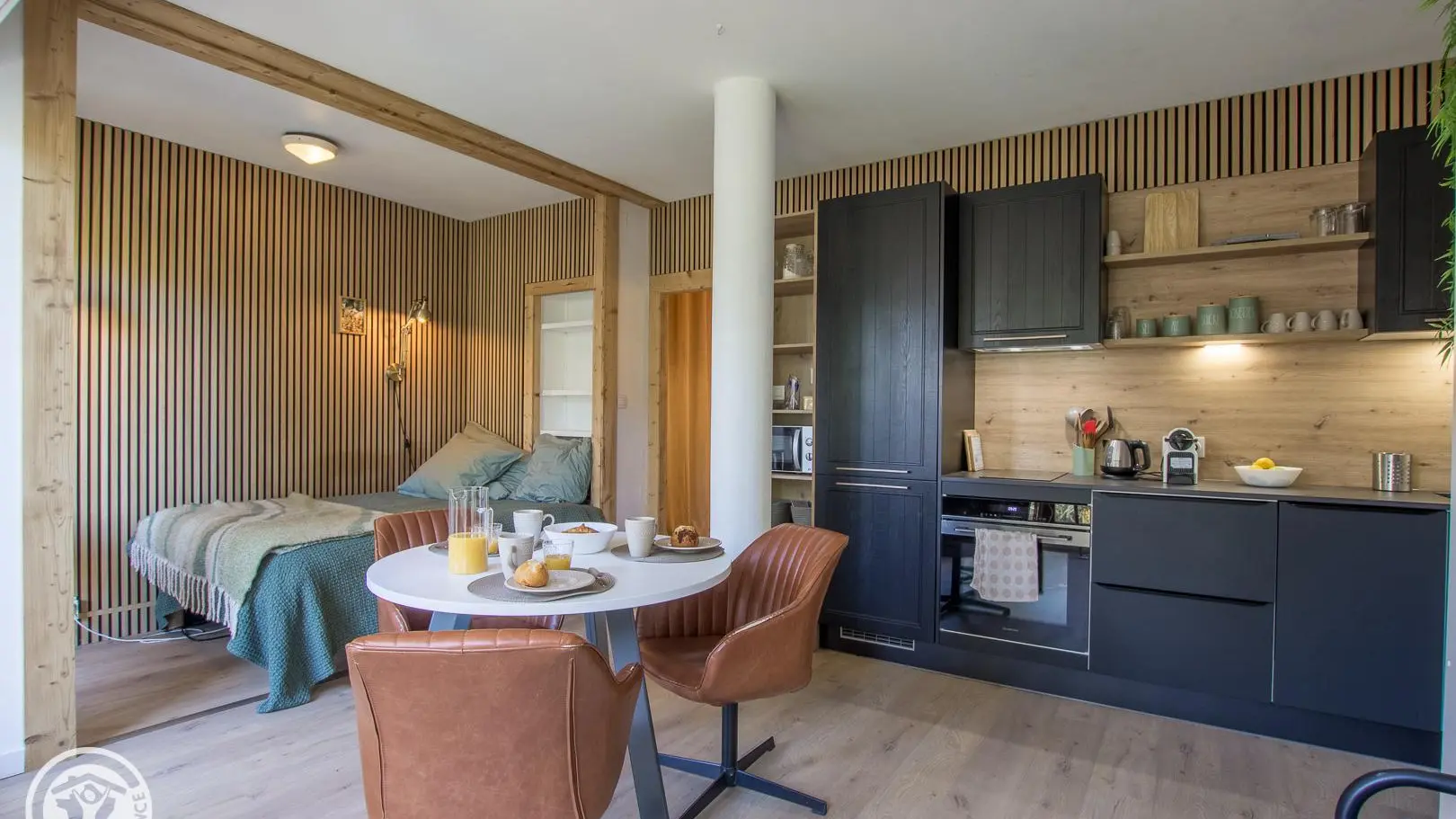 Hall d'entrée avec rangement, pièce de vie avec coin cuisine intégré ouvert sur la partie séjour (Tv, 1 lit 140x190cm, banquette-lit gigogne offrant 2 couchages 90x190cm, table de repas avec fauteuils), salle d'eau (cabine douche, wc, lave-linge). Internet wifi.