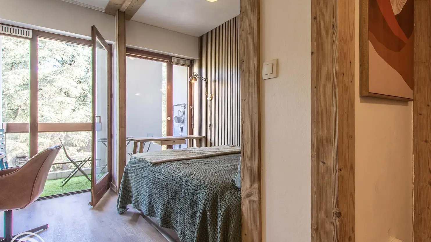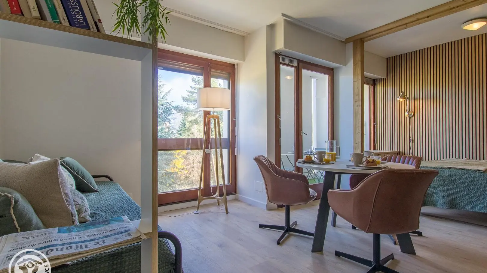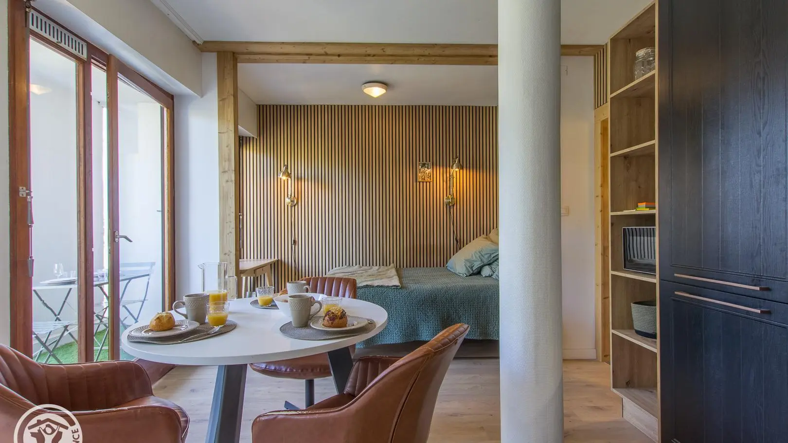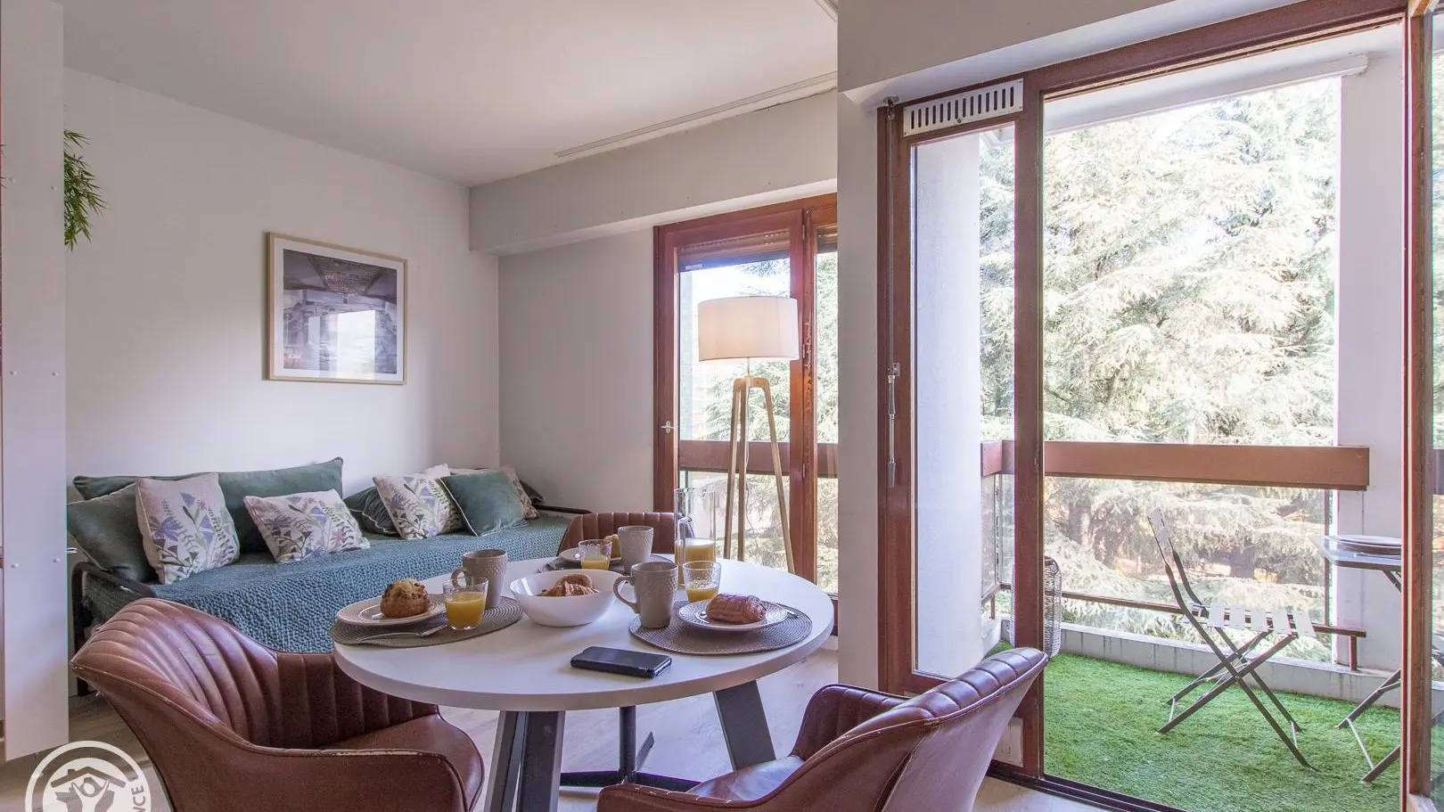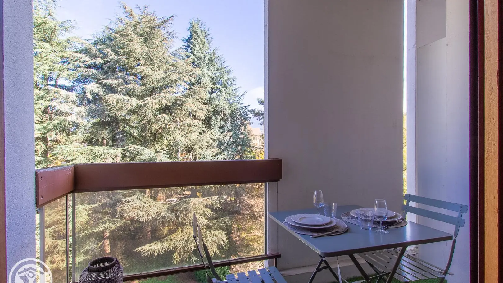 Balcon avec table et 4 chaises face au parc de la copropriété.