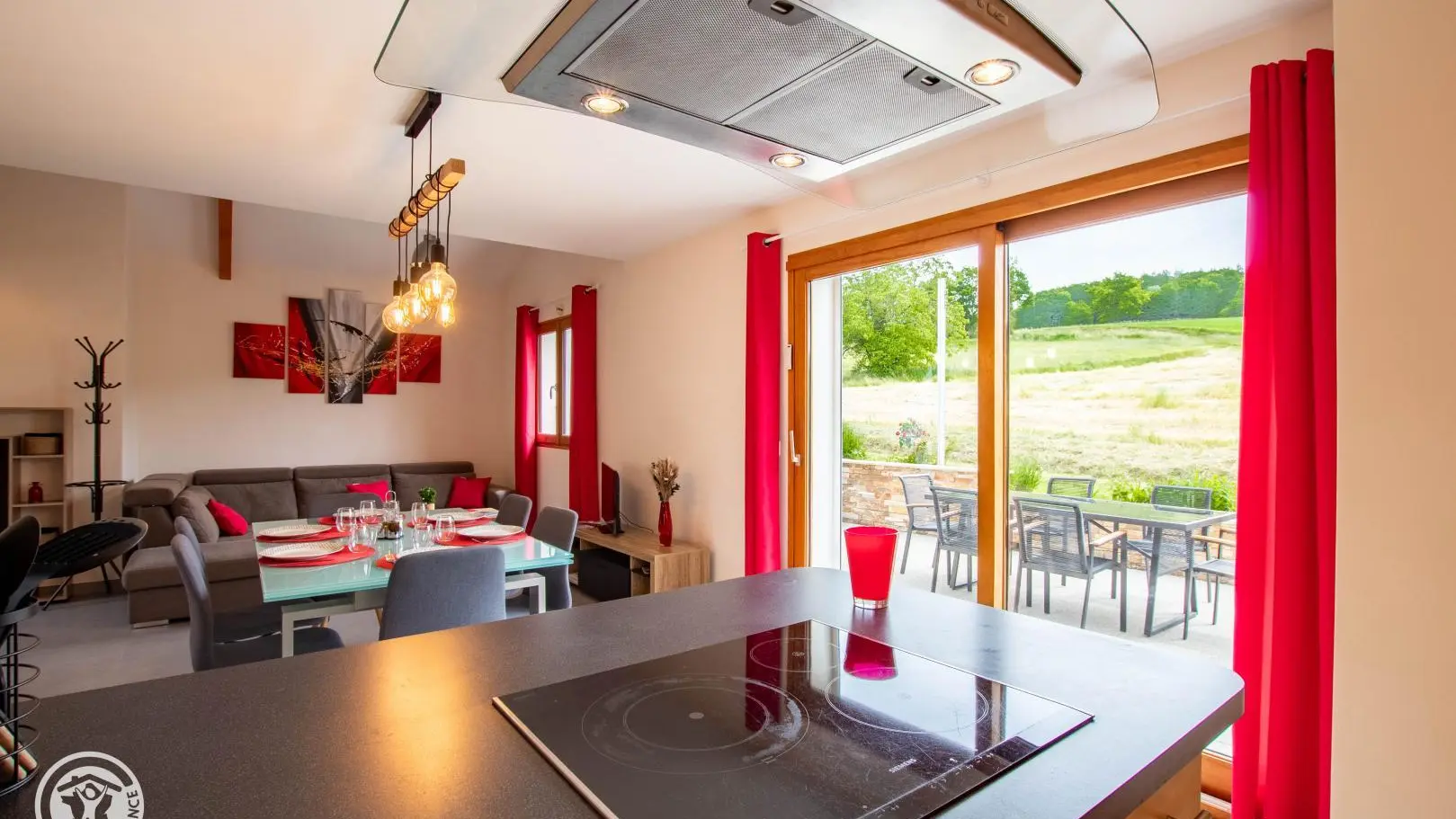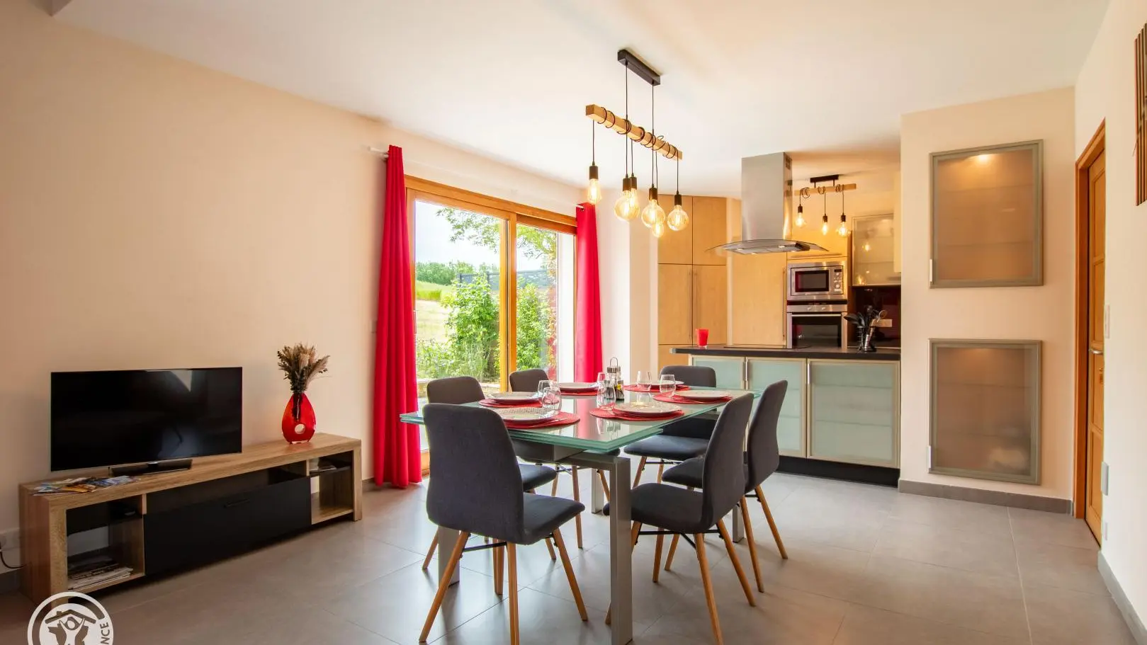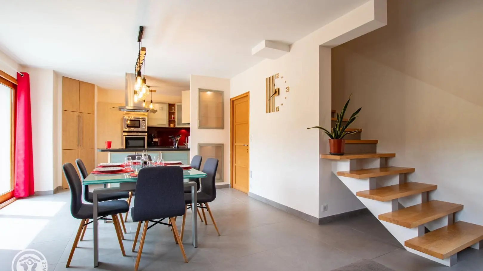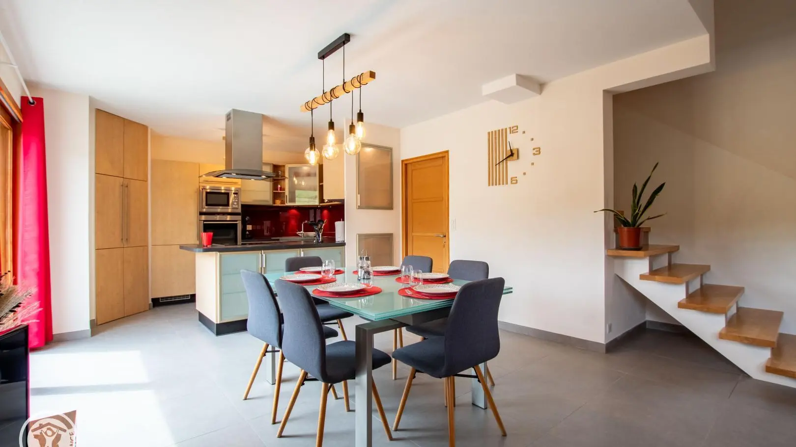 Au rez-de-chaussée, pièce de vie comprenant une cuisine ouverte sur séjour et sa table de repas, le salon avec télévision, canapé d’angle et baie-vitrée donnant accès à la terrasse.