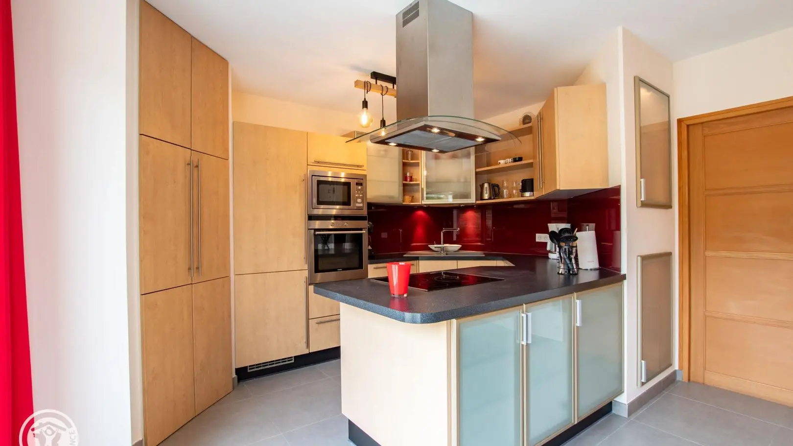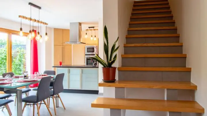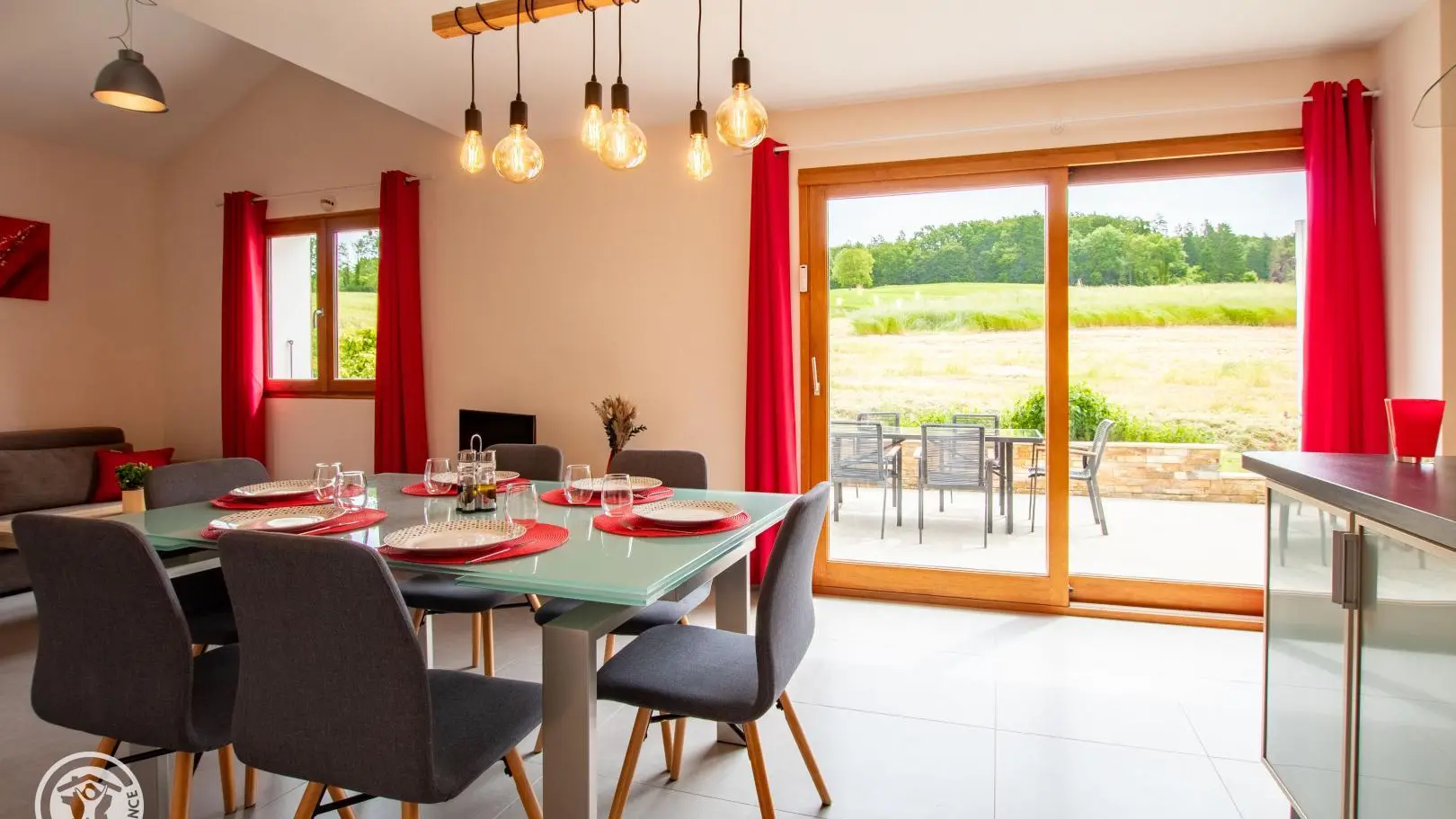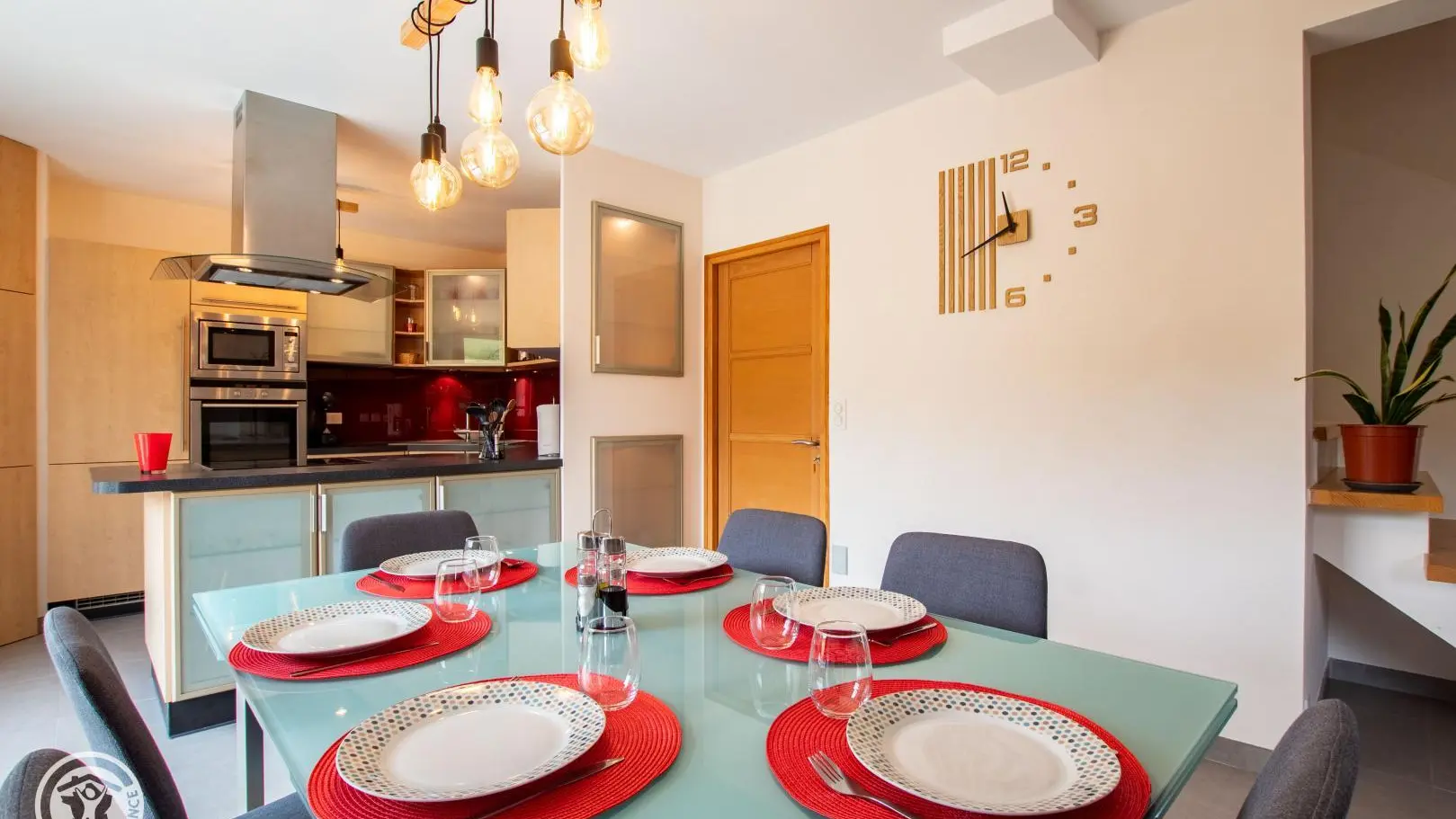 Au rez-de-chaussée, pièce de vie comprenant une cuisine ouverte sur séjour et sa table de repas, le salon avec télévision, canapé d’angle et baie-vitrée donnant accès à la terrasse.