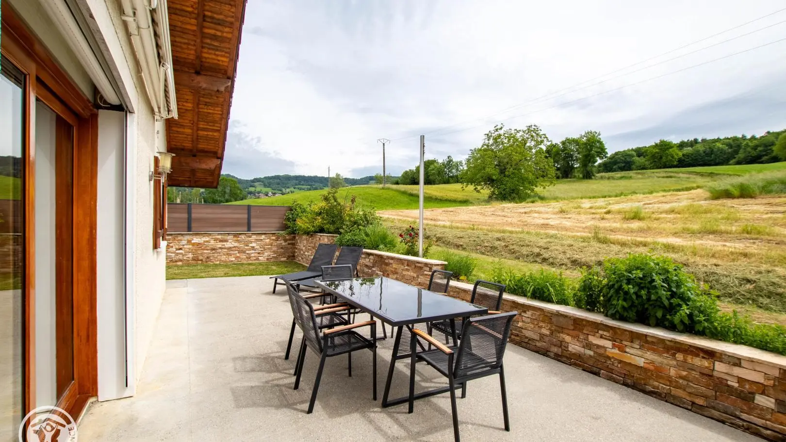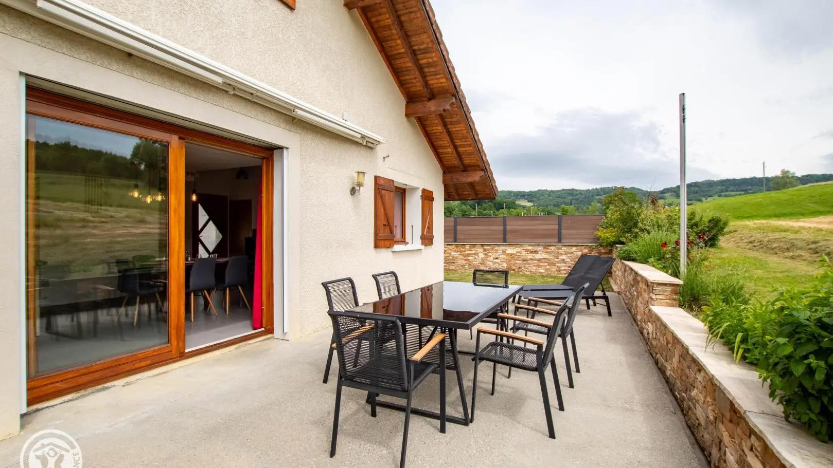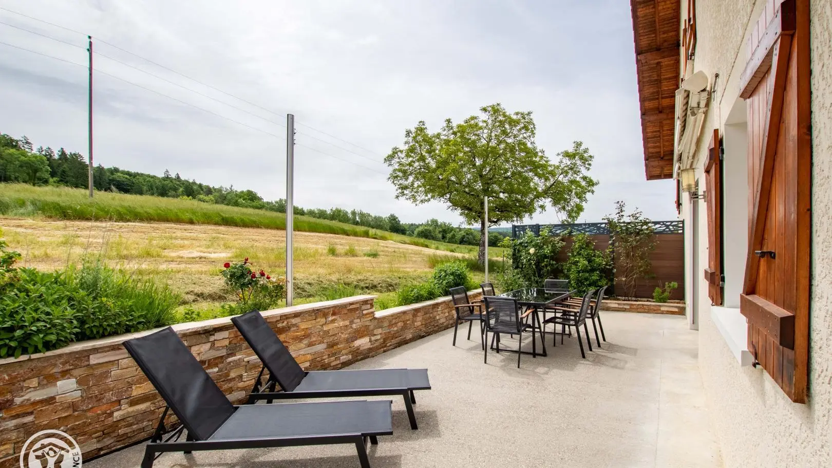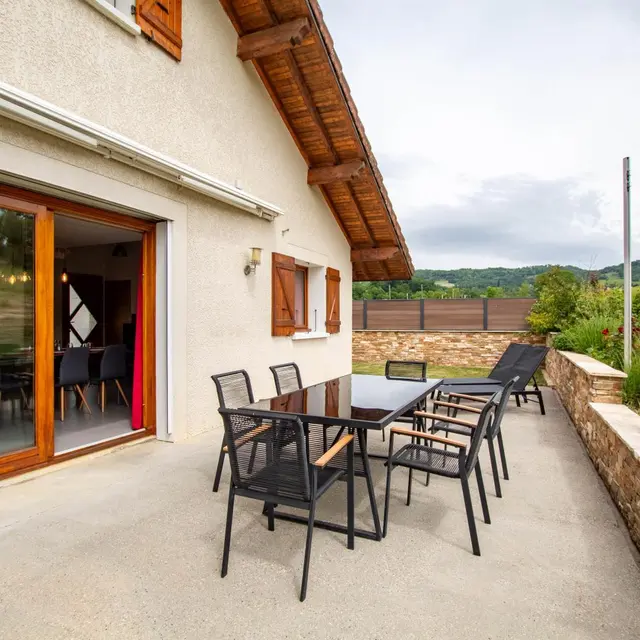 Terrasse avec table de repas, transats et store-banne, barbecue charbon.