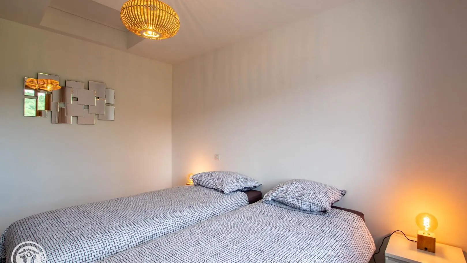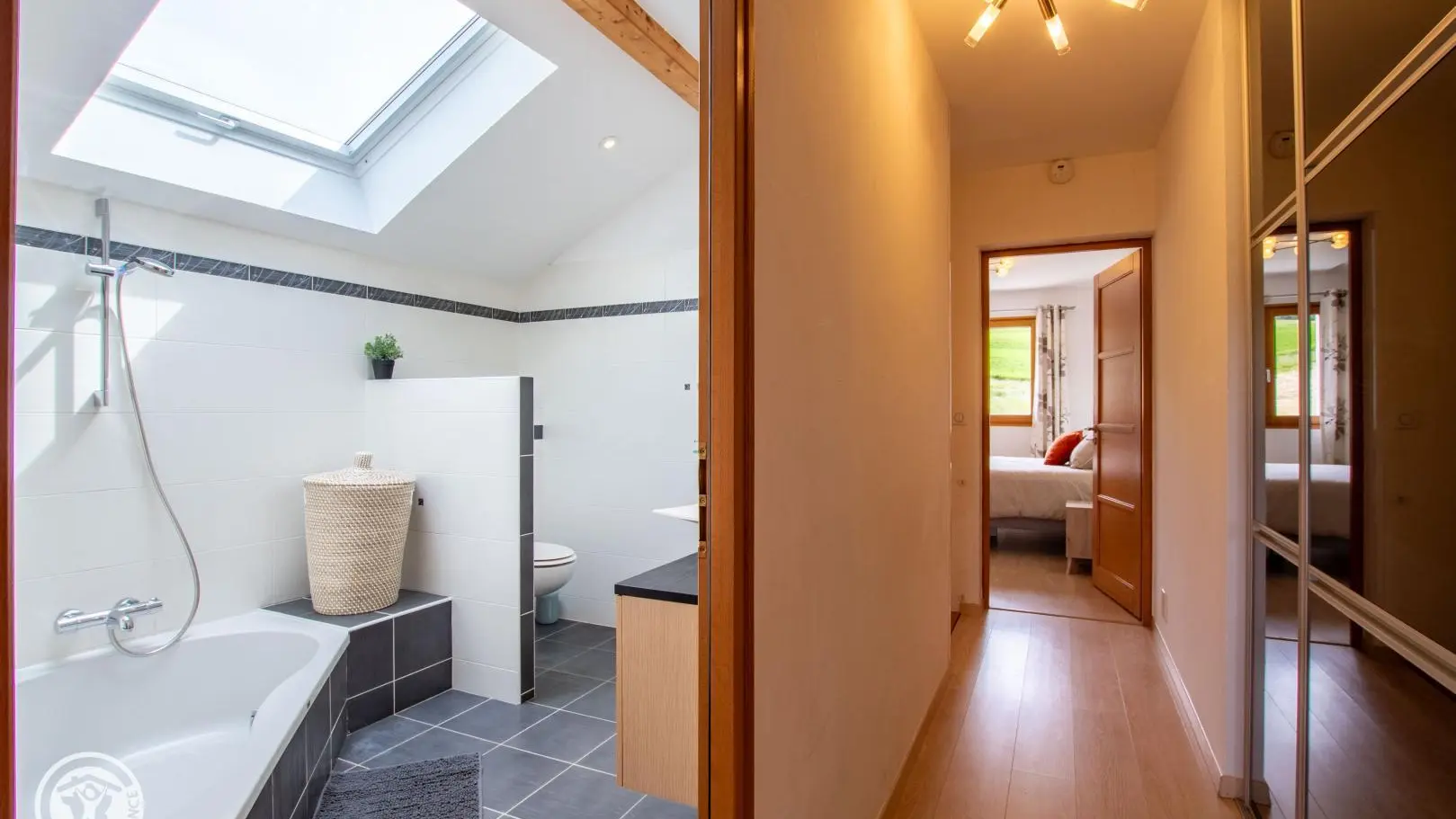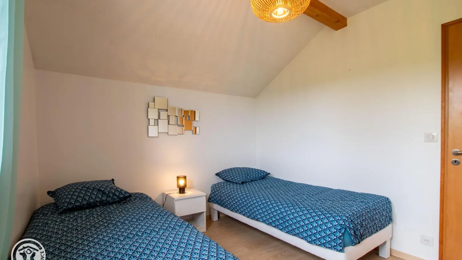 A l’étage, accès aux 3 chambres (chambre 1 : lit 160x200 cm, chambre 2 : 2 lits 80x200 cm jumelables, chambre 3 : 2 lits 90x200 cm) et à la salle de bains (baignoire, vasque sur meuble, WC).