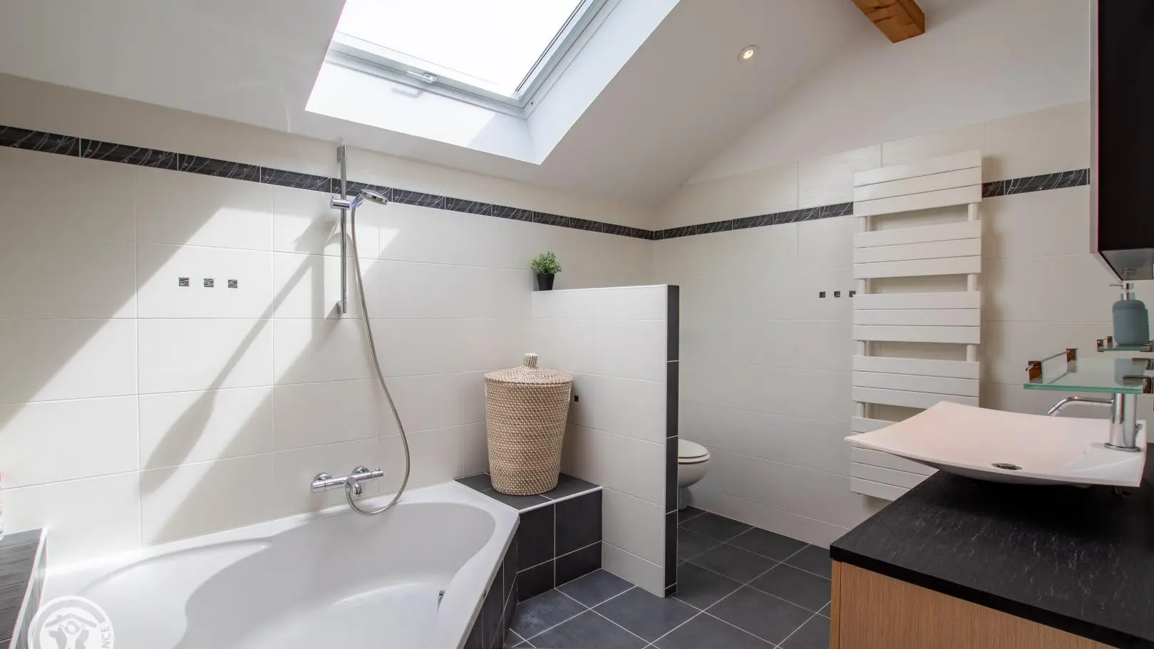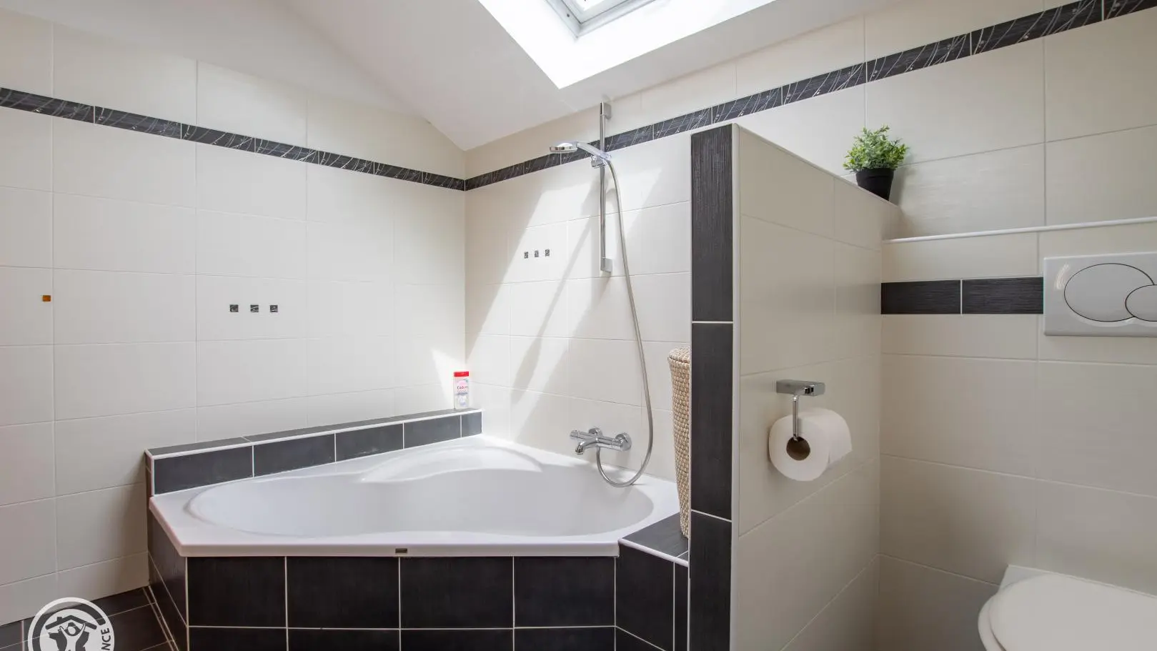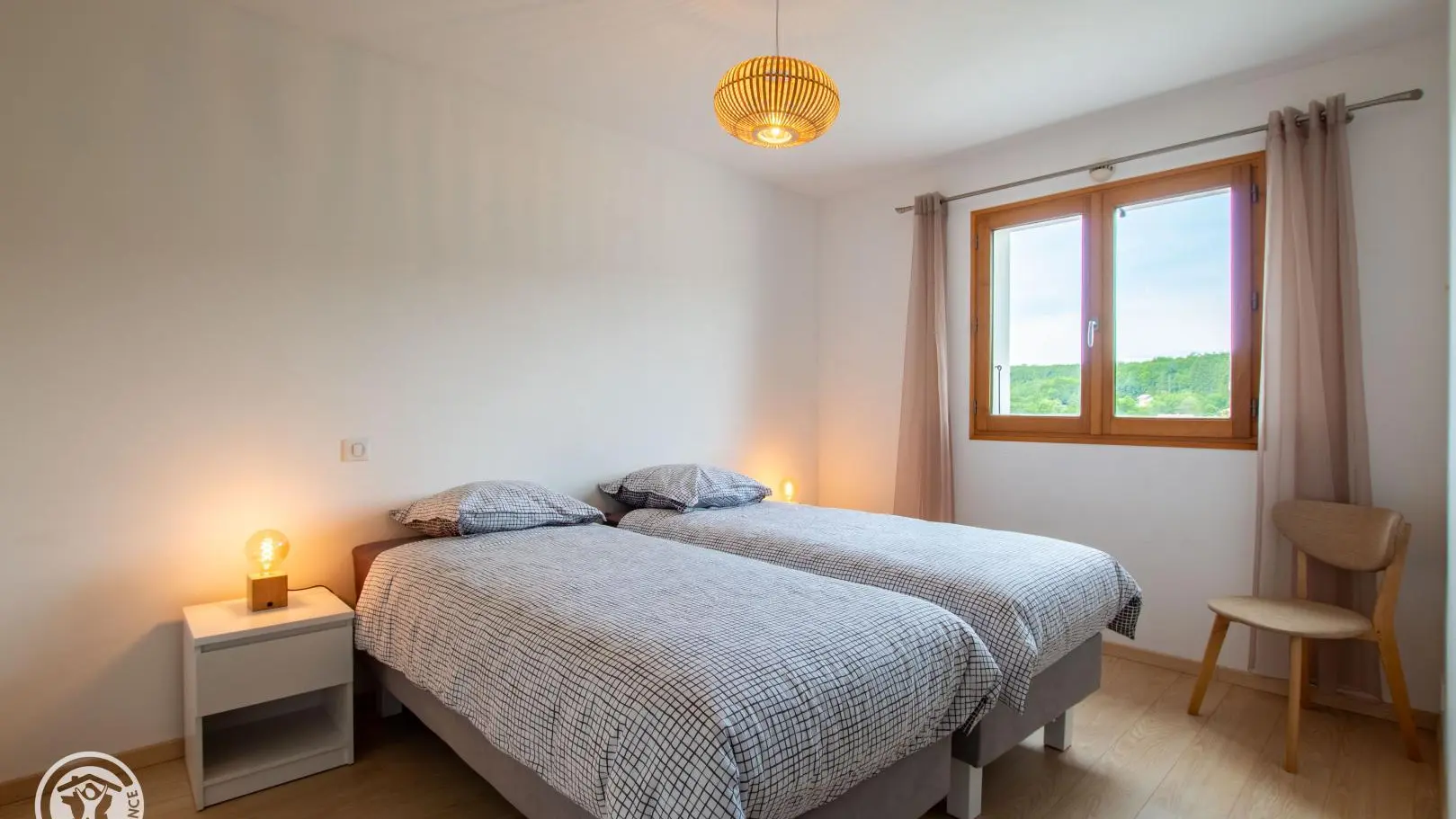 A l’étage, accès aux 3 chambres (chambre 1 : lit 160x200 cm, chambre 2 : 2 lits 80x200 cm jumelables, chambre 3 : 2 lits 90x200 cm) et à la salle de bains (baignoire, vasque sur meuble, WC).